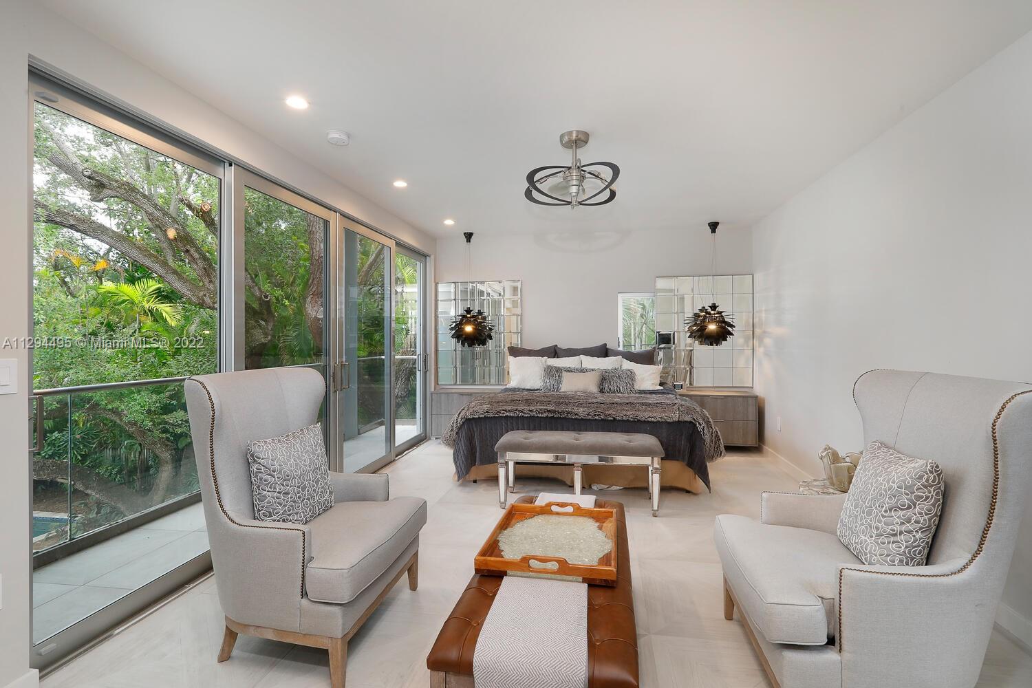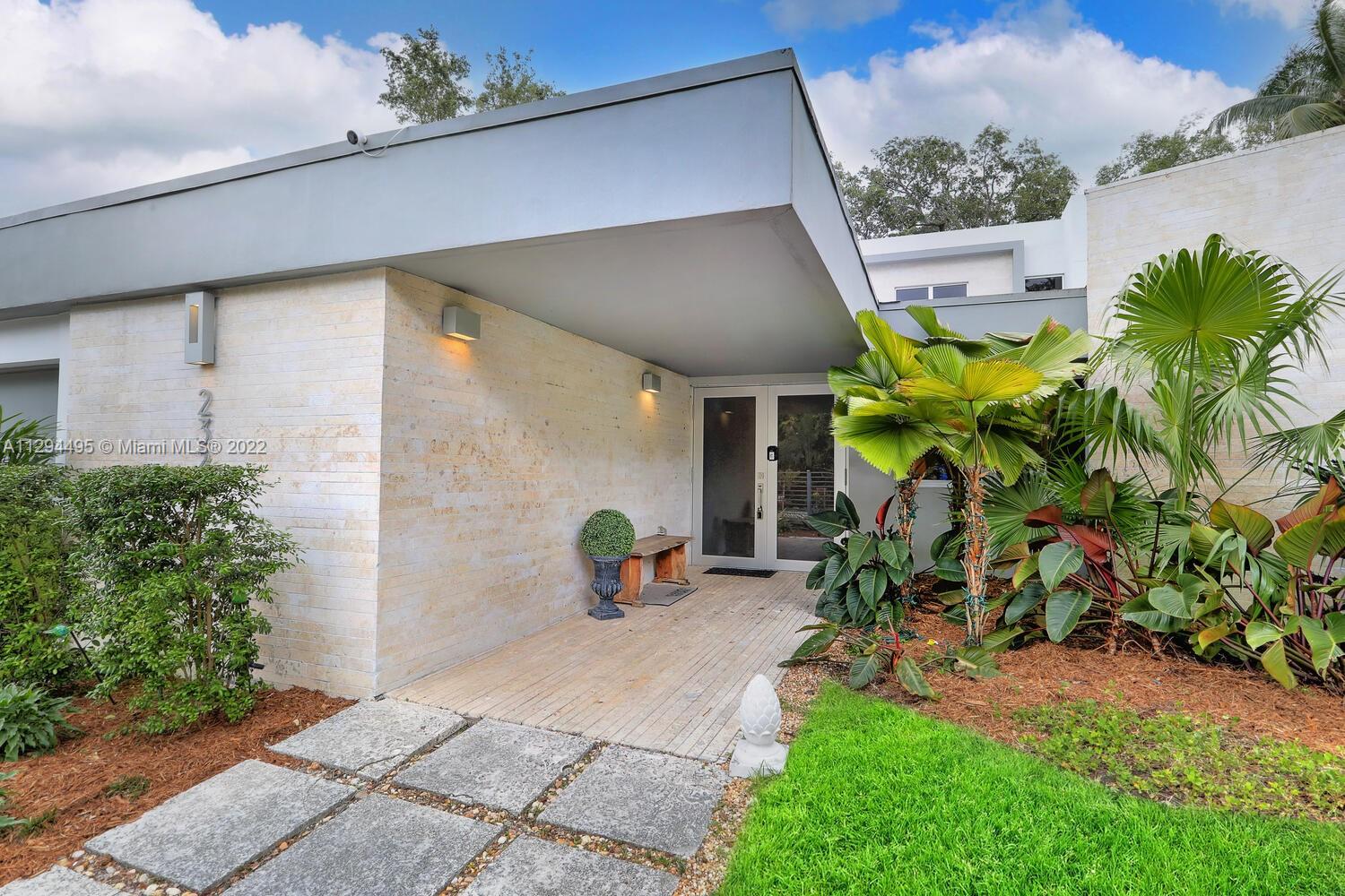 Exquisite, modern-style home in prestigious North Coconut Grove. Walk or bike to bayfront parks & marinas and to the Grove village galleries, boutiques, restaurants & sidewalk cafes. Major renovation by Kobi Karp Architecture in 2019, including a spectacular glass-enclosed wine cellar, custom built-ins and the finest fixtures & finishes throughout. 25 ft. high walls of glass provide unobstructed views from most rooms to the ultra-private tropical garden w/ magnificent Live Oaks. Unique floorplan features 2 fabulous master suites, one spanning the entire 2nd level features expansive walk-in closet, loft/office area & terrace overlooking the tree-tops. Whole house generator. 19' above sea level. Idyllic, tree-canopied pool & lounge area perfect for intimate dinners and outdoor entertaining.