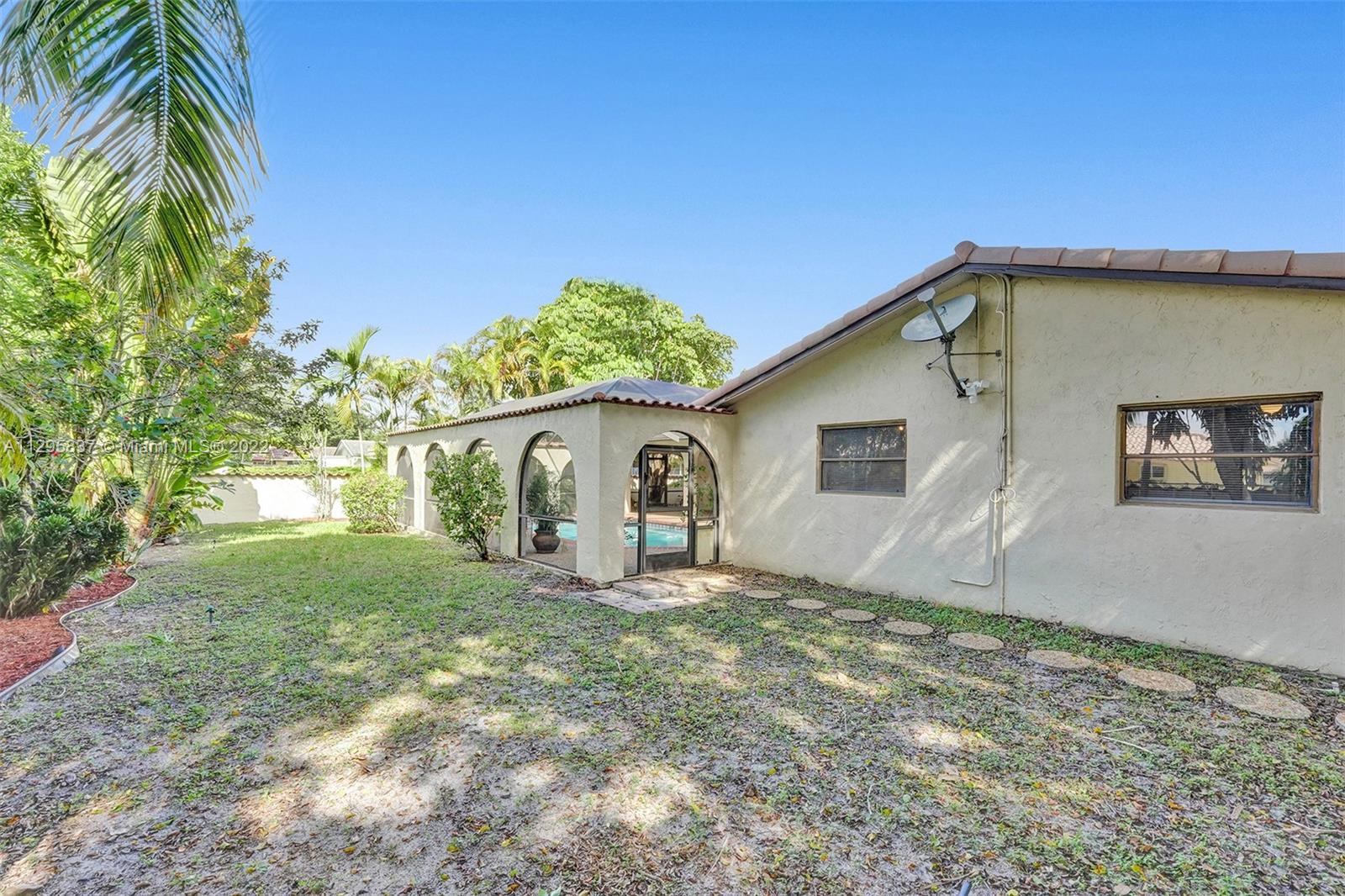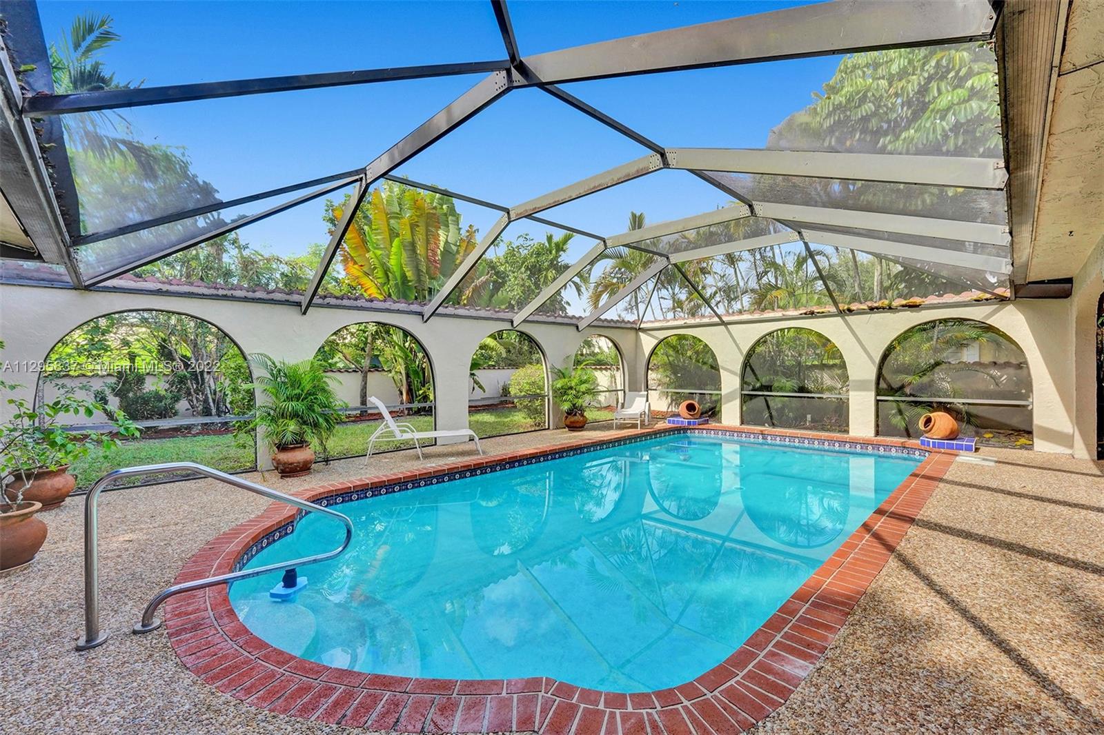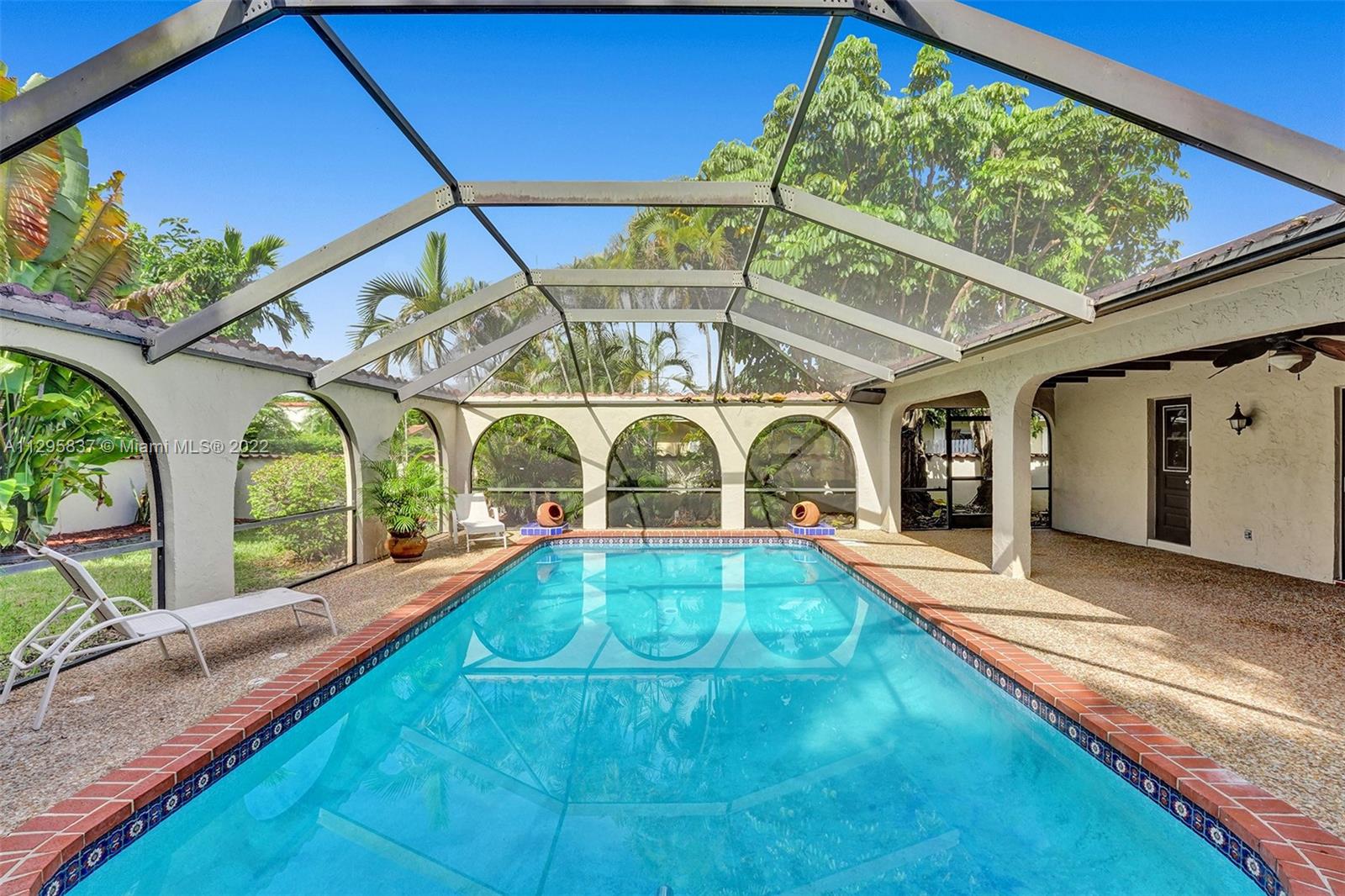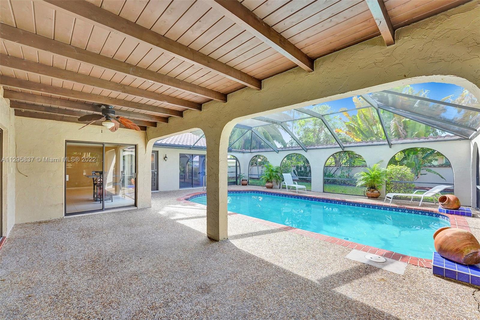 This spacious 4/2 with 2 car garage is located on a LARGE CORNER LOT & features a PEACEFUL SCREENED POOL area with ARCHED CONCRETE WALLS and a CONCRETE PRIVACY FENCE. Beautiful MODERN STYLE KITCHEN with COOKING ISLAND and STAINLESS STEEL APPLIANCES. SPLIT FLOOR PLAN with two living areas with SEPARATE SPACE FOR DINING OR OFFICE. SPACIOUS MASTER BEDROOM with walk-in closet. Master cabana bath has DUAL SINKS and a LARGE TUB/SHOWER. Guest bedrooms share a BIG CABANA BATHROOM. Kitchen and baths have RECESSED LIGHTING. FRESHLY PAINTED inside. TILE AND NEW WOOD LAMINATE FLOORS THROUGHOUT. INDOOR UTILITY/LAUNDRY ROOM WITH SINK and plenty of storage.