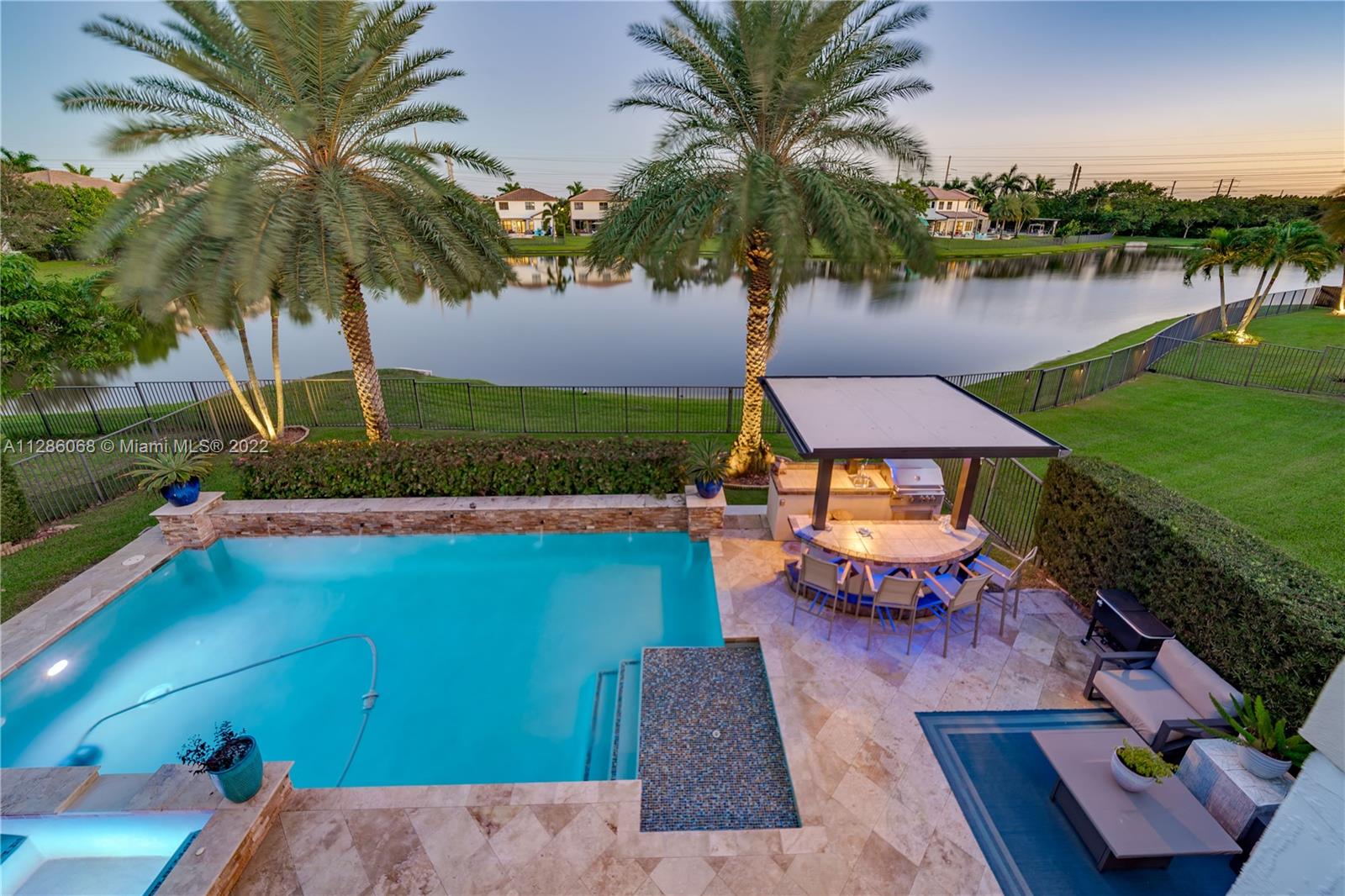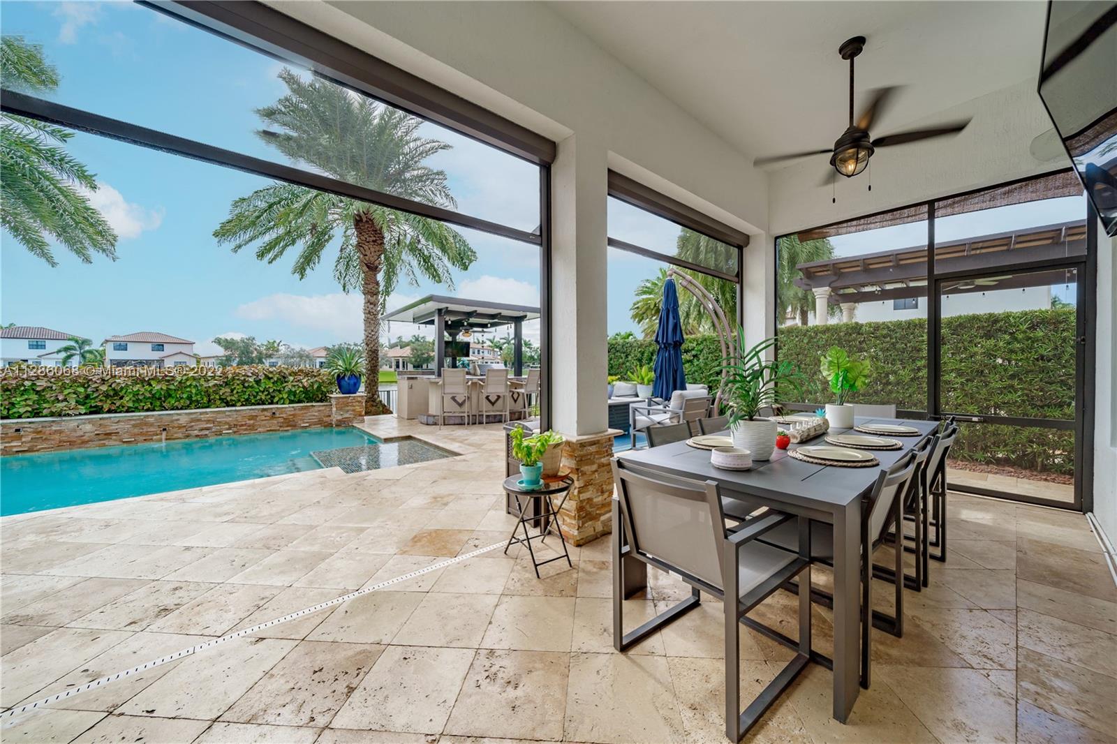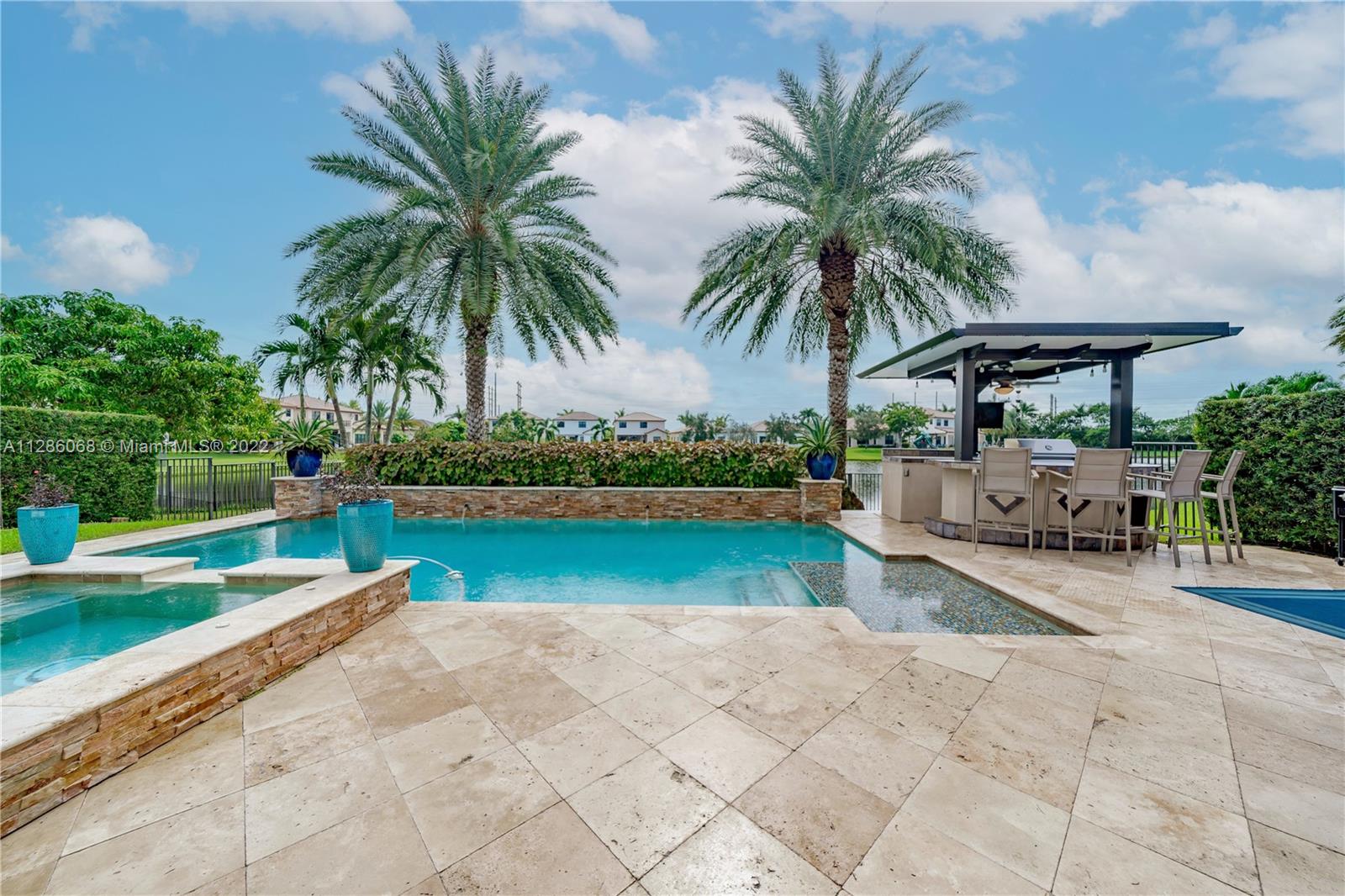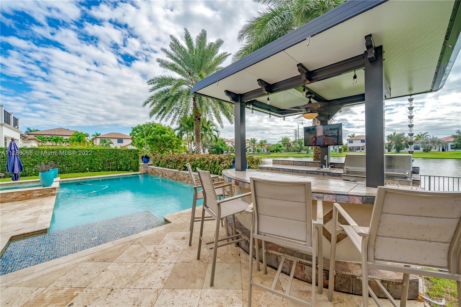 Gorgeous Lakefront home at Monterra, Cooper City’s most Luxurious Gated Community. The Tortuga Model boasts of vaulted ceilings, marble & wood floors, En-Suite downstairs & Spacious loft. Upgrades: Impact Windows/ Doors, Motorized Screen Patio, New Pool Pump with WIFI Panel, two 6 Ton AC Units, AC 3 Car Garage, Outdoor Kitchen & Bar & Remodeled Kitchen and Owner Suite Bathroom. Additional features: wired surround sound indoor/outdoor, wine fridge, plantation shutter & SWAT Mosquito Systems at rear yard perimeter with warranty. Your Oasis features a Custom Pool / Spa with a Waterfall, Outdoor Kitchen & Screened-in Patio. Community amenities: Guard Gate, Gym, Pool, Clubhouse, Tennis & Basketball Courts, Playground, Dog Park and more. A-rated schools, shopping & restaurants are nearby.