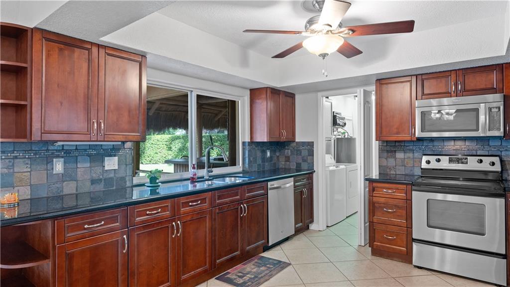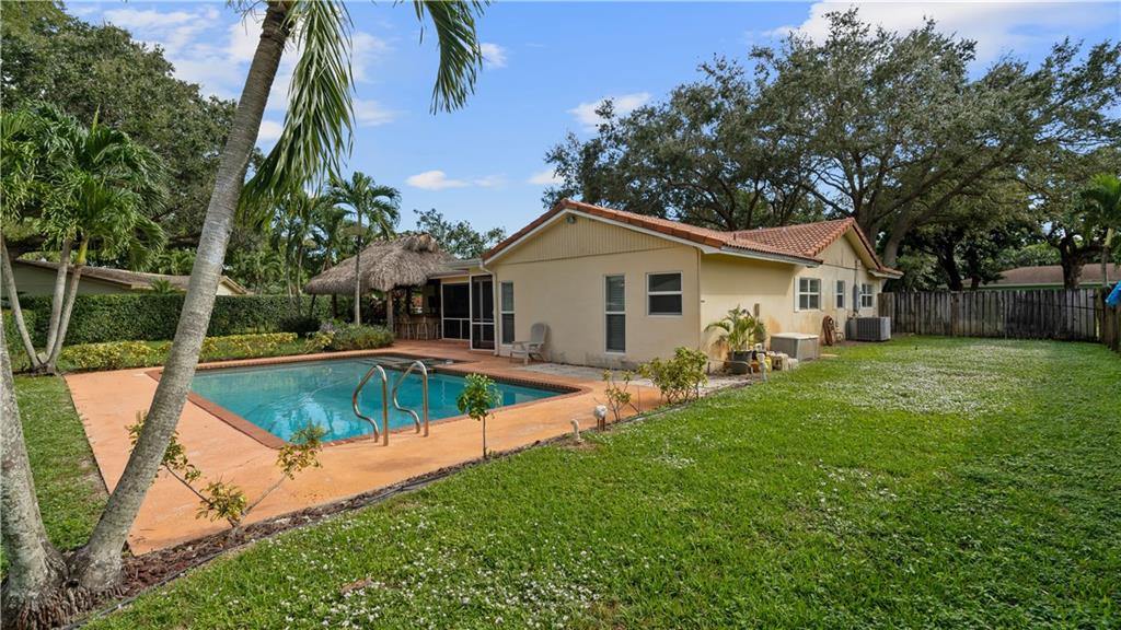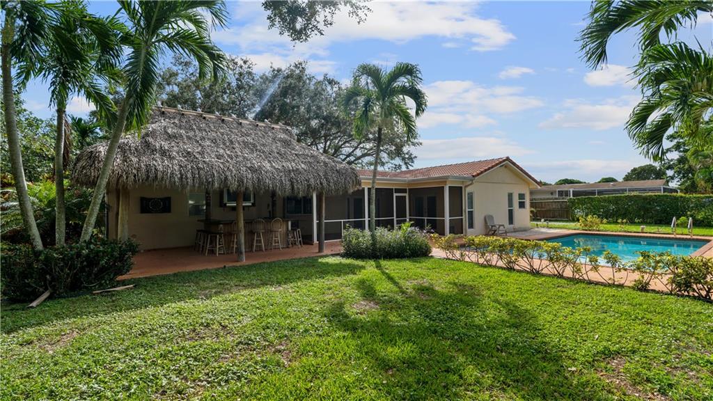 Beautiful 4/2 corner lot located in desirable Royal Palm Estates! No HOA! This house has it all. Open floor plan with lots of natural sunlight. 20"diagonal porcelain floors throughout & carpet in bedrooms. 2 car garage, remodeled bathrooms, updated kitchen with stainless steel appliances, granite countertops, natural slate backsplash, hurricane impact windows and large separate laundry room. Screened in patio leading out to your oasis! Breathe taking fenced in backyard with all your entertainment needs. Large pool with spa, Seminole built tiki hut, outdoor bar with seating for 12, tv, fridge, keg, dart board & ceiling fans. Room to store RV or up to 40ft boat. Pick from your 2 Avocado trees. Location! Location! Top schools, close to 95, 595, airport, walking distance to dog park & shopping
