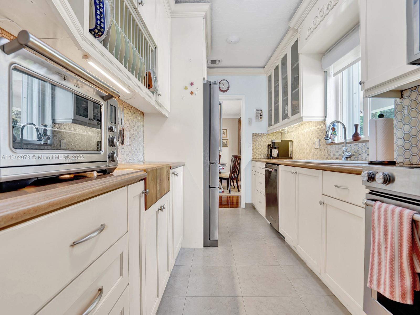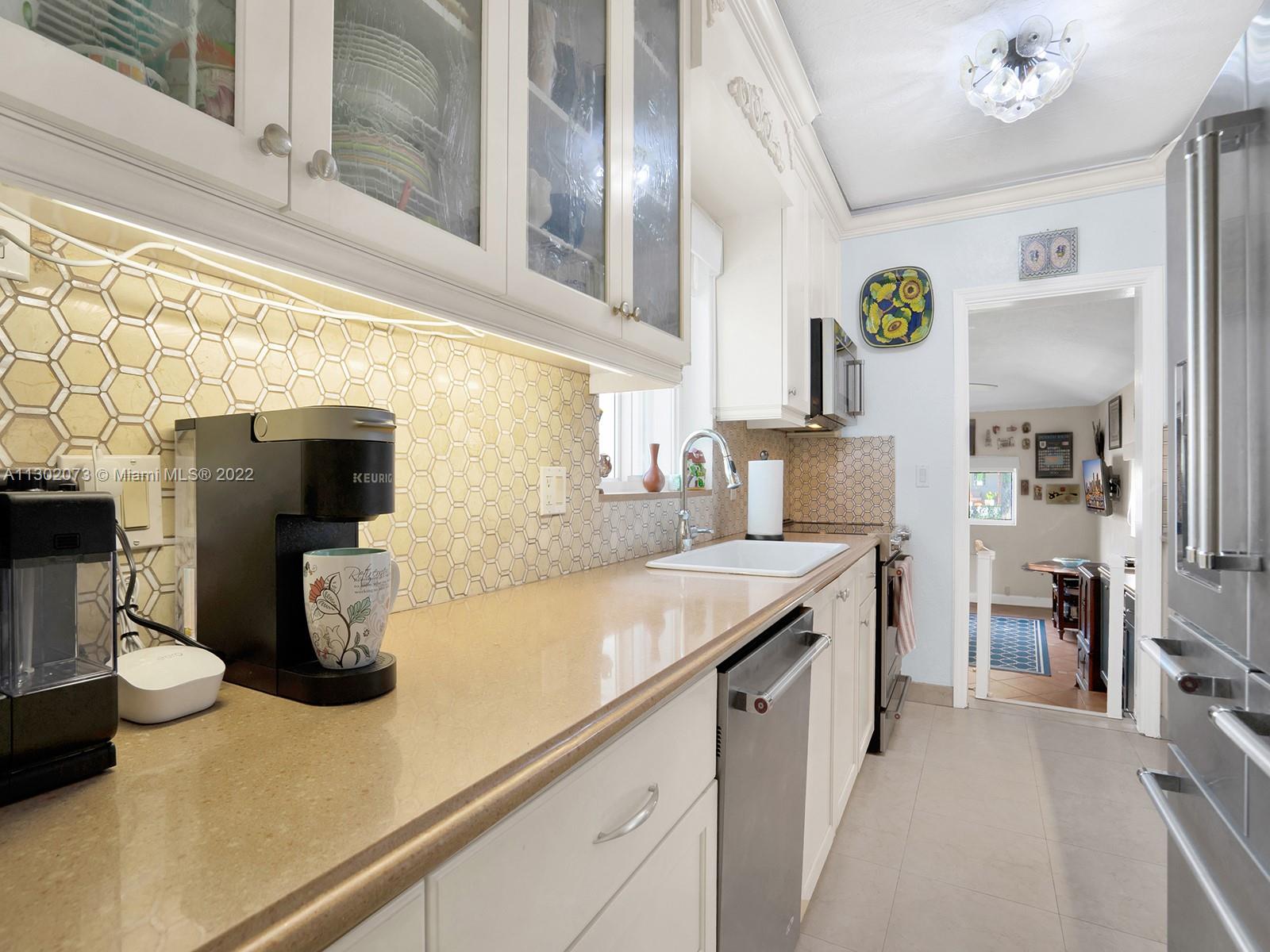 This unique Coral Gables pool home has been spaciously enlarged to a current 3 bedroom/3 bathroom split floor plan. This corner lot home sits on a 10,600 SF lot, w/ a master bedroom addition constructed in 2015. One of just 16 homes on Tangier Street, between Venetia and Milan, property is just north of the Granada Golf Course. Entry leads you to the living-dining area that overlooks the backyard patio/pool area. Pool was built in 2022 w/ a natural stone floor layout & features a salt-chlorinator & LED lighting. Master bedroom has a sitting area & custom closet. 2nd bedroom has a full bathroom. Galley kitchen leads to a spacious family room that has access to the backyard & covered path to laundry room/garage. Impact/window protection w/doors throughout. MOVE IN CONDITION.