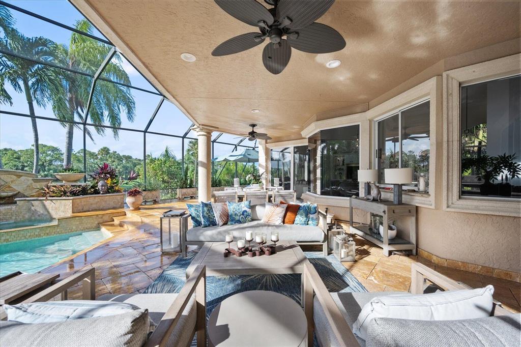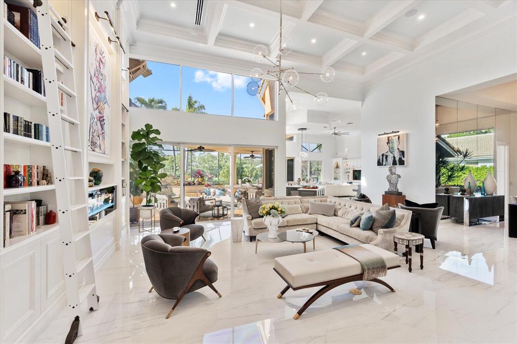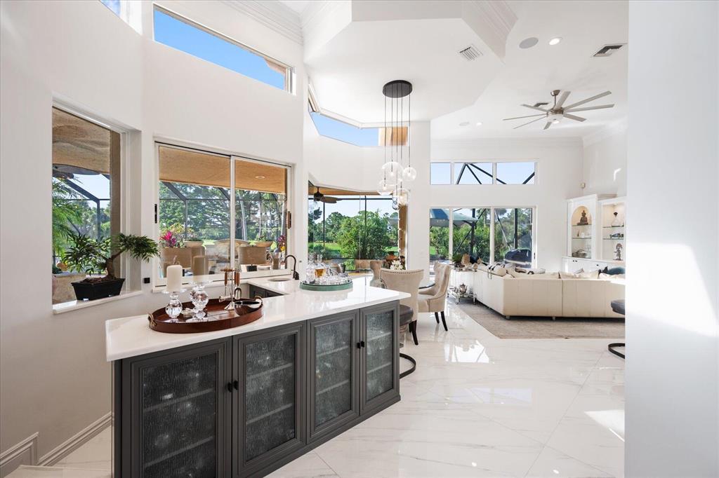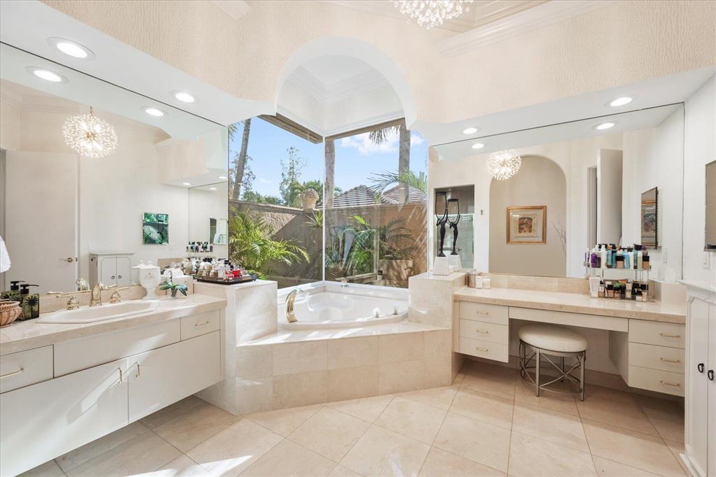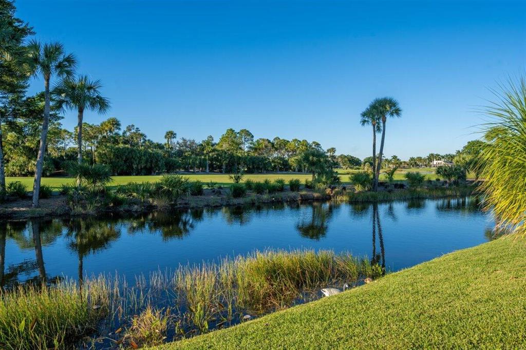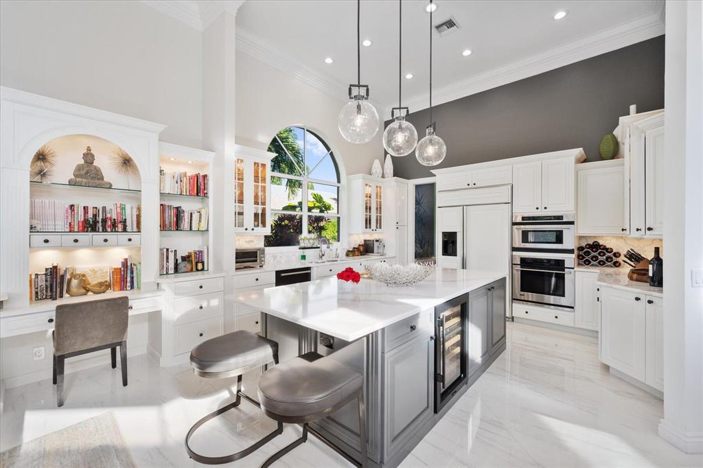 One of a kind expansive views of water & 13th and 14th fairways along Breakers Rees Jones course in Breakers West! This lovely custom home offers 3 Bedrooms with ensuite Baths + beautiful Office/Library, and 2 car + golf cart garage. Designer-renovated over the past 18 months, updates include gorgeous oversized porcelain flooring in main living areas, wood flooring in bedrooms/office, extensive millwork including coffered box ceilings and floor-to-ceiling bookcases with fireplace in Living Room. Sophisticated Restoration Hardware chandeliers and wall sconces elevate the lighting throughout. The chef's kitchen is a stand-out with its grey & white backsplash, white quartz countertops and lg center island with new Wolf cooktop w/downdraft, wine refrig and counter seating.