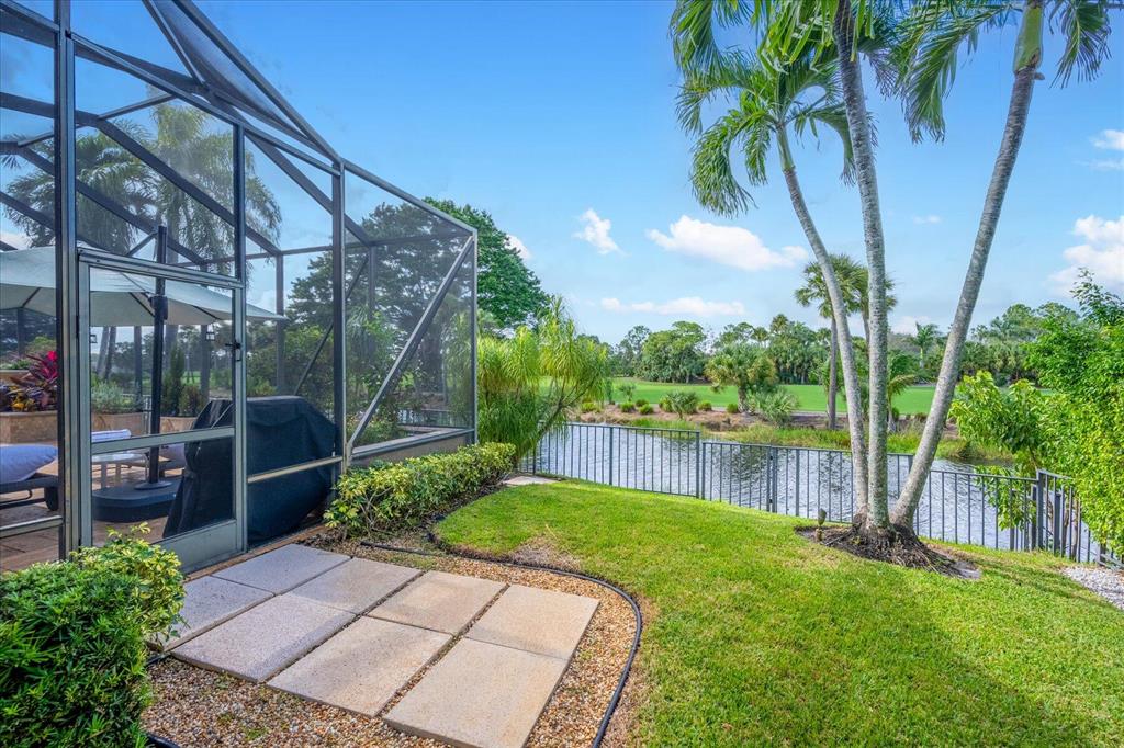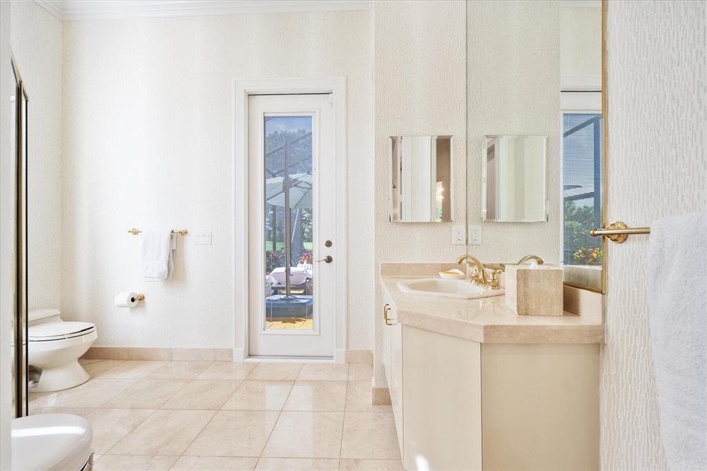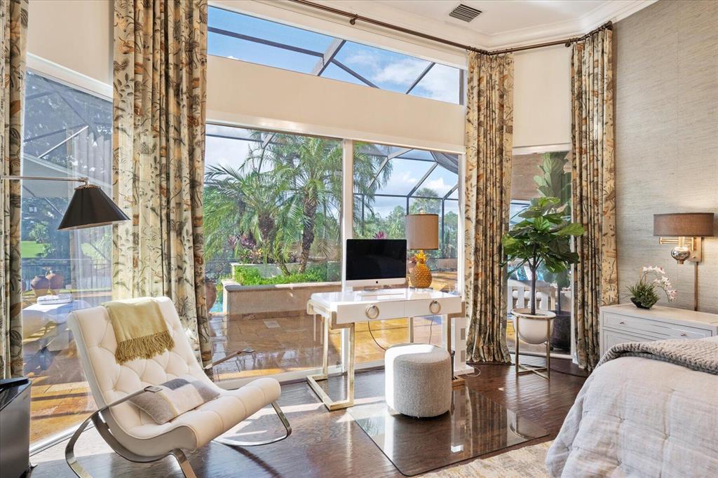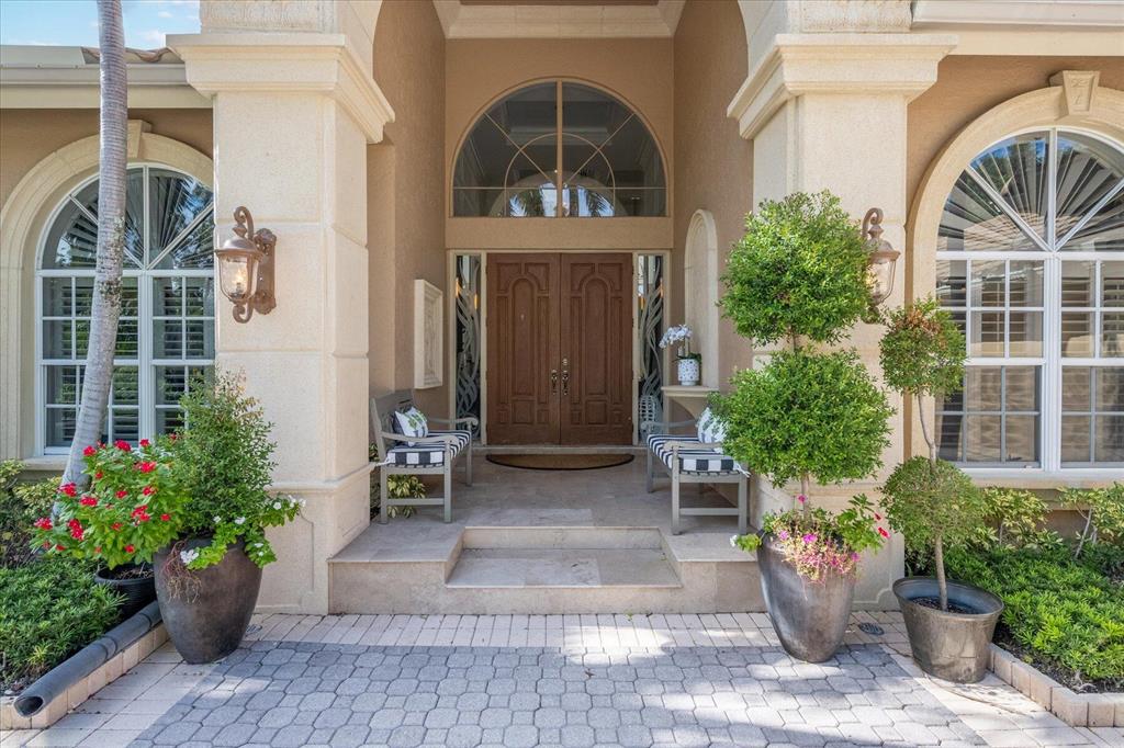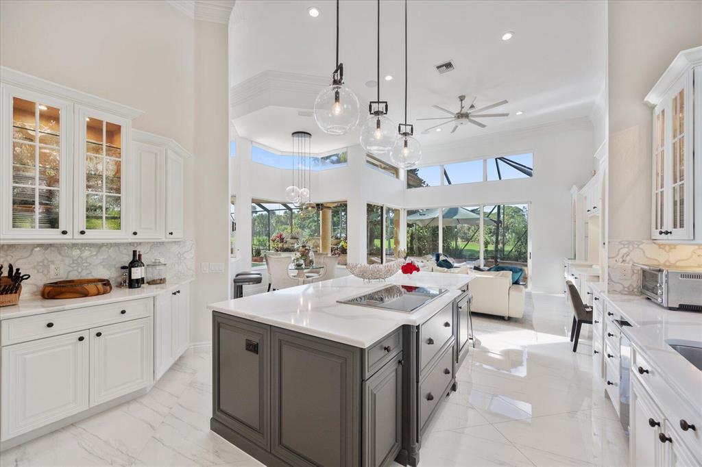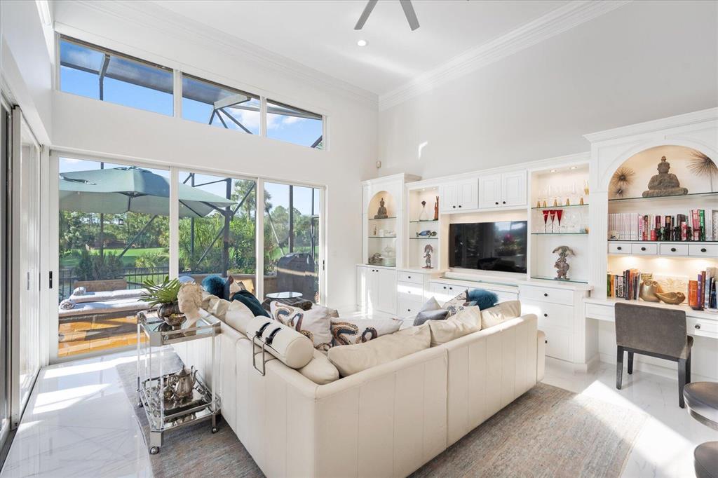 One of a kind expansive views of water & 13th and 14th fairways along Breakers Rees Jones course in Breakers West! This lovely custom home offers 3 Bedrooms with ensuite Baths + beautiful Office/Library, and 2 car + golf cart garage. Designer-renovated over the past 18 months, updates include gorgeous oversized porcelain flooring in main living areas, wood flooring in bedrooms/office, extensive millwork including coffered box ceilings and floor-to-ceiling bookcases with fireplace in Living Room. Sophisticated Restoration Hardware chandeliers and wall sconces elevate the lighting throughout. The chef's kitchen is a stand-out with its grey & white backsplash, white quartz countertops and lg center island with new Wolf cooktop w/downdraft, wine refrig and counter seating.
