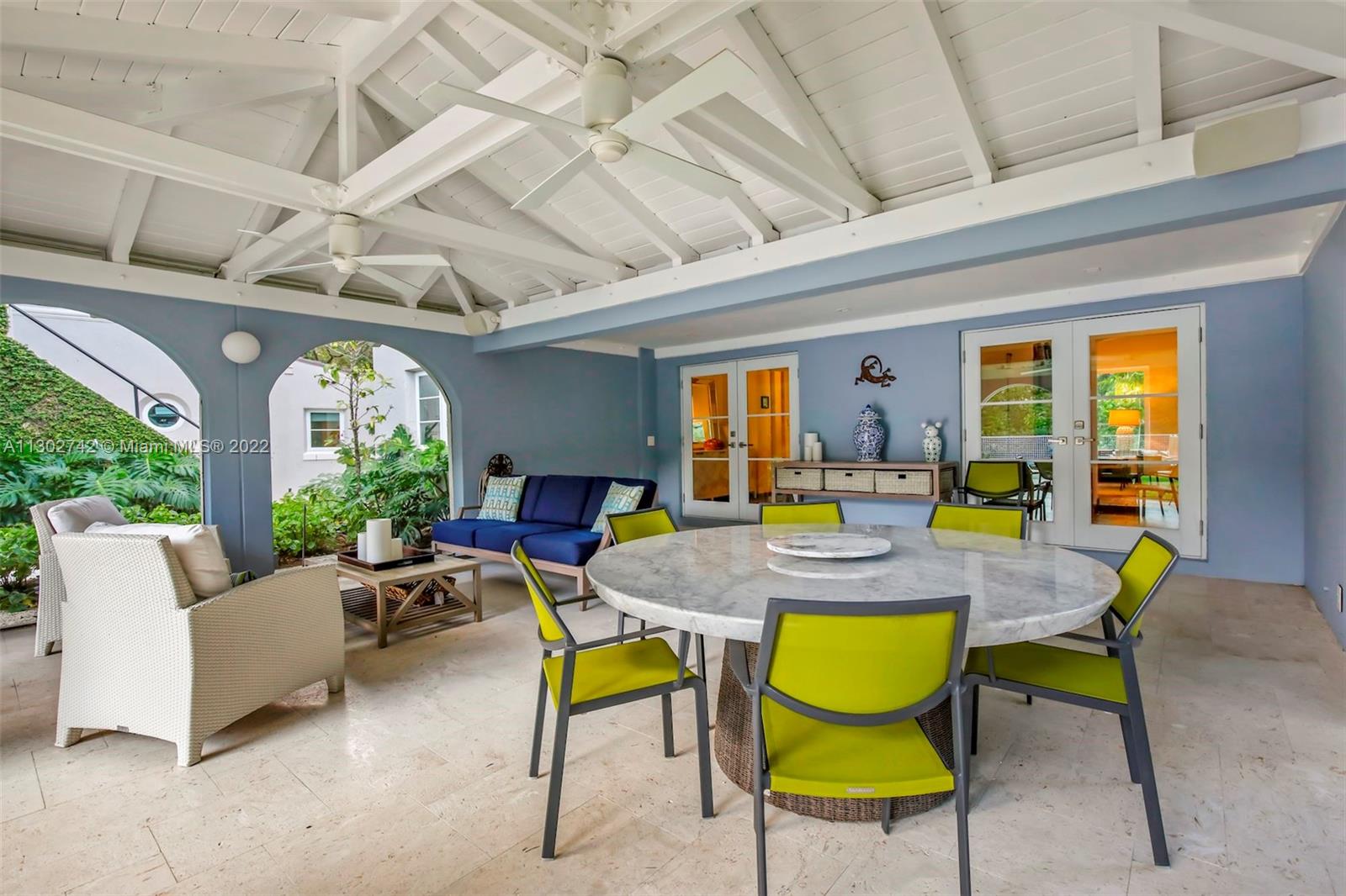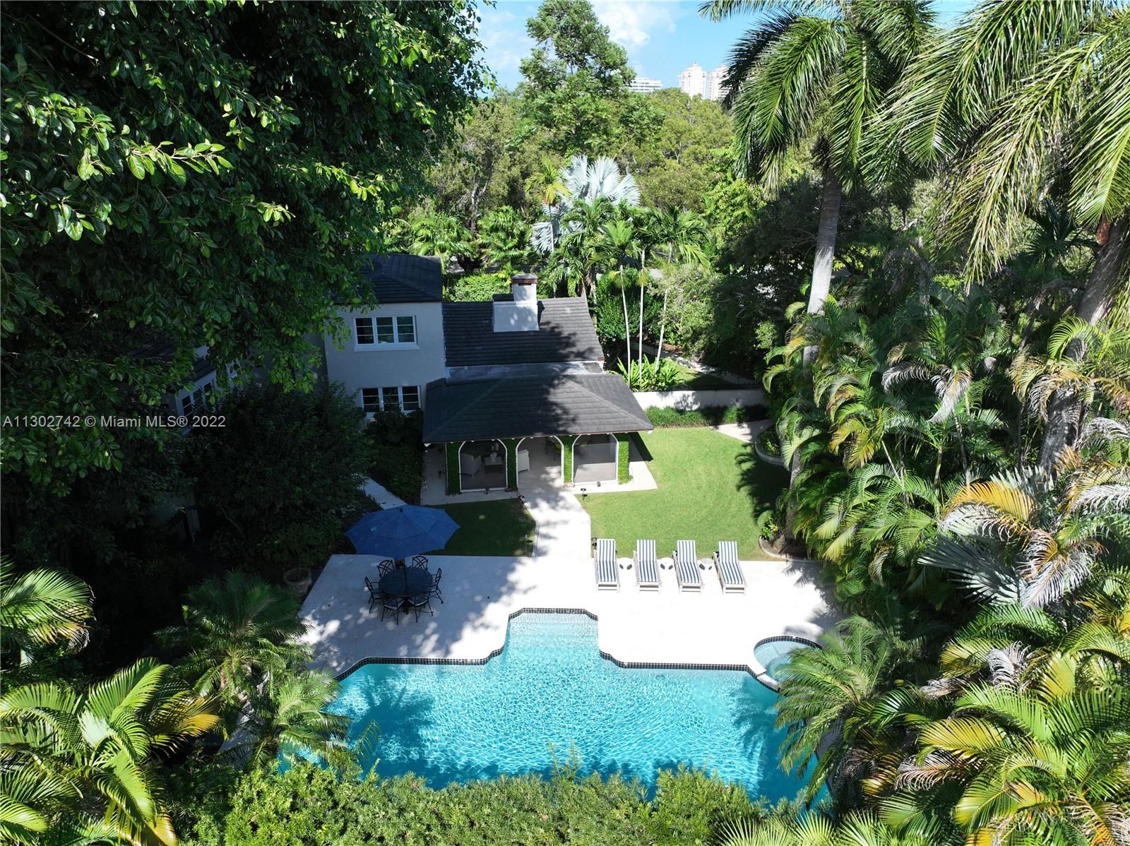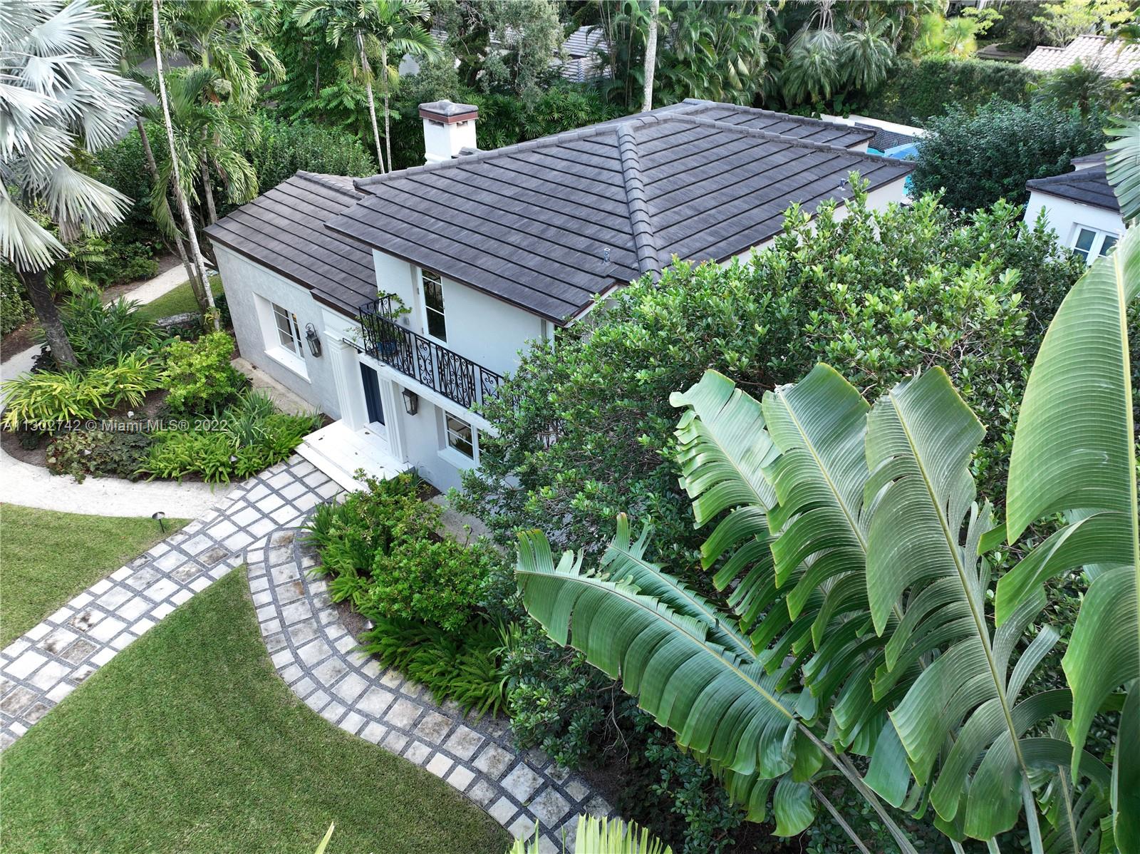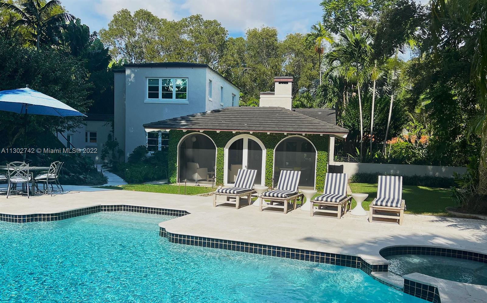 One of a kind 1925 Spanish style home located in the Golden Triangle of Coral Gables beckons you inside. The stately front door welcomes you into a beautifully designed living room with original cypress vaulted ceilings & stone fireplace. This elegant property contains 4 bedrooms & 3.5 baths including a private guest house. The gourmet kitchen features the finest Miele appliances with Calacatta marble countertops & Cuban tiled floors. Bathroom upgrades include new lighting, fixtures & marble mosaics. You will be swept away by the home's screened-in covered patio that leads to a lush landscaped pool area containing exquisite 100+ year old Banyan trees. New Japanese Glazed ceramic tiles & shell reef stone surrounds the entire pool area. Conveniently located. This home is a must see.