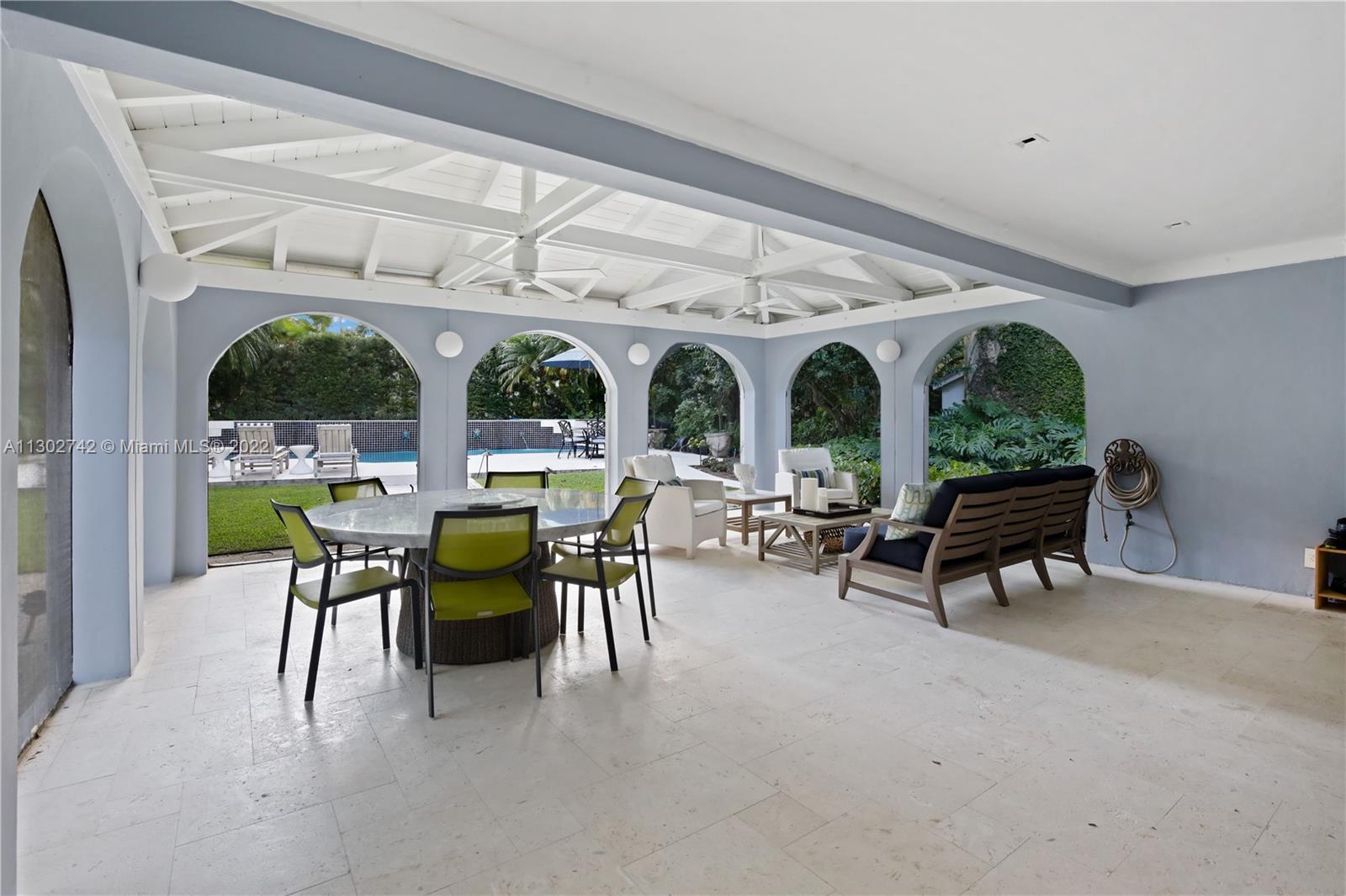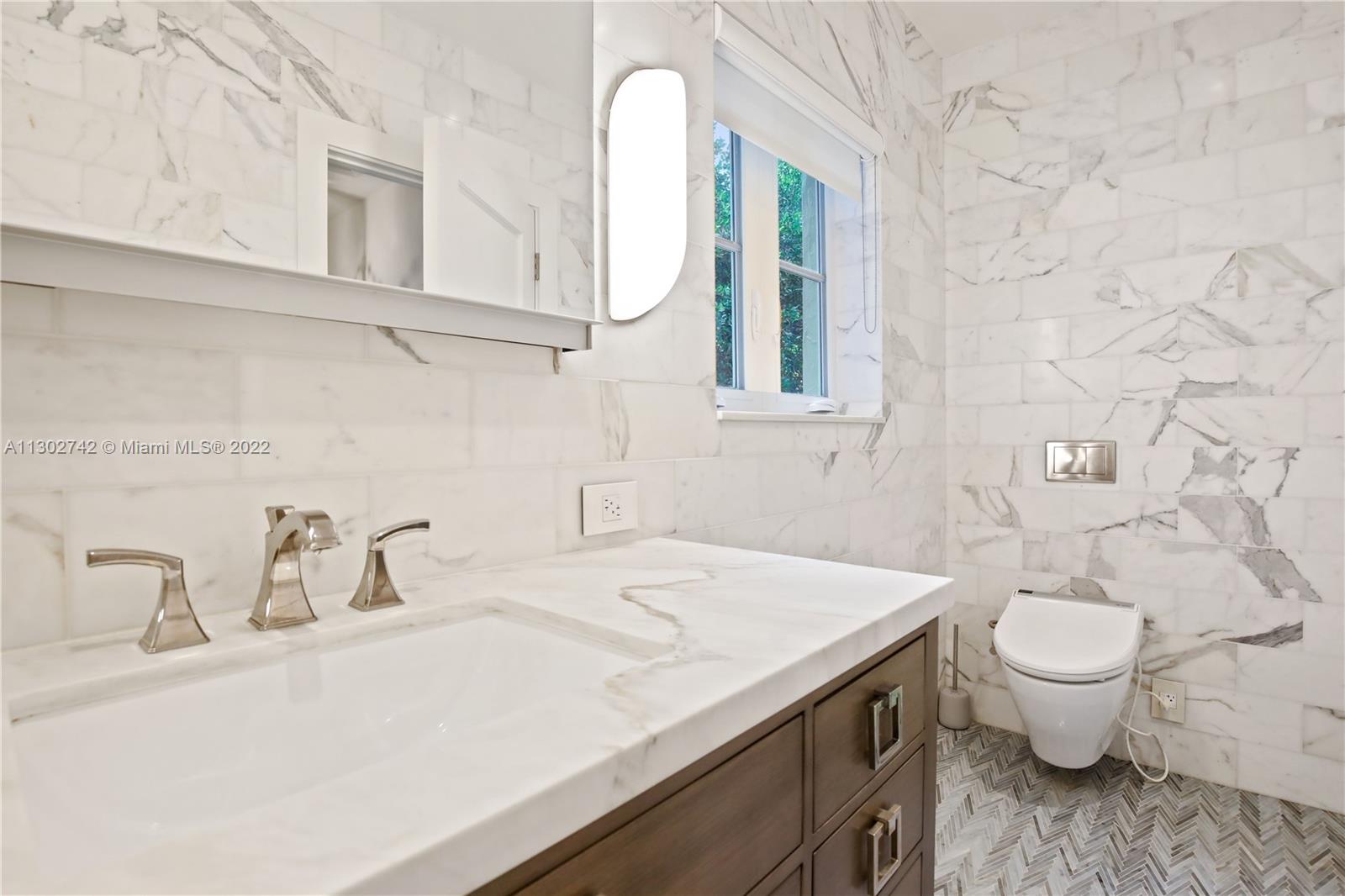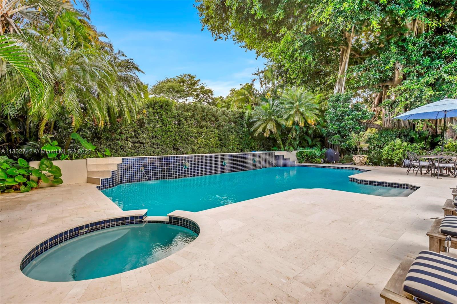 One of a kind 1925 Spanish style home located in the Golden Triangle of Coral Gables beckons you inside. The stately front door welcomes you into a beautifully designed living room with original cypress vaulted ceilings & stone fireplace. This elegant property contains 4 bedrooms & 3.5 baths including a private guest house. The gourmet kitchen features the finest Miele appliances with Calacatta marble countertops & Cuban tiled floors. Bathroom upgrades include new lighting, fixtures & marble mosaics. You will be swept away by the home's screened-in covered patio that leads to a lush landscaped pool area containing exquisite 100+ year old Banyan trees. New Japanese Glazed ceramic tiles & shell reef stone surrounds the entire pool area. Conveniently located. This home is a must see.