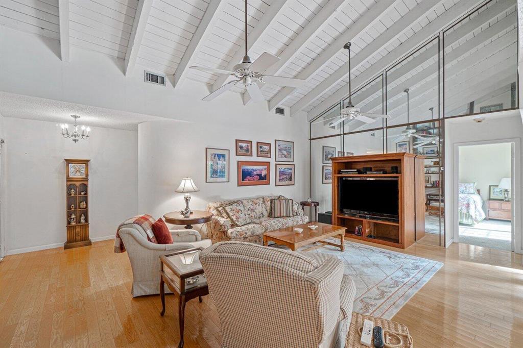 Price Improvement! Very charming home in the sought after community of The Greens of Emerald Hills. Enter the living room with open beam, wood, vaulted ceiling, accompanied by the awesome built in bookshelf with rolling ladder ( it's 15 ft tall!) The floors are hard wood, in the liv rm - tile in kitchen and new carpet in master. The private pool/patio area has lush landscaping, brick pavers and an awning for shade. plus a side sitting area - great for entertaining and great views from the kitchen and fam room. All the sliders and kitchen window are impact, there are shutters for the other 4 openings. This house is NOT updated, but has been well maintained by owner of 22 years. Motivated seller.