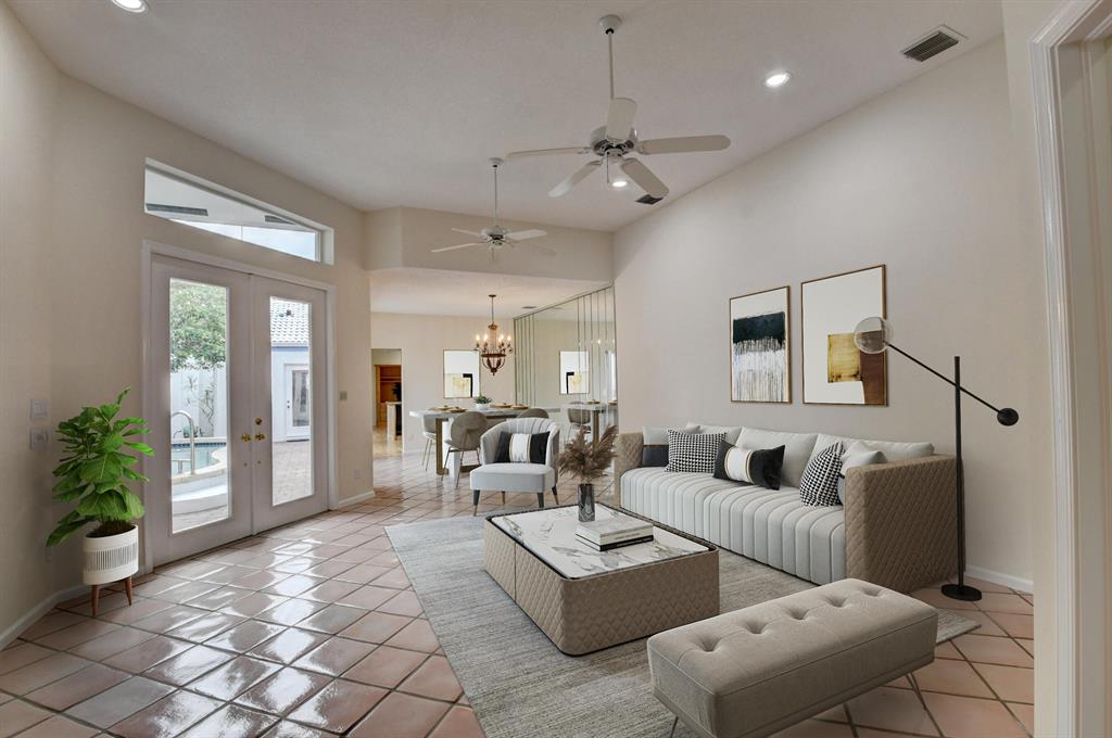 Enjoy a great Florida lifestyle in this stunning courtyard pool home. The rooms flow from the elegant foyer to the spacious living & dining room w/ cathedral ceilings that lead out to the resort style pool & patio. Master suite has walk-in closets & seating area w/ access to courtyard pool & patio. The master bath boasts two vanities, a large linen closet, shower stall & Roman tub. Chef's kitchen features granite counter tops, lots of cabinets & a breakfast bar. This stunning property features a family room, an office with built-ins, sunny guest room, stylish guest bath, & laundry w/ cabana bath. You'll relish the back patio w/sunset vistas & water views. Pet friendly. Low HOA. Mykonos is zoned for top-rated public schools, short drive to private schools & universities.