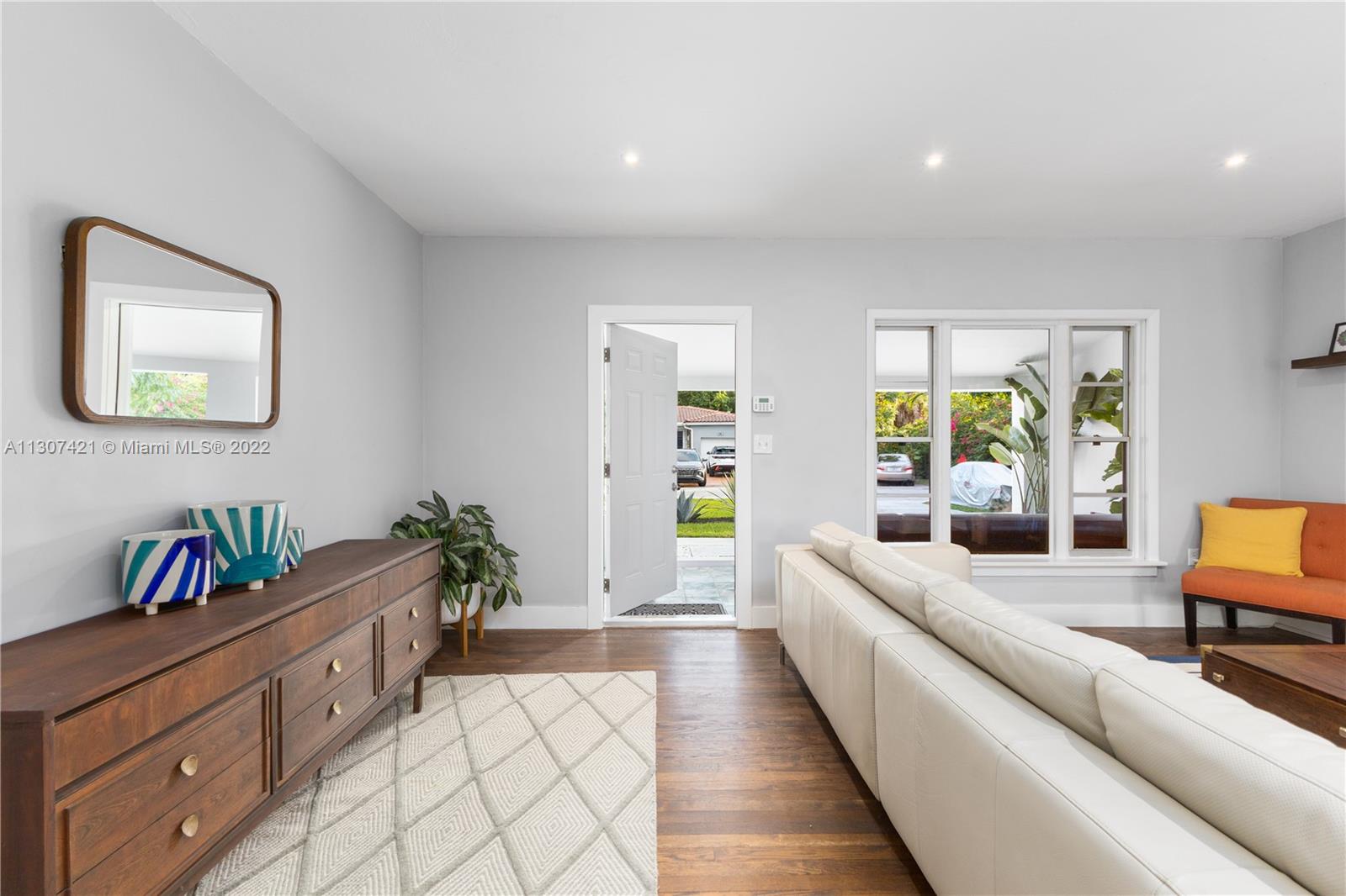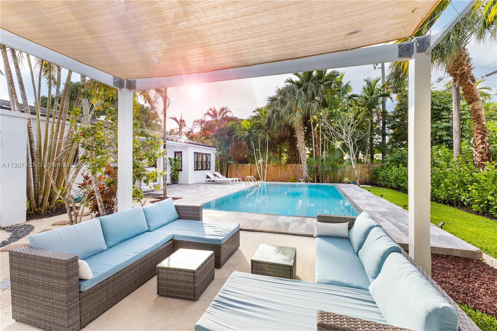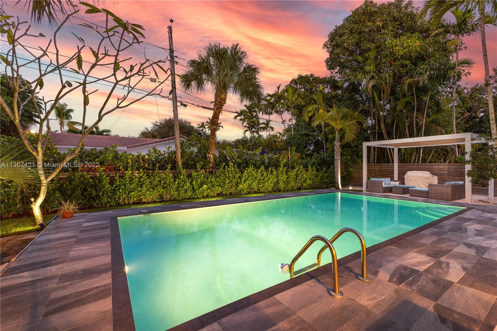 Miami Shores pool home, tastefully re-imagined to fully embrace contemporary Florida living. This home features a new metal roof, septic system, AC , updated plumbing and a modern circular driveway. Hardwood floors in the living room and bedrooms, original fireplace, expansive front porch with cuban tile floors. Newly remodeled baths and kitchen with quartz countertops and counter eating area. Open concept with french doors leading out to the totally redesigned pool area with modern decking, 'sandy beach" areas and a shaded area perfect for your poolside dining table. Enclosed Florida room on the back of the home with pool views, great for a family room or dining room. The original garage has been converted with 1380 sqft total under air Could be used as an office/media room or bedroom.
