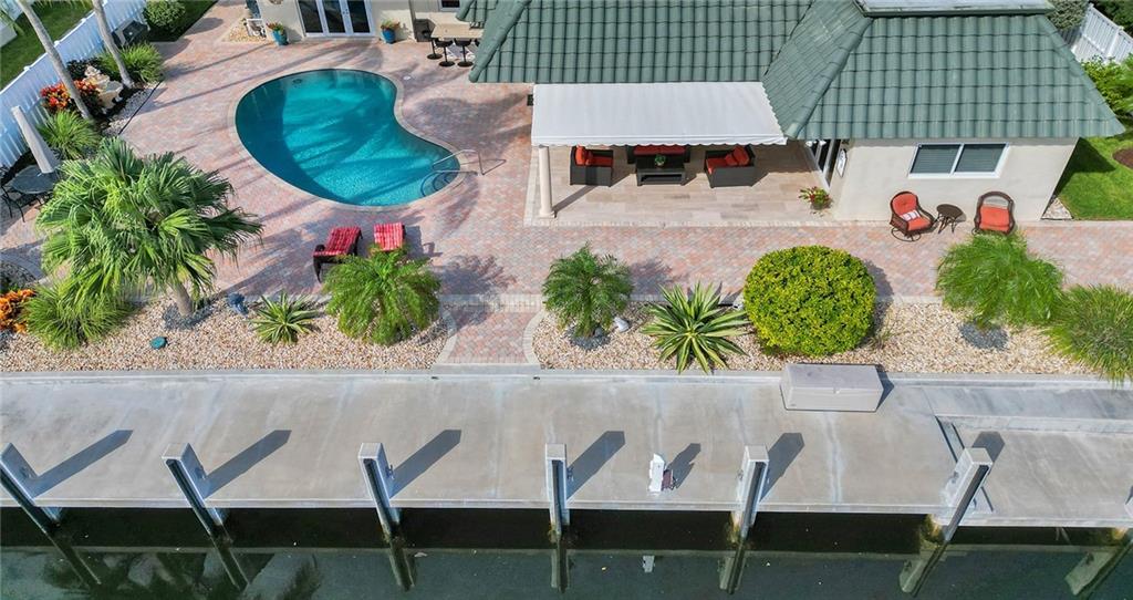 Live the waterfront dream with this single story pool home on 93' of Deepwater (No Fixed Bridges!) on a protected canal in The Landings neighborhood. Recent renovations include new roof in 2020 and new concrete dock and raised seawall in 2021. Hurricane impact windows and doors, new AC and remodeled saltwater and heated pool. Recent kitchen refresh includes brand new counters and new appliances. Incredible backyard with covered porch-enjoy the East facing backyard for all day breeze and morning Sun. Split bedroom plan, indoor laundry and spacious 2 car garage with new epoxy floors. Master suite offers large bath and nice closets. Two living spaces including family room/eat in space off kitchen. 4th bedroom is currently used as office with no closet.