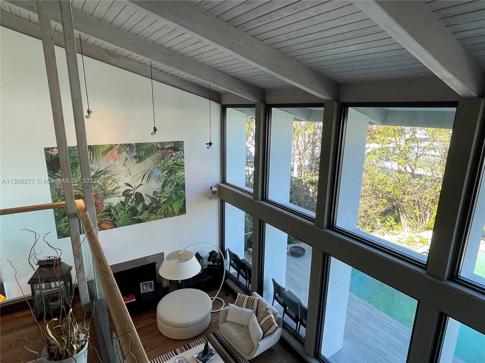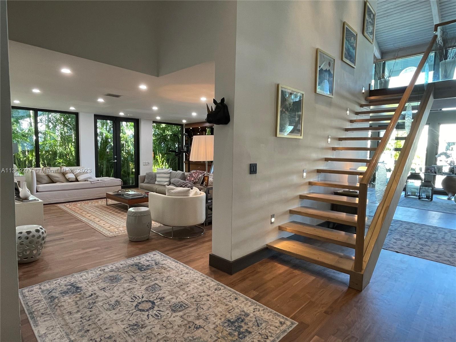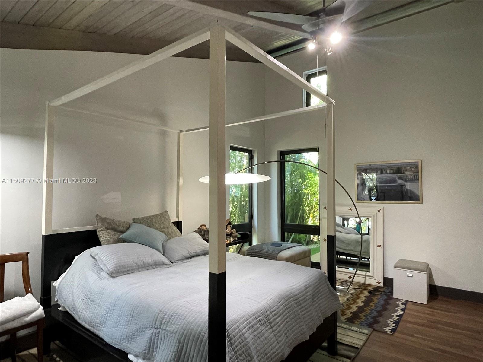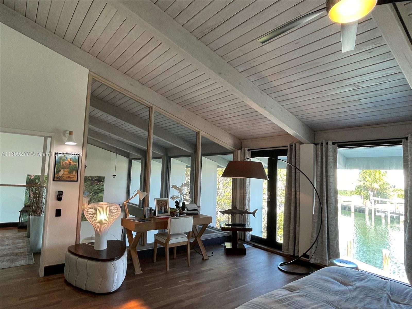 Contemporary waterfront home in Sans Souci Estates designed by renowned architect Barry Sugarman. This unique property is surrounded by lush, tropical landscaping featuring a unique Gumbo Limbo tree, which is the heart of the property. Walnut wood floors, vaulted wood ceilings, Italian-made kitchen with quartz countertops. Improvements include All-new impact windows, new roof, onyx master bath. Truly a boater’s paradise with 88ft of water frontage with easy access to Biscayne Bay & Atlantic Ocean. Spacious deck and high-capacity boat lift. Bedroom 4 converted into Den/studio, can be easily converted as original bedroom.
