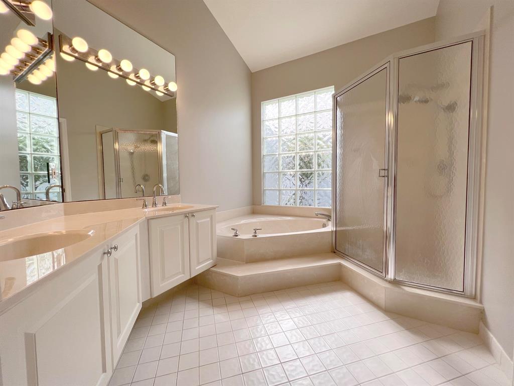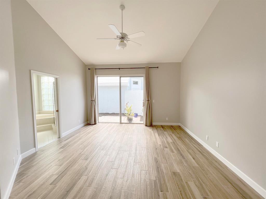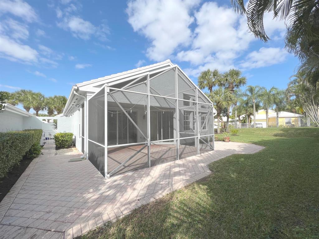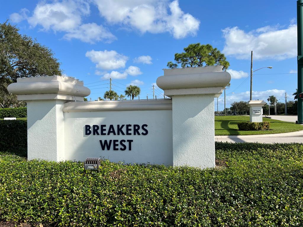 This unique corner property is located in sought-after gated community of Breakers West in West Palm Beach, on large corner lot. Single story 2BR +OFFICE/3rd BR, 2.5 BA with vaulted ceilings & plenty of windows provide lots of natural light. Kitchen with stainless steel appliances opens to dining room, family room & screened patio. Master Bedroom has vaulted ceiling & large newly designed walk-in closet. Second bedroom has vaulted ceilings, ensuite bath and walk-in closet. Screened brick paver patio overlooks the oversized fenced lot. Roof replaced in 2008, hurricane panels, AC 2017, WH replaced 2020, Washer and Dryer 2020. HOA includes landscaping (front & back yard), annual roof and driveway cleaning, alarm monitoring, 24 hr guard operated gate and common area maintenance.