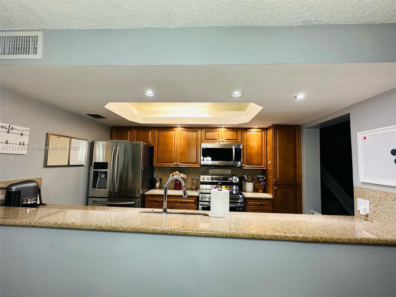Beautiful 3 bedroom, 2 bathroom unit in the well desired community of Villas Central in Pembroke Pines. This Corner Unit overlooks the Golf Course and Lake for the perfect views year round. Property features: a custom kitchen with stainless steel appliances including a double oven, new dishwasher & microwave, granite counter tops, dark wood laminate flooring on the upper level, tiled on the first level, split floor plan, vaulted ceilings, washer/dryer 2 years old, new water heater, AC only 5 years old and much more. Won't last! Security system does not convey