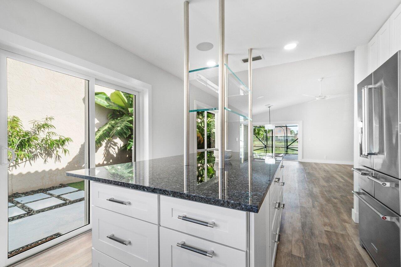 This waterfront, renovated house is spectacular. An open concept design, modern finishes, and gorgeous lake views are focal points of the home. The spacious living room has volume ceilings and flows directly into the dining space for a seamless transition. An updated kitchen offers new stainless steel appliances, an island with custom glass shelves, and plenty of storage. The oversized screened-in patio is the perfect setting to enjoy the peaceful lake views. The primary suite has a large walk-in closet and sliding glass doors to the screened-in patio. The primary bathroom features dual sinks and an eye-catching freestanding tub. Two additional bedrooms share a renovated bathroom. An additional benefit to this home is the full hurricane protection with impact glass windows and doors. The