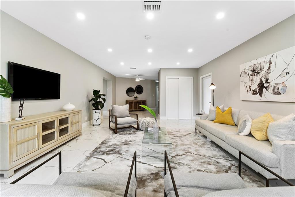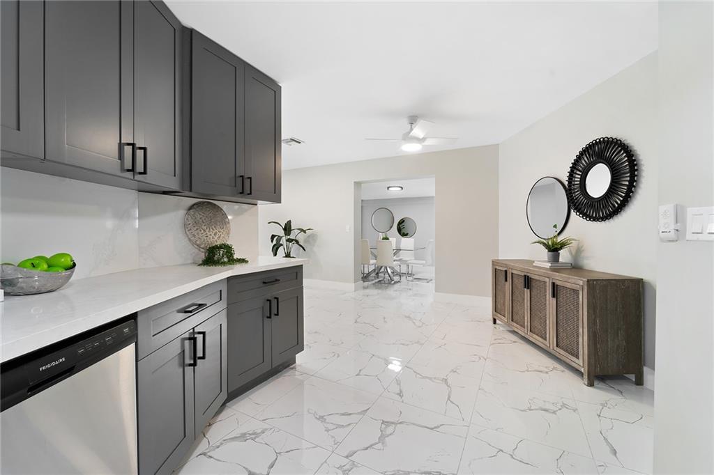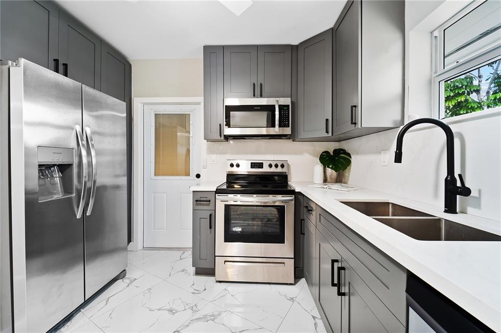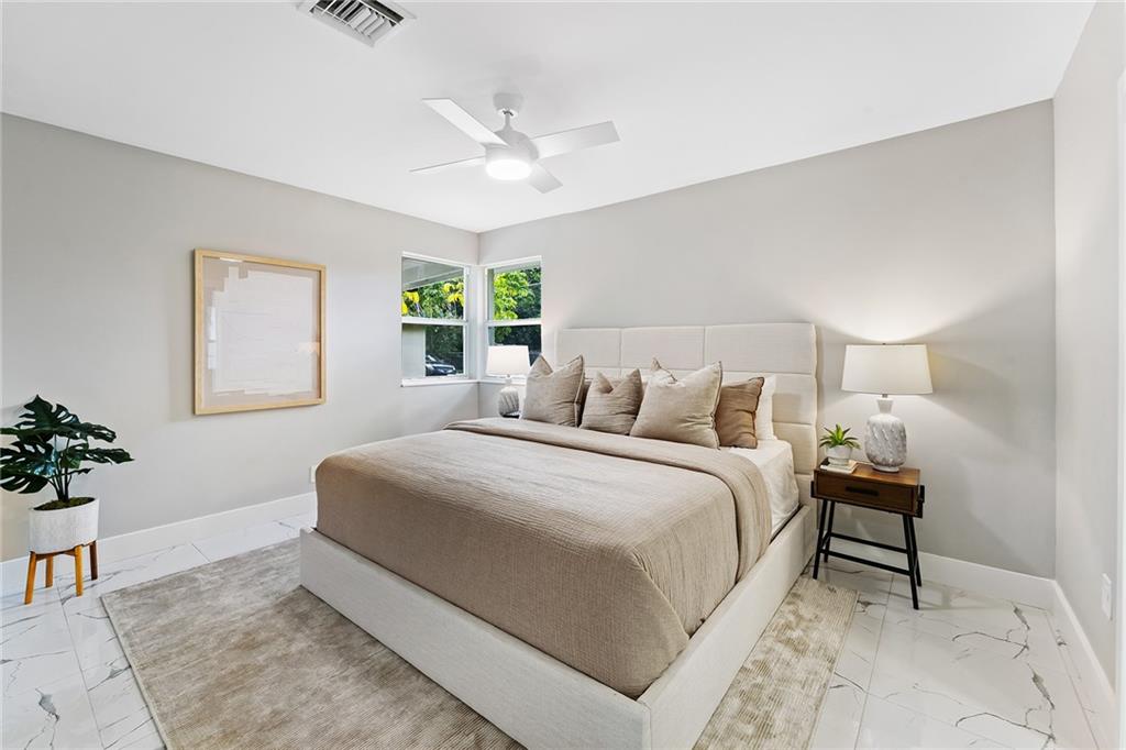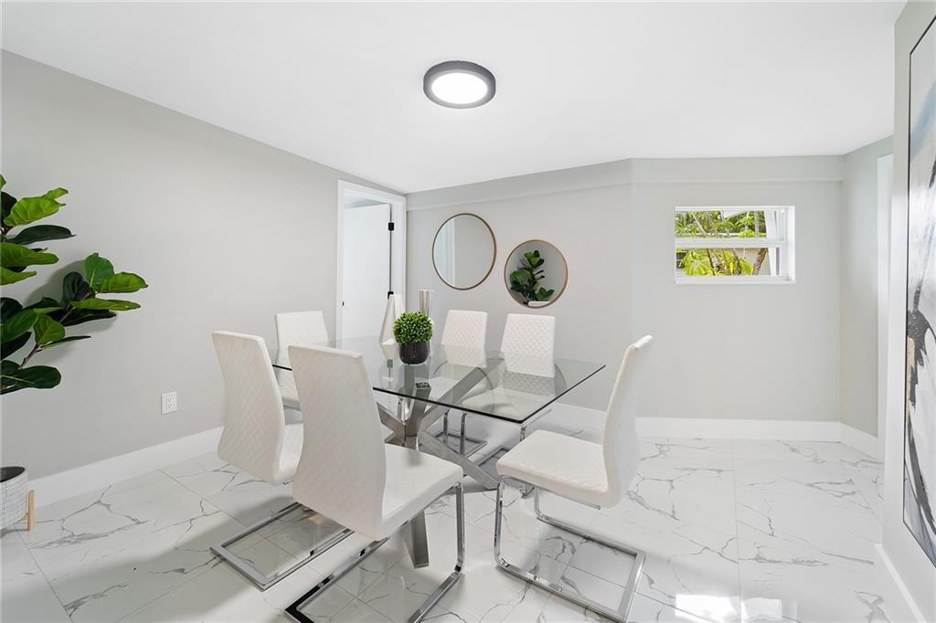 Dazzling upgrades, open spaces + stunning backyard at this 3-bed, 2-bath in wonderful Miami Shores! Miami Shores CC down the street, Miami Country Day School, tennis + downtown in minutes. Latest enhancements: cement box driveway, hurricane-proof 1-car garage door, porcelain tile + more within the residence. Super-spacious lot w/ dots of palms + vast green stretches. Tucked on a dead-end street for max tranquility! Structurally, a popping Spanish tile roof, Deco-esque back patio w/ fans + tons of windows for natural light. Inside, flexible spaces, recessed lights + gleaming tile. Open kitchen w/ gray shaker cabinets, modern white counters + stainless steel appliances. Primary suite includes ensuite w/ supersized, porcelain draped shower + stunning royal blue vanity. See it to believe it!