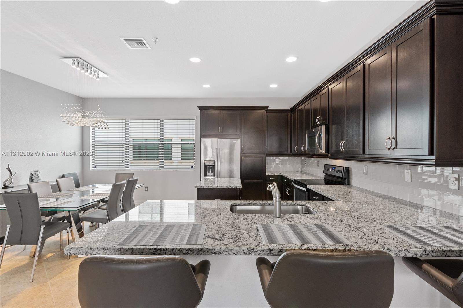 Stunning tri-level townhome in The Preserve at Raintree features 3 BR, 3 1/2 BA and 2-CG with tile throughout and carpet only on the stairs. Built in 2017, this Laguna model's 1st floor features a foyer, full bedroom with walk-in closet, a full bathroom and 2-car garage. The 2nd floor boasts an open concept with a great room, beautiful kitchen with wood cabinetry, granite counter top, island & breakfast bar, separate dining area, half bathroom, & balcony. The primary and 3rd bedroom, and laundry closet are on the third floor. The primary bedroom has 2 closets, balcony, and spacious bathroom with dual vanities, spa tub and shower. Impact windows throughout. Community amenities include a Clubhouse, Pool, Gym, Playground, Game Room.