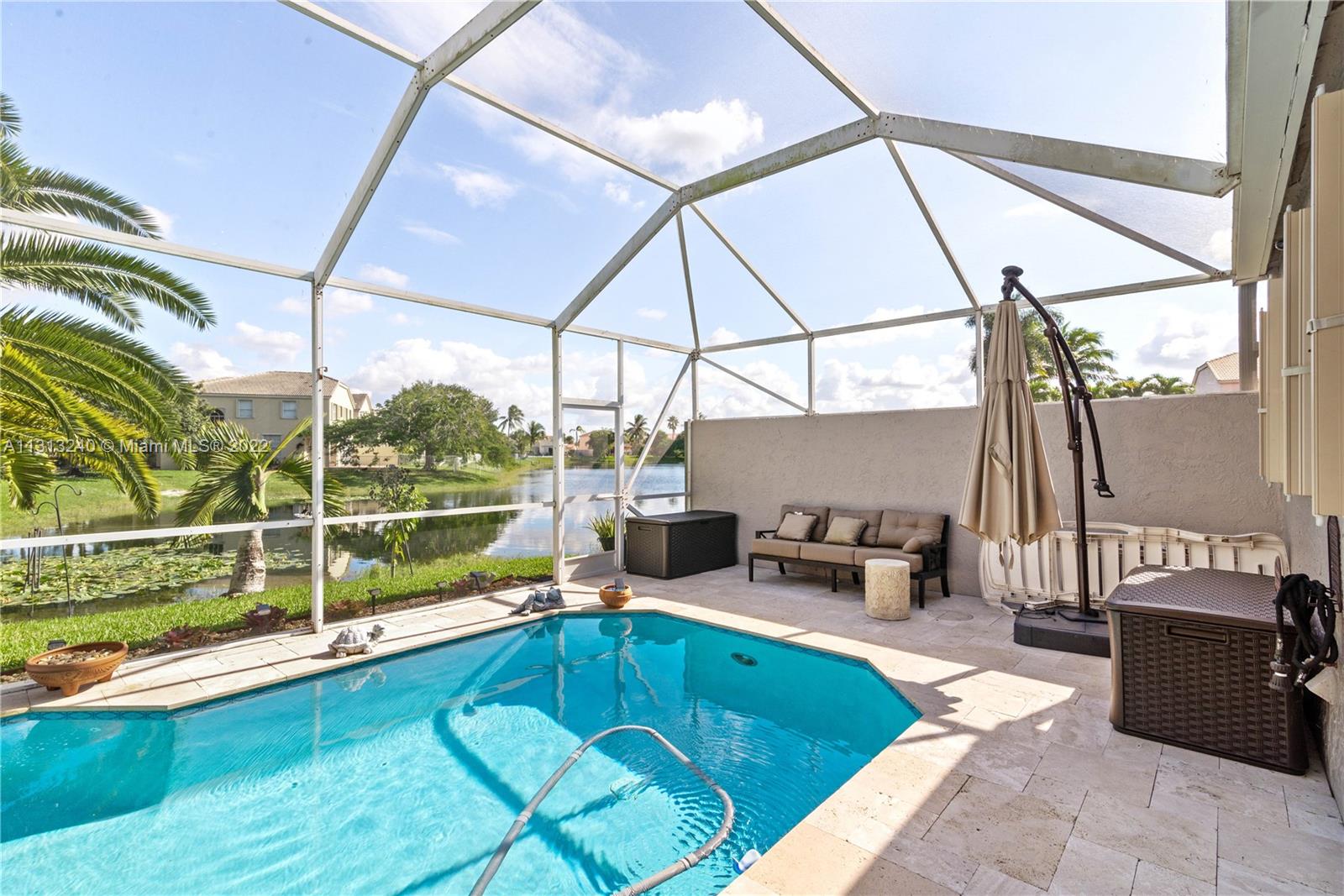 Absolutely stunning!!! Unique & rarely available 3 Bed 2.5 Bath main house + guest suite w/ on-suite bath (an additional 238SF of living space). Property features interior courtyard w/ travertine floors & screen enclosure, a 12' ceiling great room w/ open view to pool & lake, spacious layout & 2-car garage. Fabulous open kitchen w/ ALL NEW wood cabinetry, quartz counters & stainless appliances. Screened, saltwater pool newly refinished w/ travertine deck. BRAND NEW ROOF by Paul Bange Roofing. Beautifully renovated throughout, tile floors, bathrooms, all new double pane sliding doors, new A/C, all new ext & int lighting, super gutters, freshly painted. Very sought-after gated community featuring multiple pools, parks w/ baseball & soccer fields, tennis & basketball courts & playgrounds.