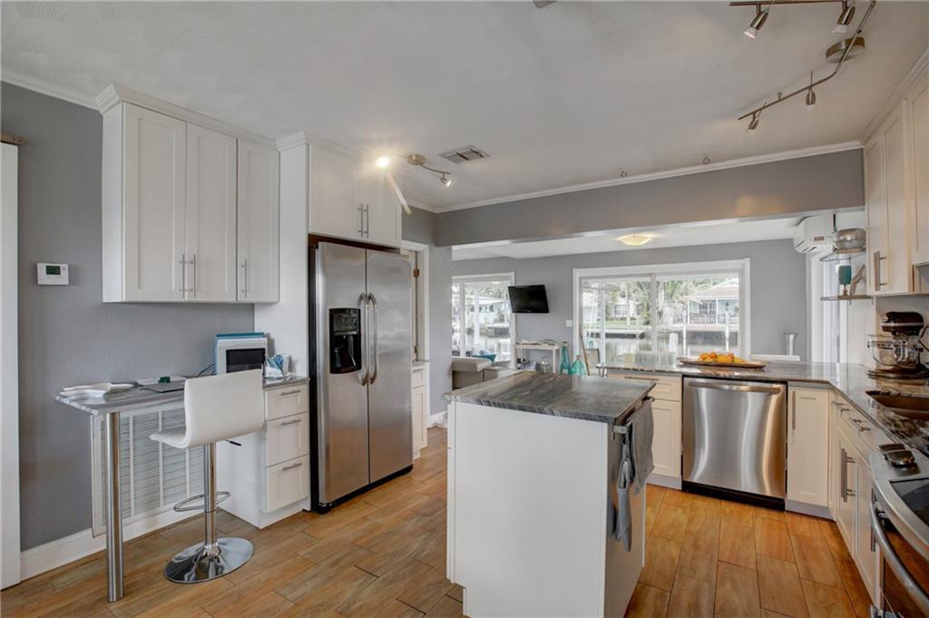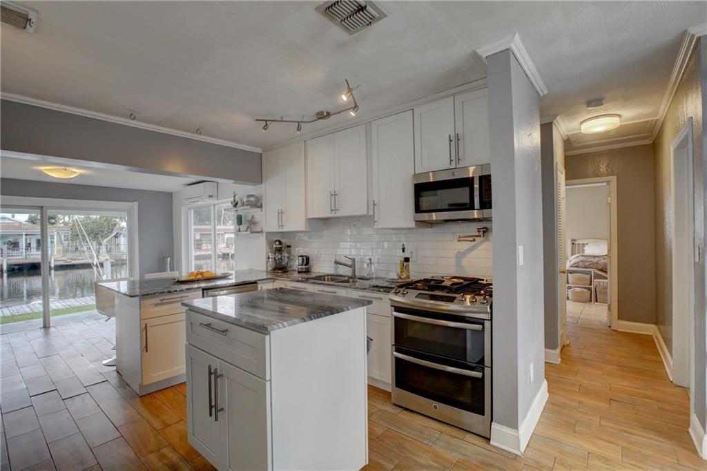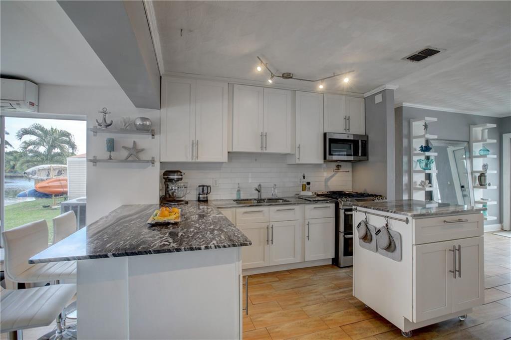 Beautifully remodeled waterfront home with ocean access. Features kitchen with white shaker cabinets & marble counter tops. Gas stove & gas water heater. Separate laundry room. 74 ft dock (there are several fixed bridges to get to the ocean). Impact doors & windows. Tile floor throughout. Covered concrete patio. Flat portion of the roof was replaced in 2020. The carport was enclosed (with permits) and adds 119 sq ft to the house plus an addition to the house (with permits) adds another 101 sq ft to the house. Total living area is 1407 square feet. House shows well! Don't miss it!