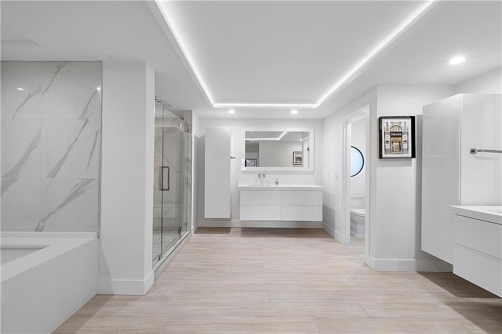 SEE VIDEOGRAPHY. Stunning Renovated Contemporary Waterfront Home on Large Lot With Serene Long Lake Views. No expense spared. Extraordinary interior architectural transformation. Huge open flr plan-direct lake views, light colored floors/high ceilings, jaw-dropping kitchen. Kitchen is center stage: fine white European cabinetry, massive double island, double wine fridge/ovens, large “hidden” pantry, countertops waterfall edge. High end fixtures/appliances. Split floor plan/great flow. 4 Bedrooms/1 used as media room; 3 baths; office; 3 car; screened pool. Hurricane impact windows/doors. Expansive main suite: large walk-in California closet; spa bath/soaking tub/separate shower. Media room/ insulated walls. Fitness, heated resort pool, playground, tennis, walking paths. Gated/Security.