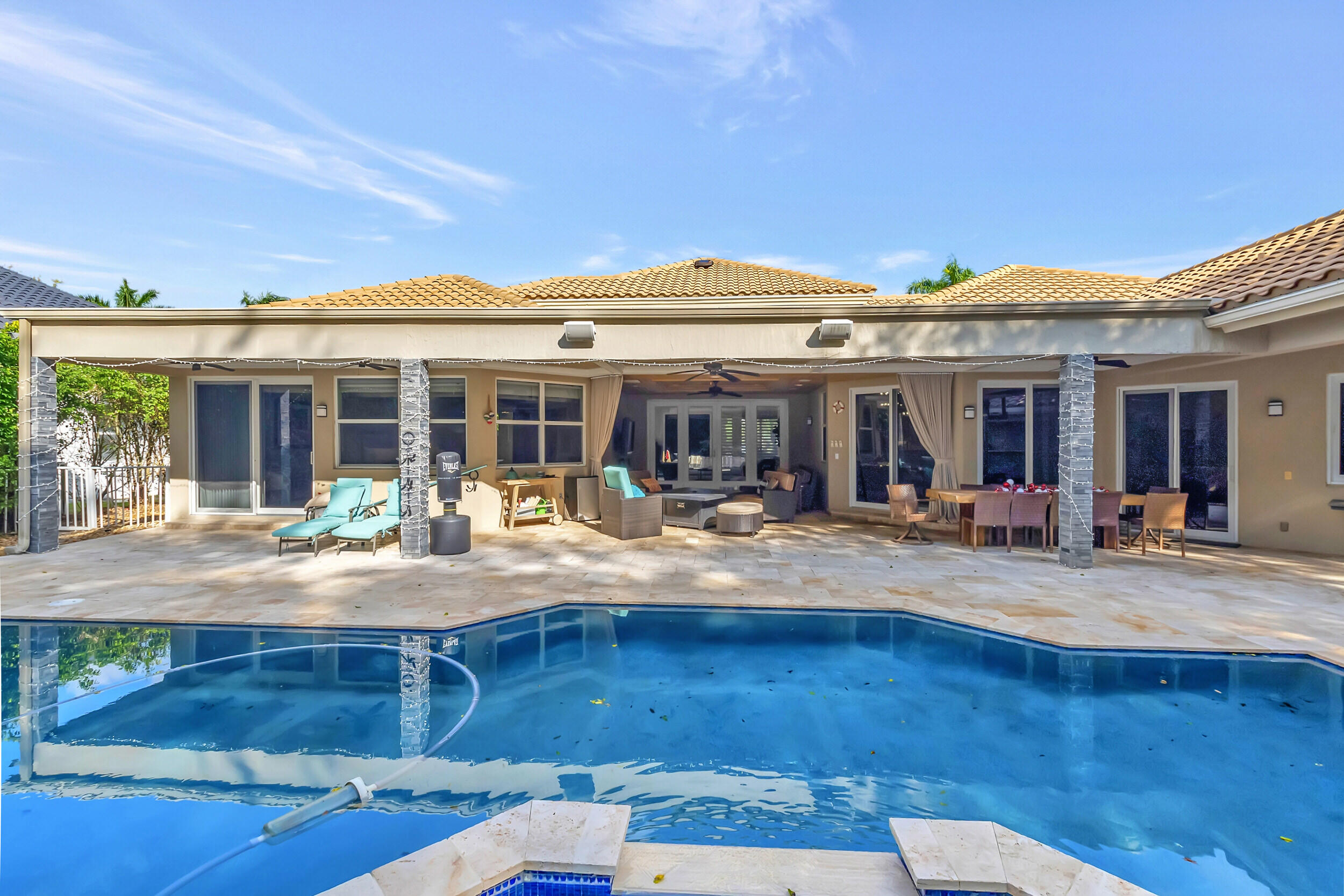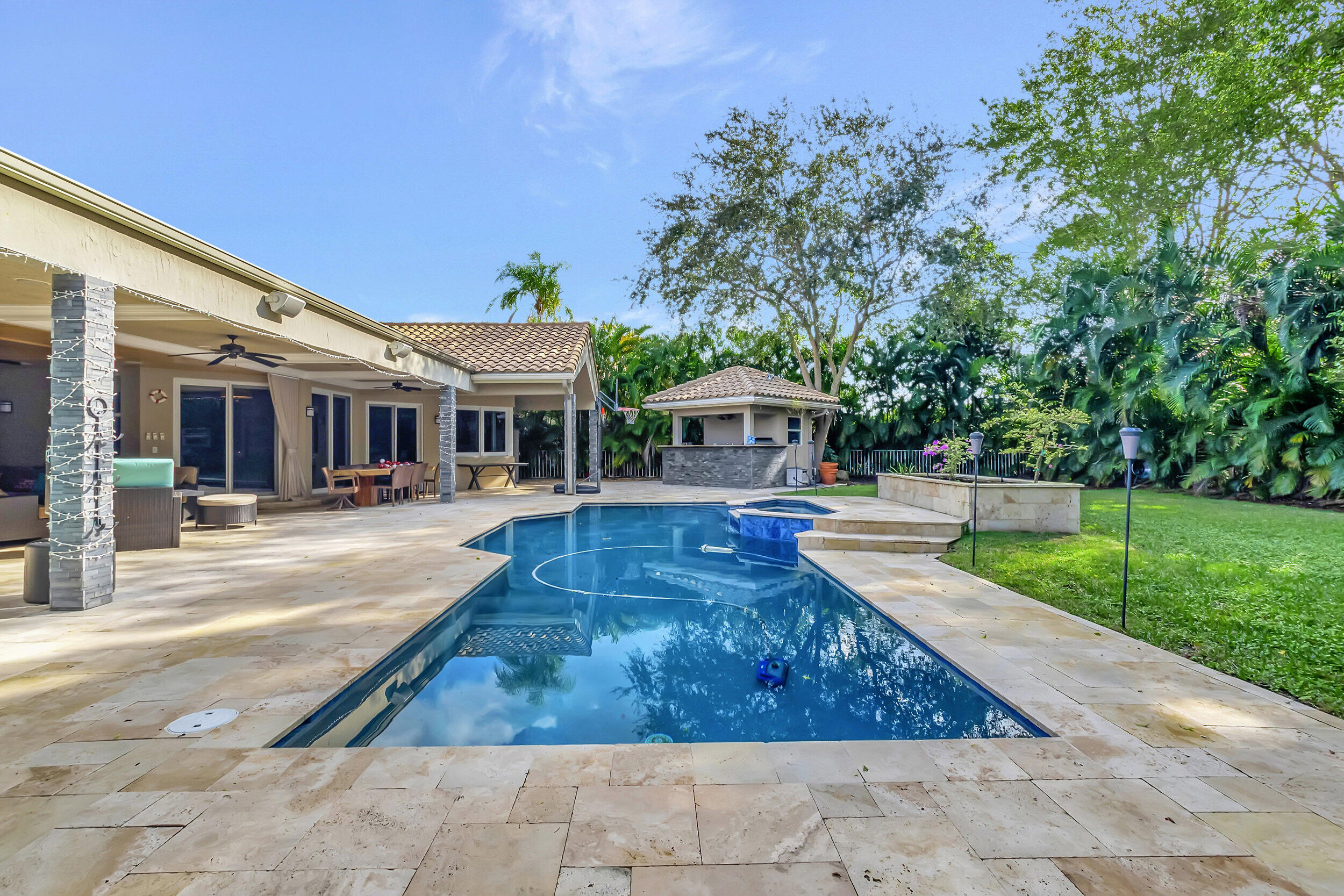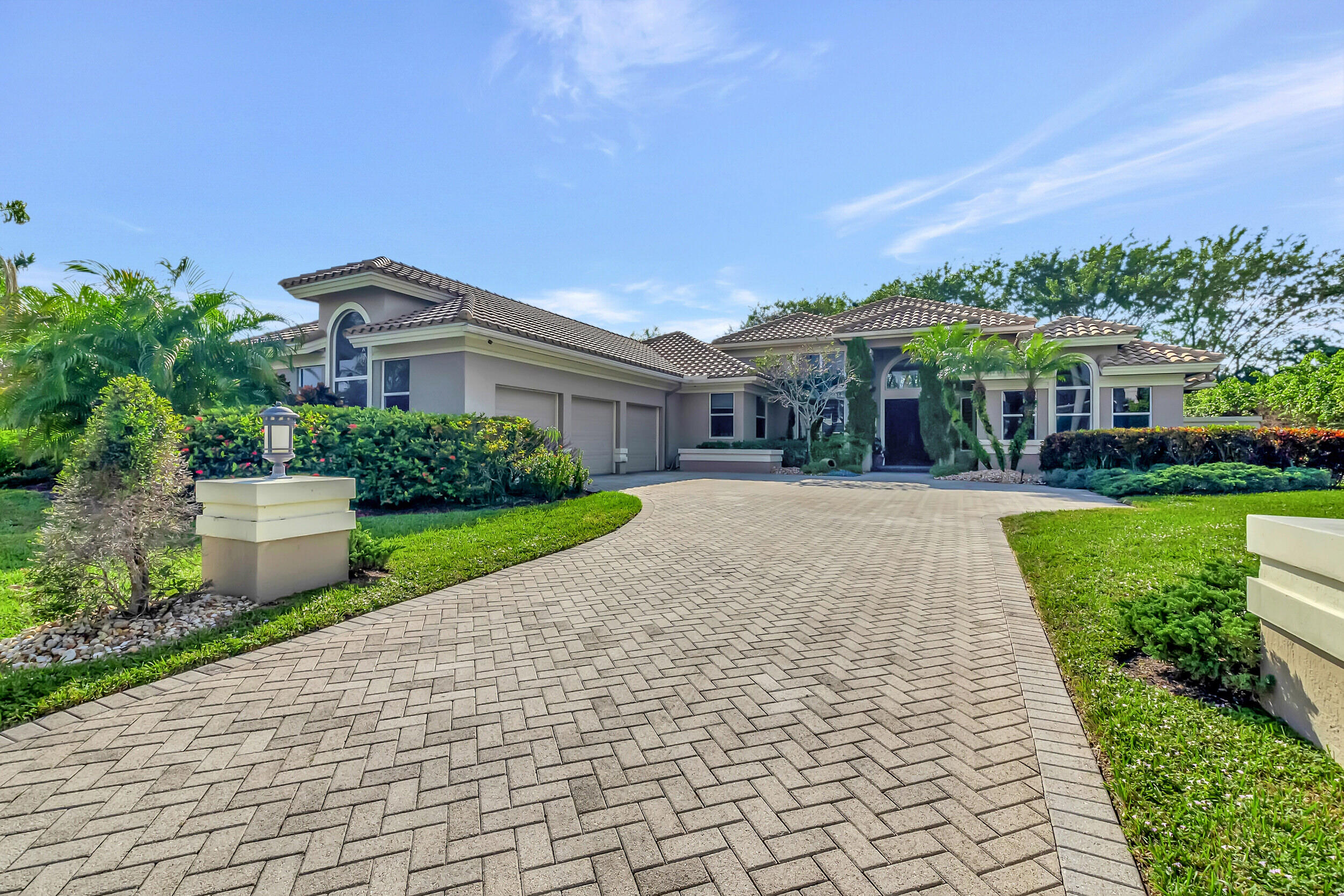 Beautiful 4 BD 4.5 BA + Office/5th bedroom one-story, estate home in highly coveted Devon Place of Woodfield Country Club. Split-bedroom plan allows for ample privacy, with all ensuite bedrooms. Spacious kitchen, open to breakfast nook and living room and enjoys gorgeous views of the backyard. Great house for entertaining, backyard offers the complete Florida lifestyle with an outdoor living room with television hookup, a full summer kitchen and bathroom, pool, patio and lawn.