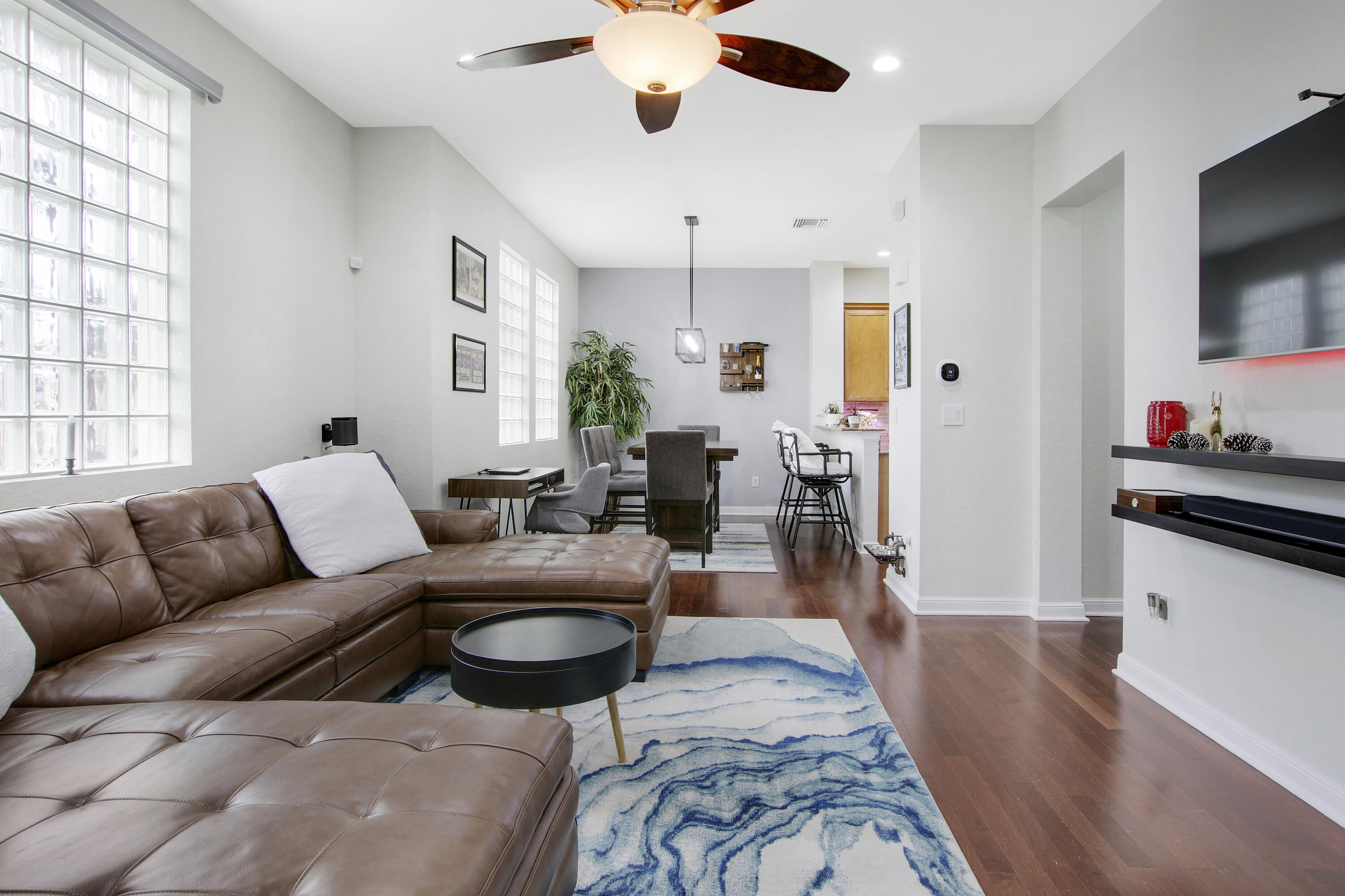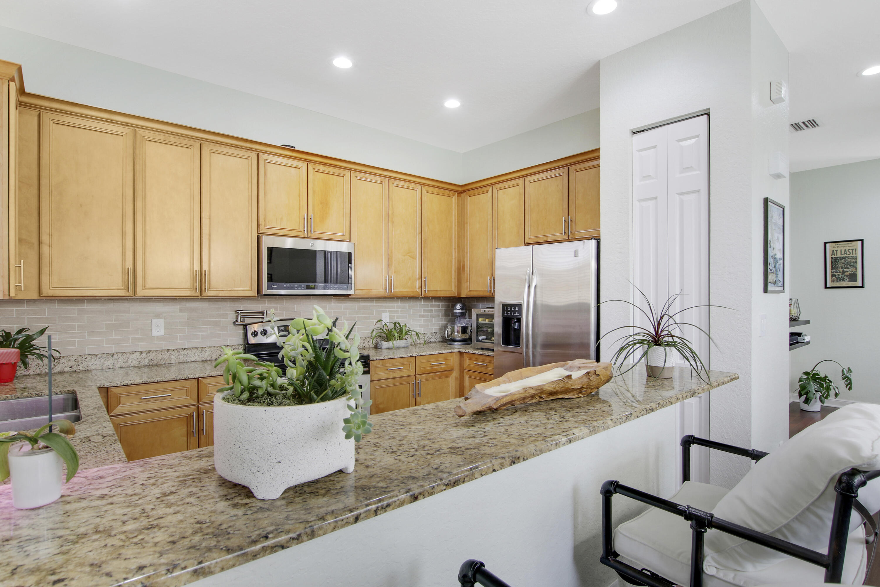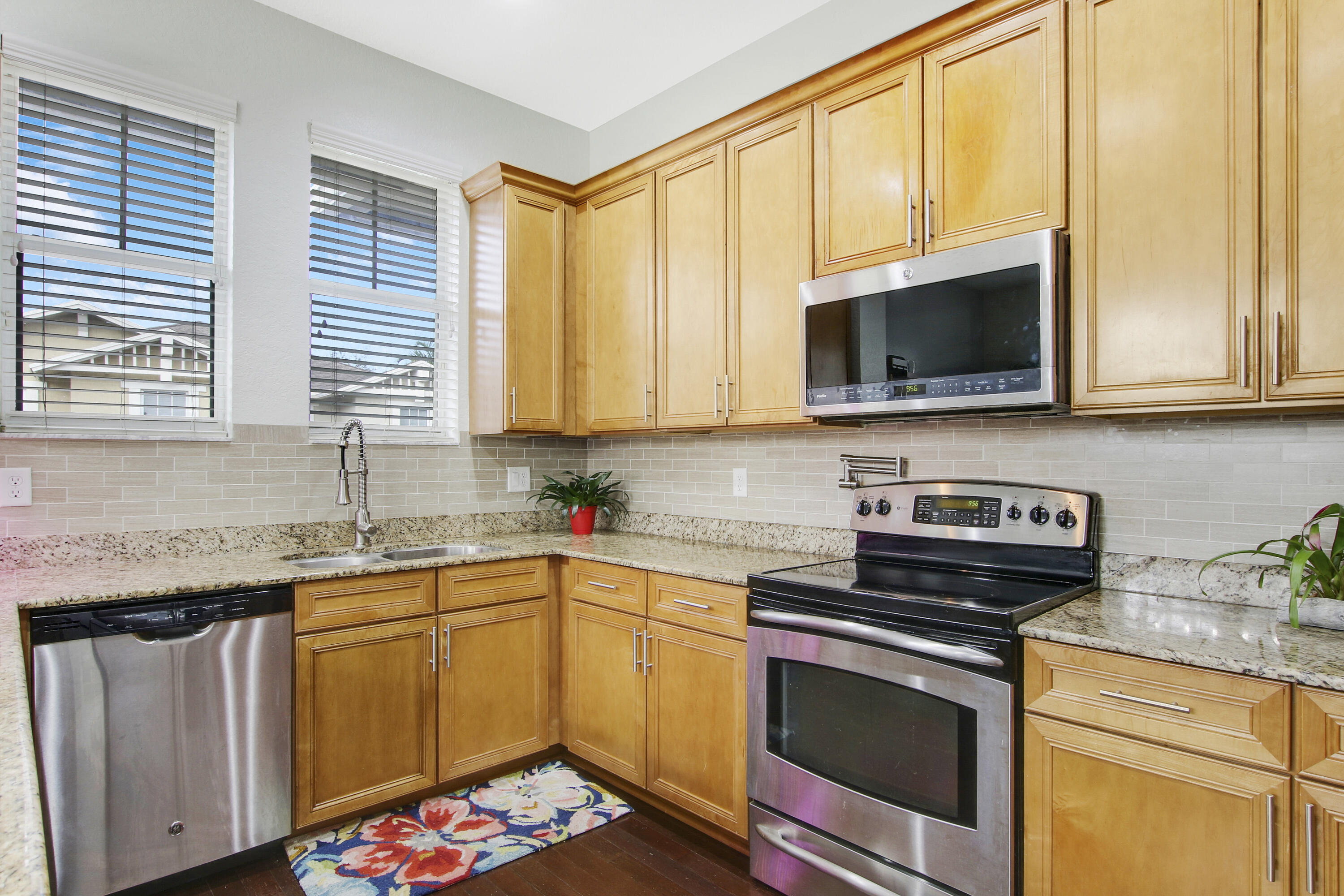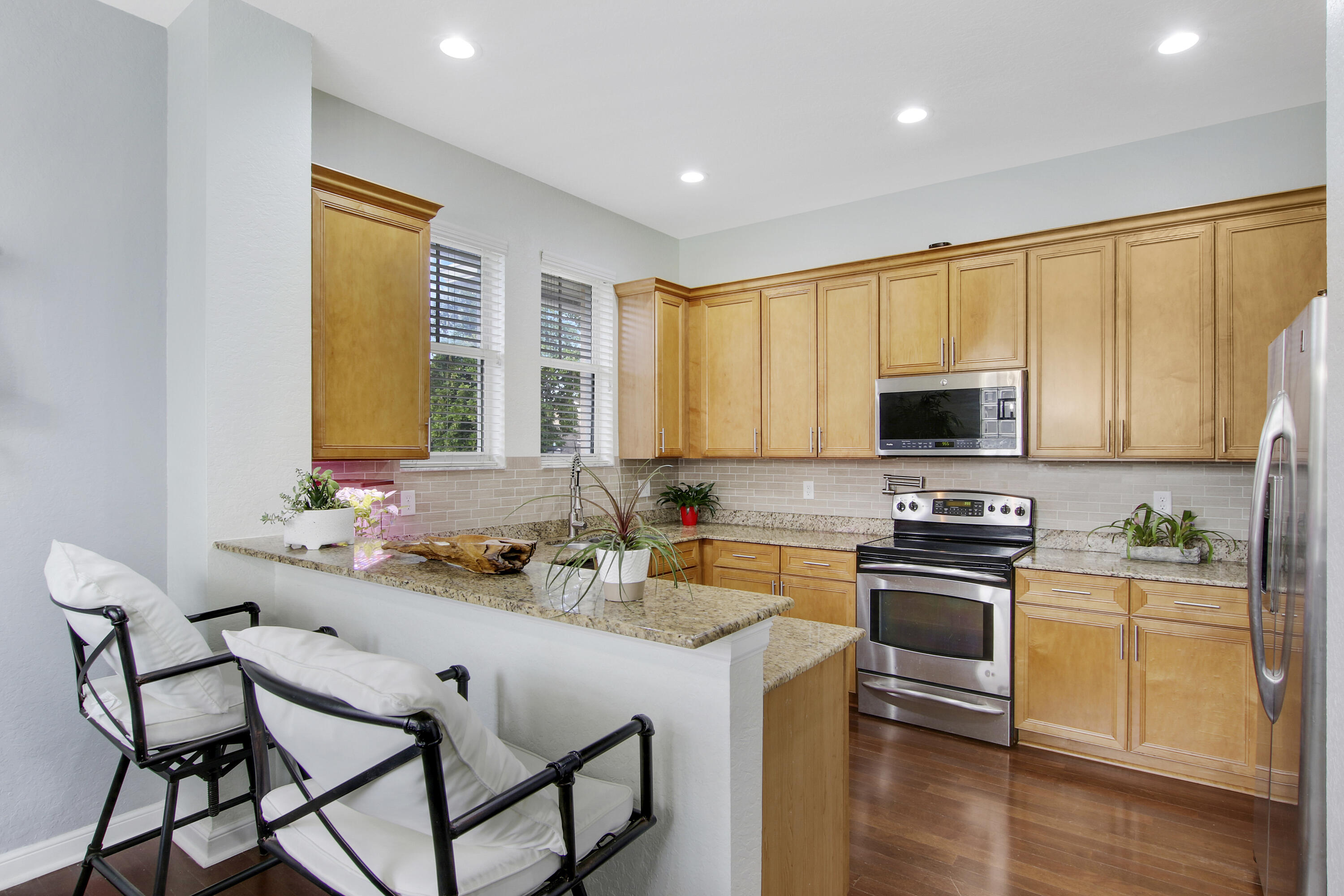 Beautiful corner unit townhouse w/ a great kitchen including granite countertops, spacious 42'' cabinets & stainless steel appliances. High-end, Grade A wooden floors throughout the whole unit. Large laundry room, with deep sink & 2 full baths w/ stunning quartz vanity & ceramic tile flooring. Large two car garage with plenty of room for storage. Amenities include large 5000 square feet resort style pool, gym, yoga room, party saloon with gourmet kitchen and theatre room. This gated community has 24 hours security at the gate and thru out the community. Great location ! Only 5 minutes from City Place and downtown Clematis street and only 10 min. from beautiful Palm Beach Island. Walking distance to Whole Foods grocery store, restaurants and more.. Conveniently close to I-95.