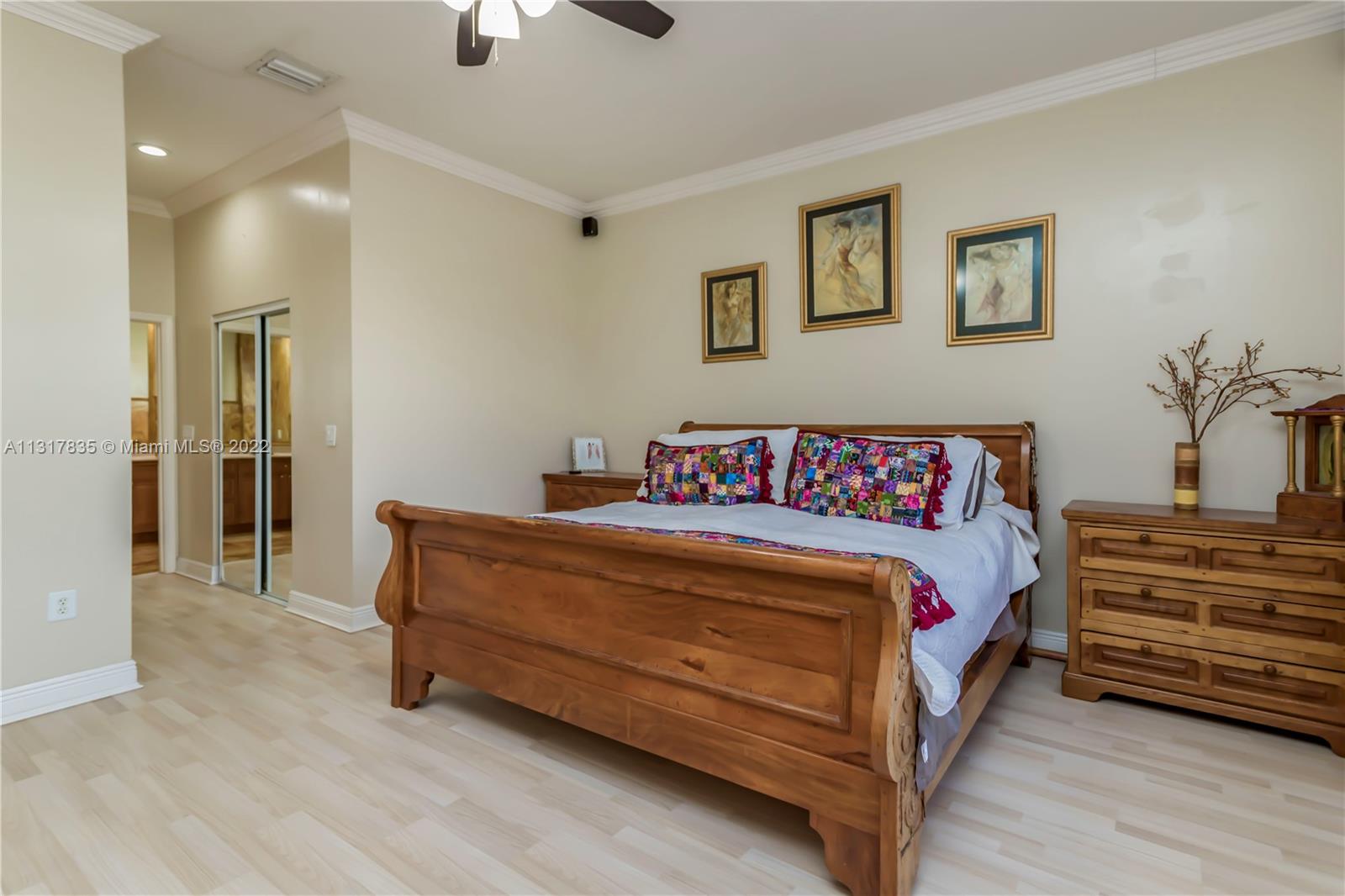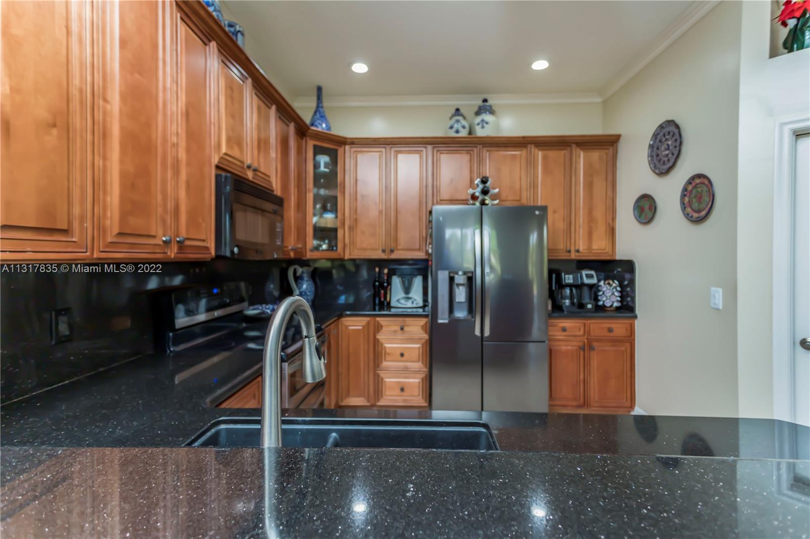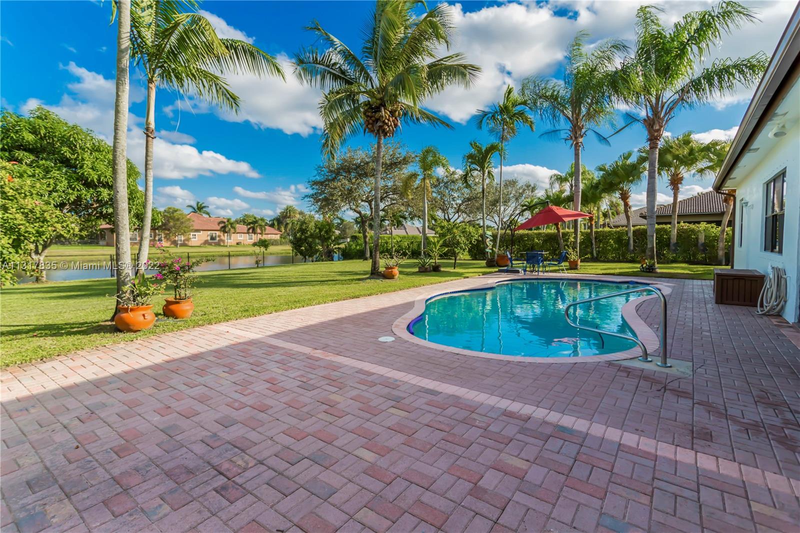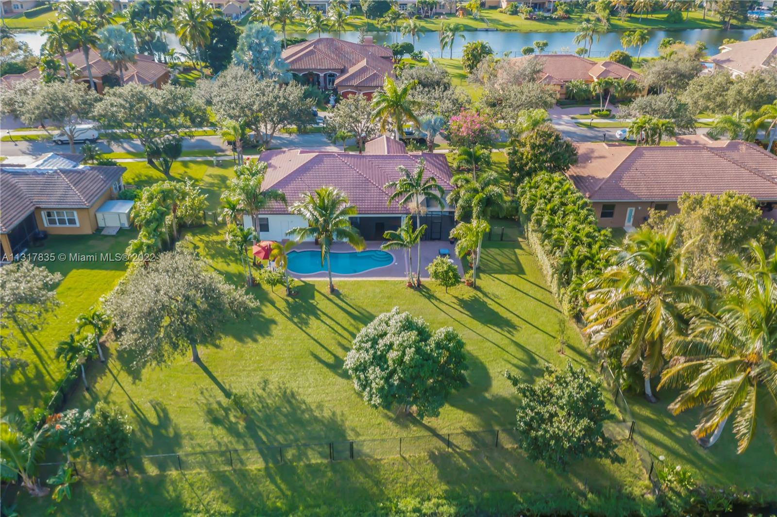 Stunning lakefront home on nearly a full acre lot in the guard gated community of Imagination Farms. This split floor plan includes volume ceilings, beautiful warm neutral colors, recessed lighting and more. Gourmet kitchen features granite counter tops, stainless steel appliances, and a large walk in pantry. Master Bedroom boast spectacular lake views, 2 walk-in closets and a large master bathroom with travertine tiles and large soaking tub. Walk out to your backyard oasis which features an extended screened in patio with beautiful ceramic tile floors, a dog run, a pool and amazing lake views. This large lot not only has lush landscaping but also fruit trees which include mango, avocado, and coconut. LG fridge does not convey.