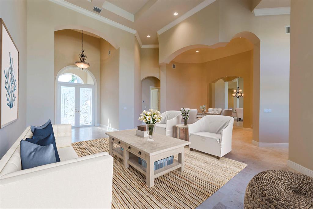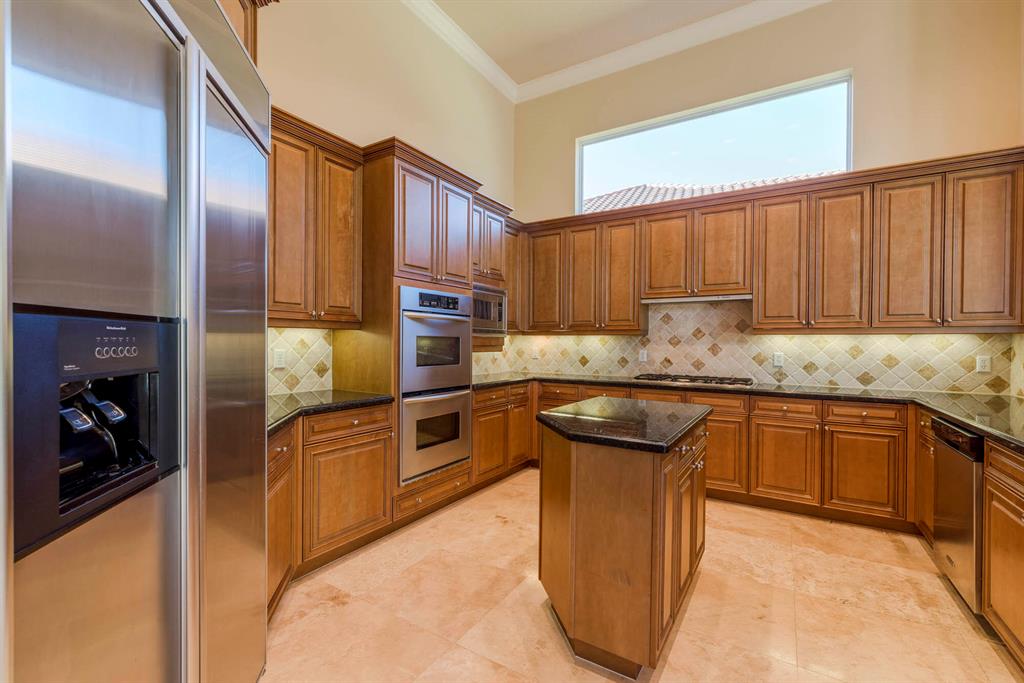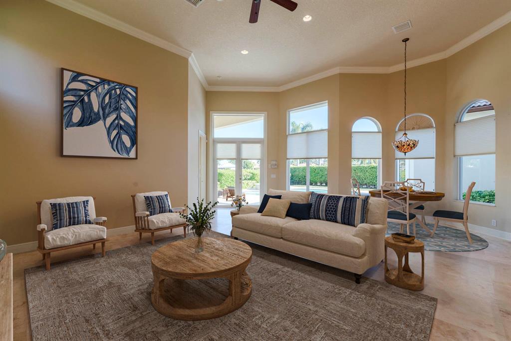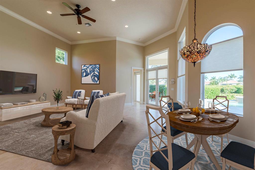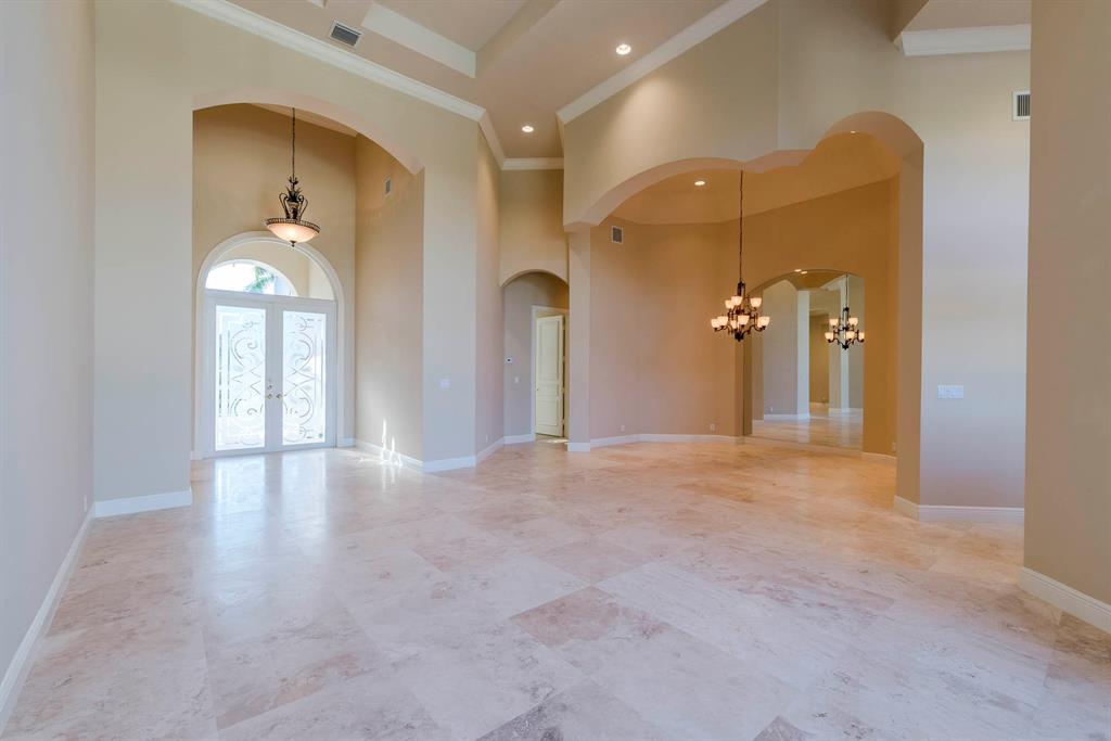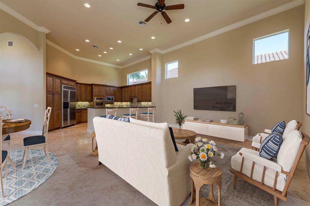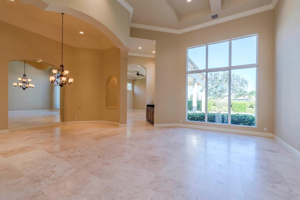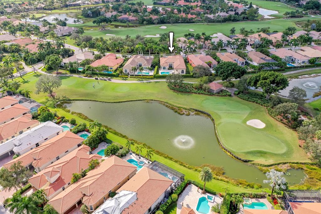 This spectacular 4BR/4/1BA home is perfectly located on Tradition #17 with stunning views of the golf course, water, and picturesque fountain. Featuring soaring ceilings and luxurious high-end finishes throughout, this home is impressive from the gorgeous, elevated street presence, through to the main living areas with floor to ceiling windows, marble tile flooring, extensive ceiling details, and elegant nooks perfect for your art collection. An effortless flow leads through to the large kitchen with center island, SS appliances, breakfast nook, and rich mahogany cabinets which exude luxury and warmth. The incredible primary bedroom features extensive moldings and a tray ceiling plus views over the beautiful pool, jacuzzi waterfall, and golf course beyond. You'll find access