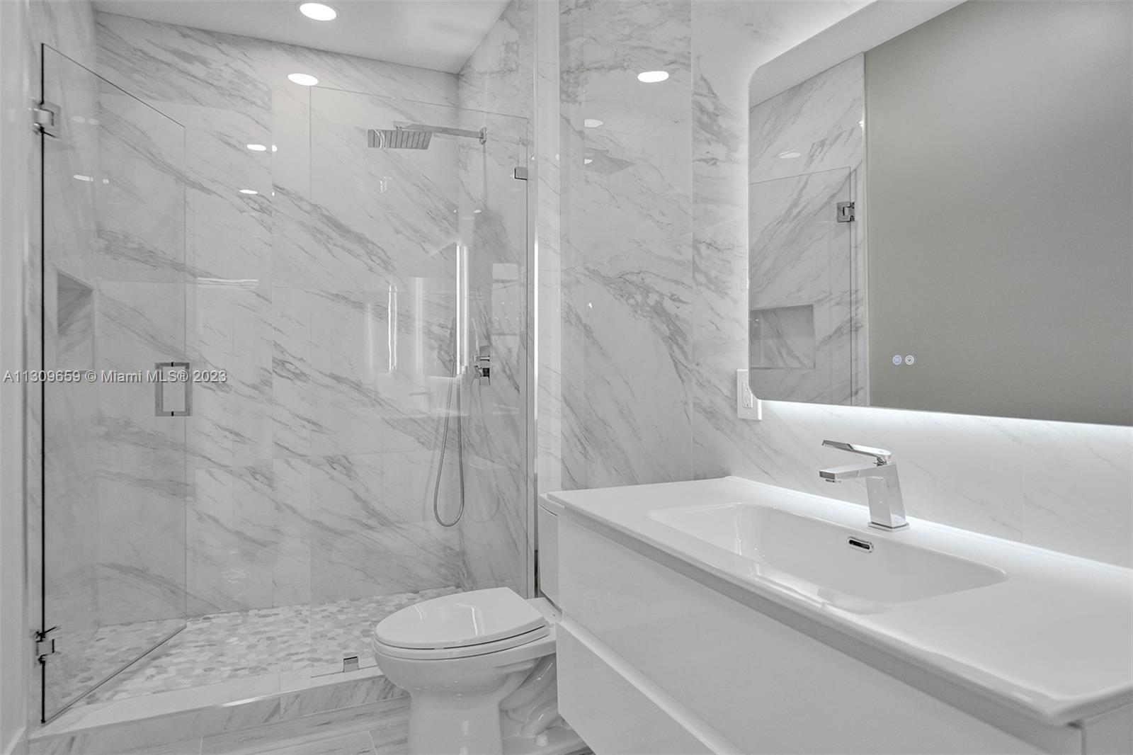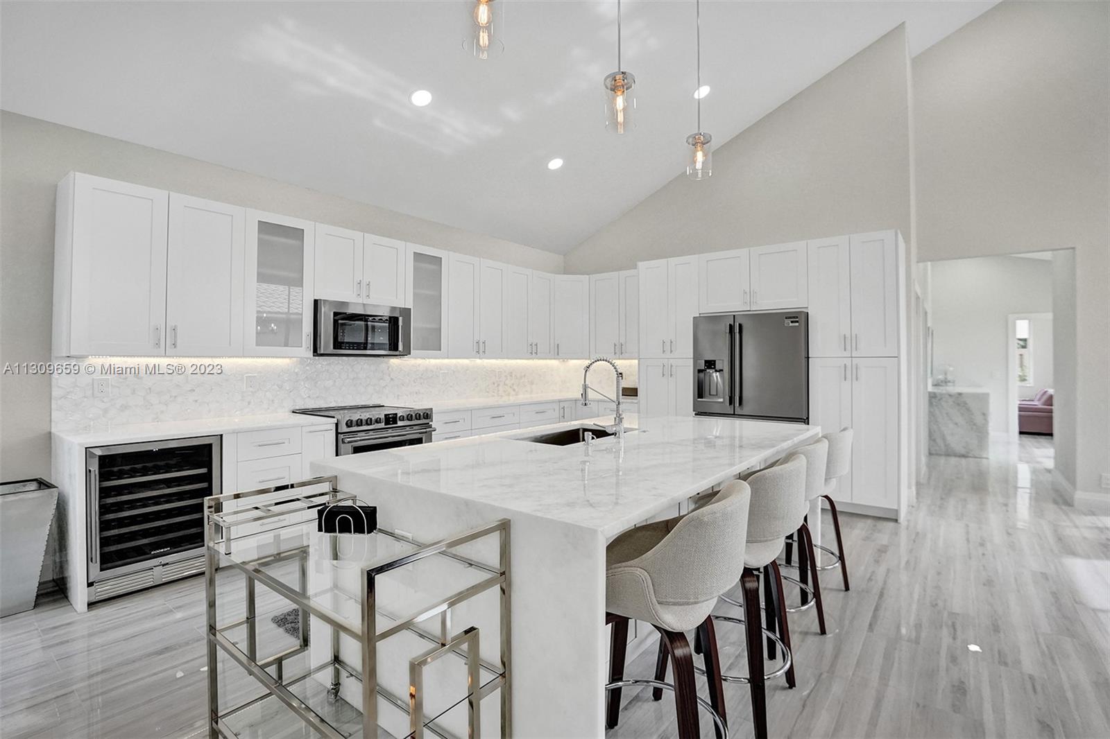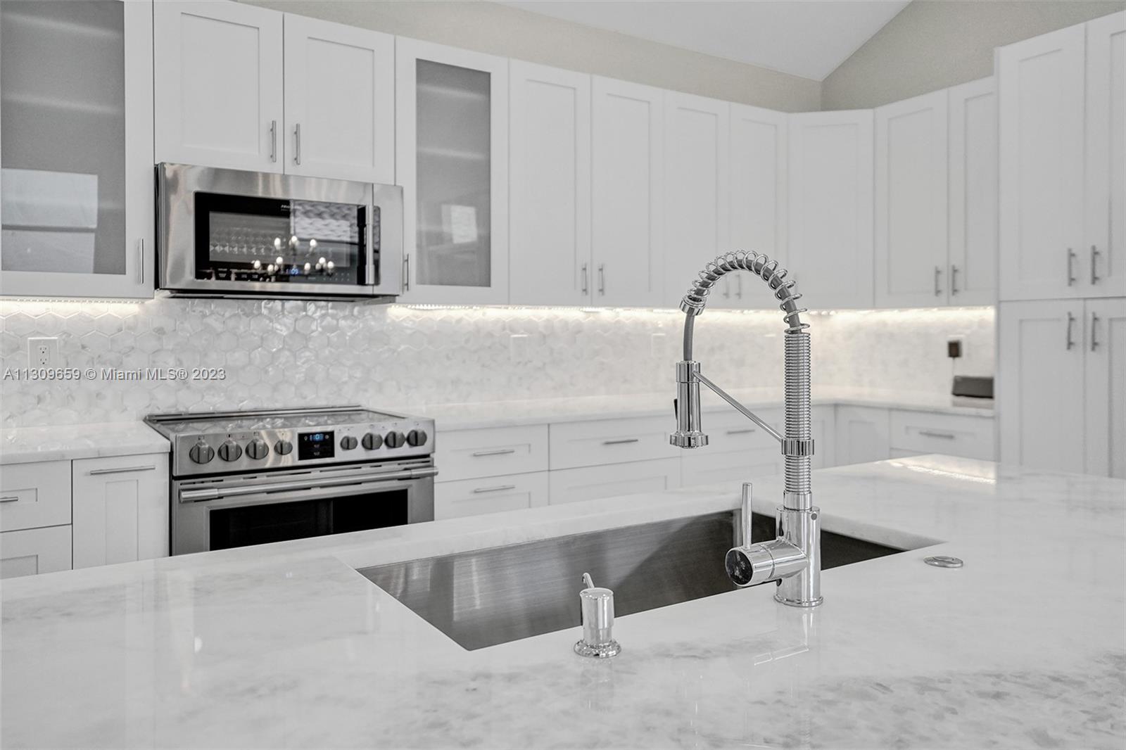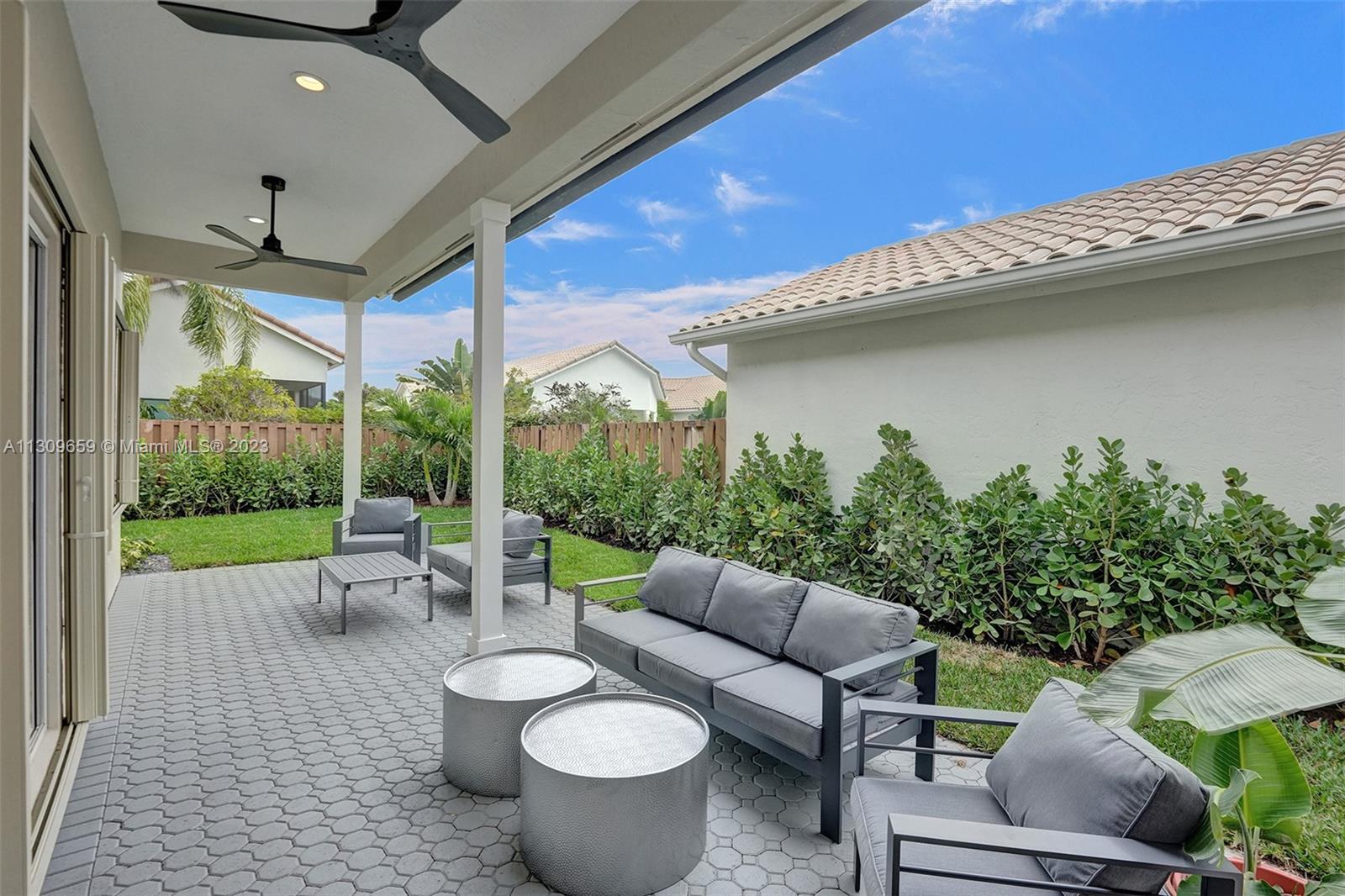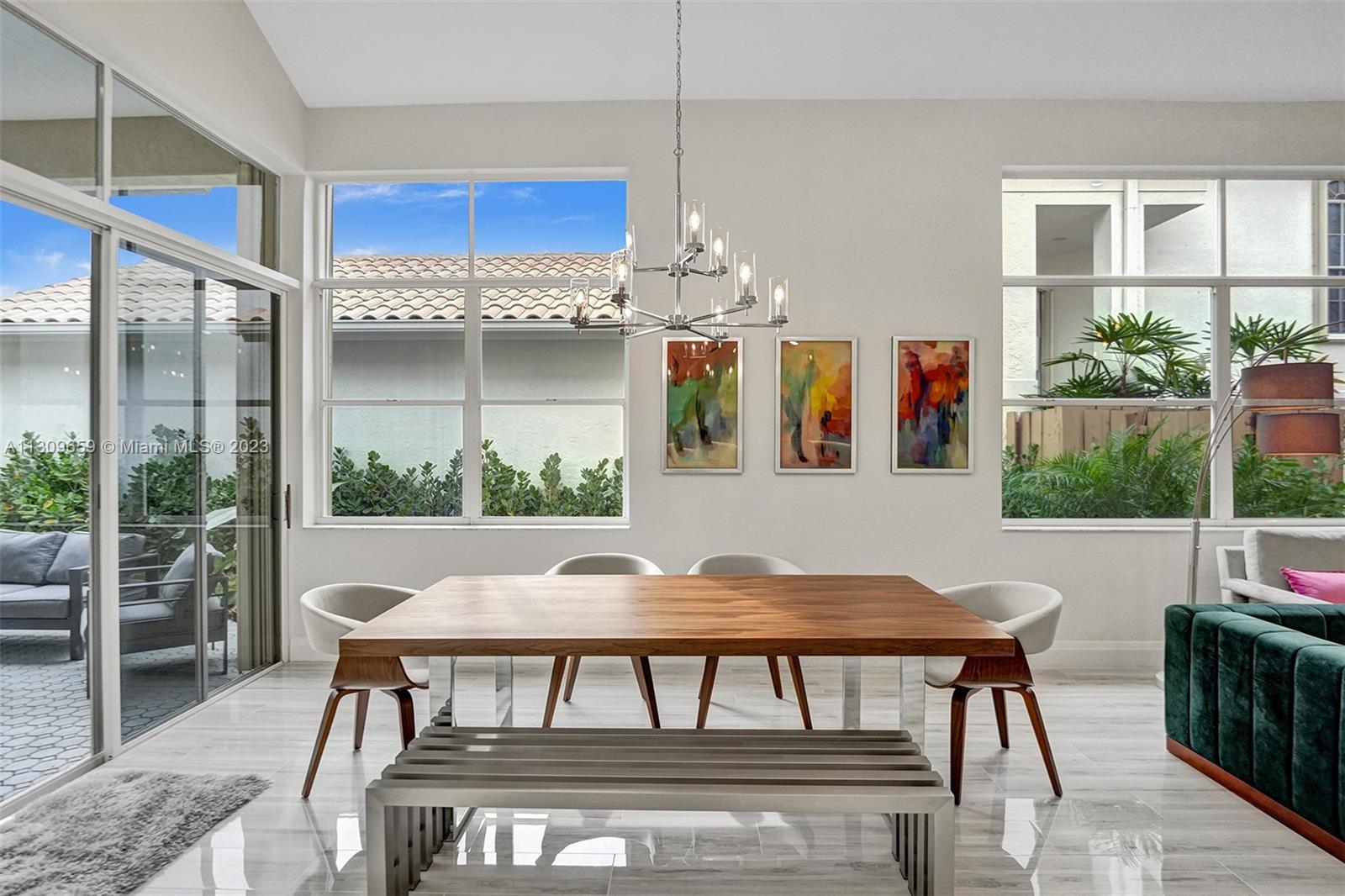 Contemporary & elegant, fully renovated turn-key home situated in beautiful Broken Sound, a gated 5 Star Platinum Club for golfers. This home boasts luxury high-quality craftsmanship & finishes. Vaulted hi-ceilings, abundant natural light spanning across open concept kitchen with large island, granite edge waterfall counter top, professional Frigidaire appliances, & wine fridge with small bar. Porcelain floors throughout & luxurious marble tiled bathrooms, floating vanities & backlit mirrors. (True 2 bed 1 flex) Accordion shutters. NEW: TILE ROOF, electrical panel, hurricane impact front door & garage door, fence & landscaping. Appliances warranted & one-year construction warranty on the home. Clubhouse is undergoing $30M renovation. A-rated schools! Furniture excl, however for sale.