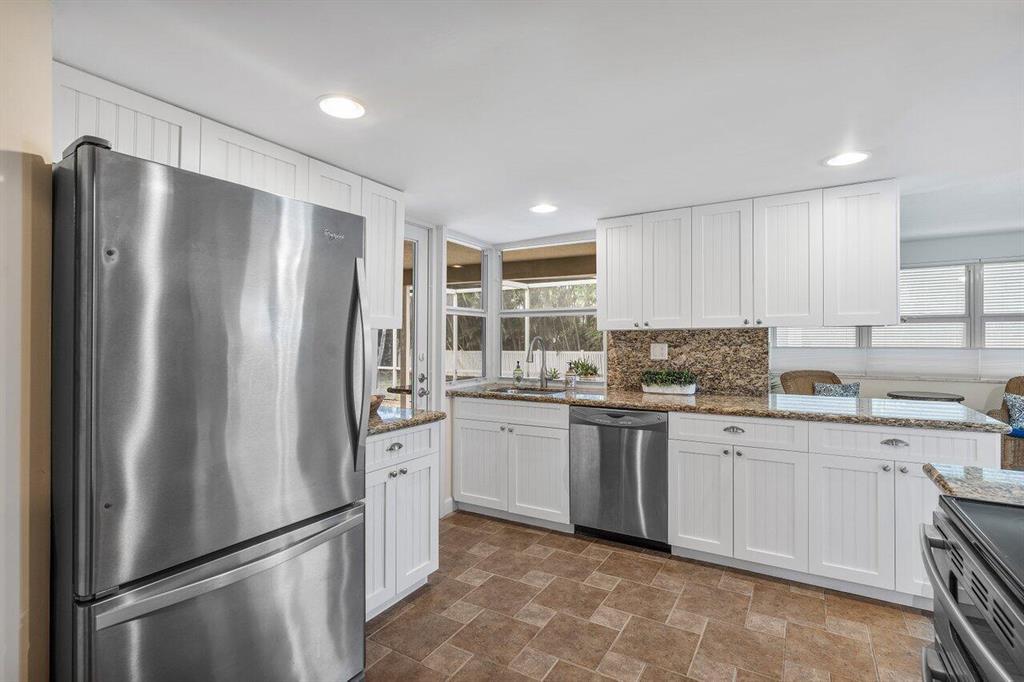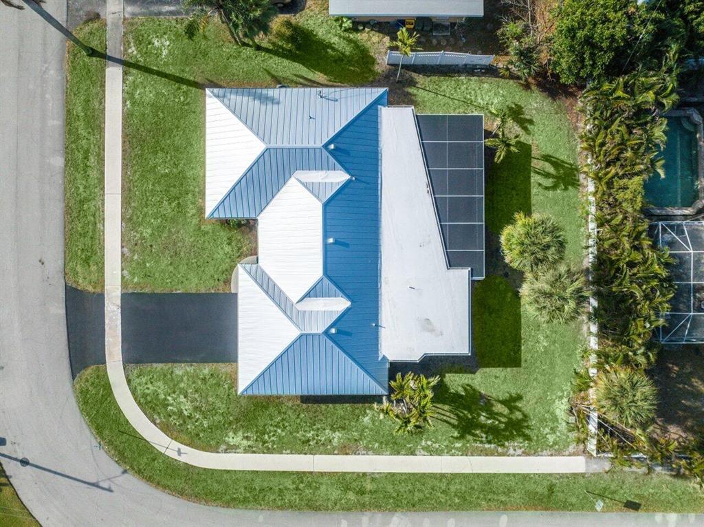 Back on market with BRAND NEW METAL ROOF, new flat roof and added double wrap rafter strapping for improved Wind Mitigation - Spacious interior corner lot tucked away in a quiet area. Room for an addition and a pool. Impact glass, A/C 2021, updated kitchen and bathrooms, covered and screened patio area. Fabulous front living room in 'great room' style with triple sliders that pocket for entertaining. Off the kitchen is a room with flexibility - maybe a family/media room, breakfast/dining room or perfect office - sunny with windows or sliders on 3 sides! Updated white kitchen, granite and stainless appliances. Bathrooms renovated, neutral white with stone tops on vanities. Other details click