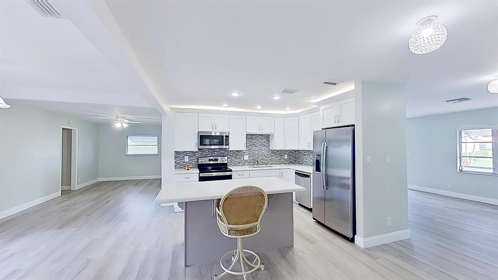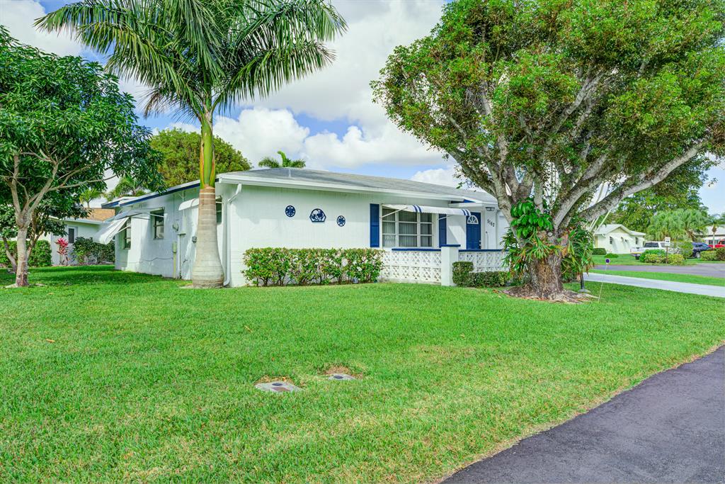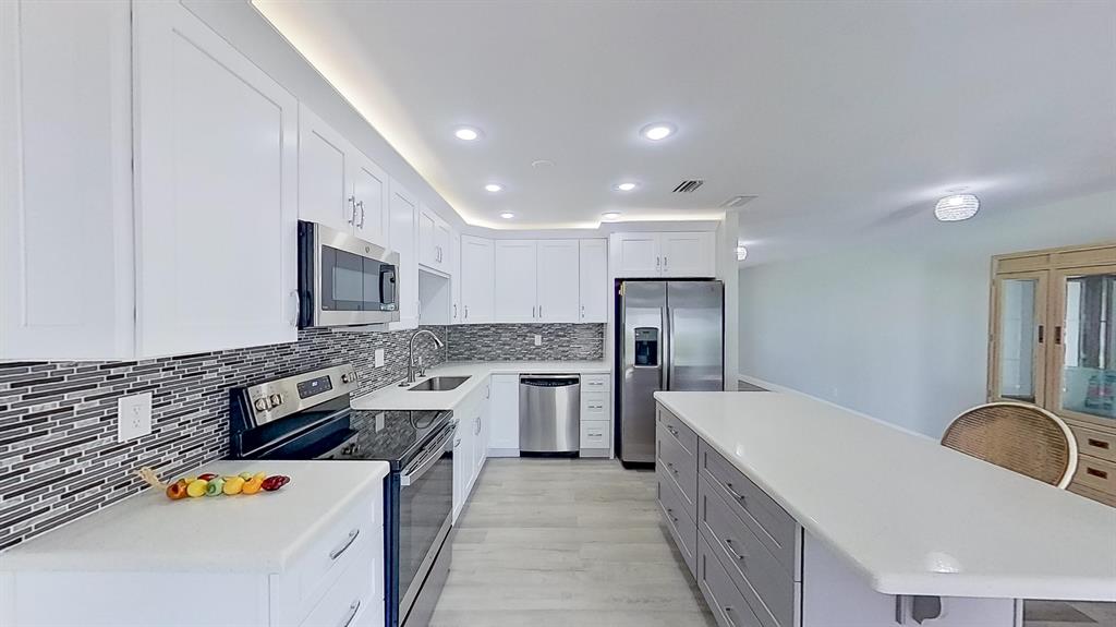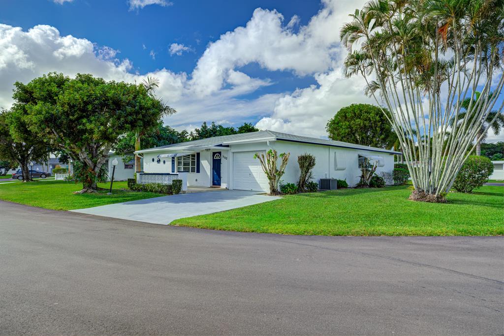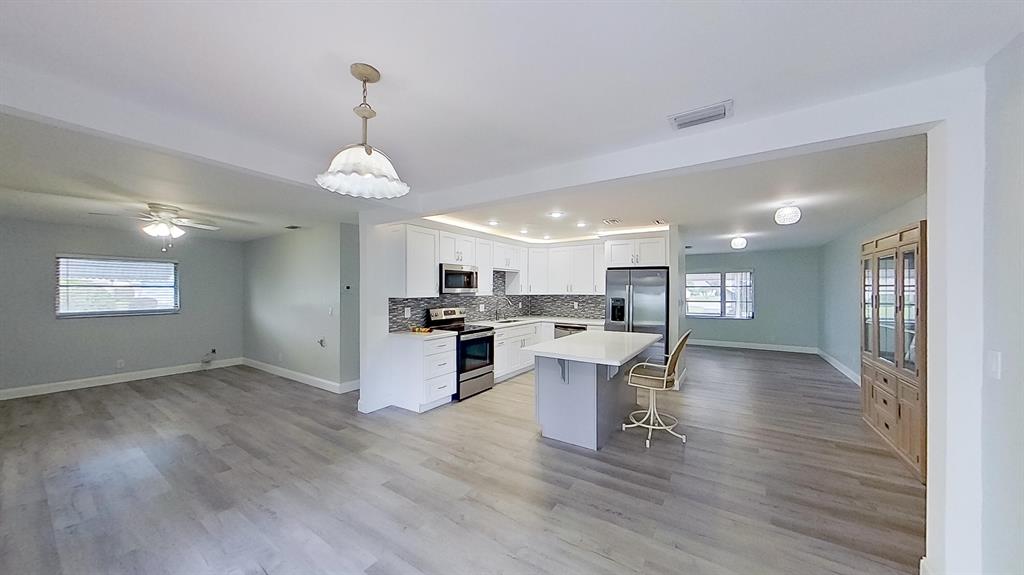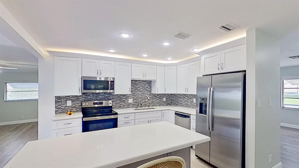 This 2 bedroom / 2 bath single family home which is located in a 55+ community offers an open concept layout with a spacious and luxurious kitchen with new quartz countertops, large kitchen island, & all stainless steel appliances. Along with updated bathrooms, newly installed wood look plank tile, and new electric garage door opener. This captivating home is located on a corner lot and also has an extra room that may be used as a den, third bedroom (closet included), or home office. The home is freshly painted and has resort style amenities including golf course, swimming pool, tennis court, clubhouse, & much more. NO MEMBERSHIP FEES. Do not miss out on this spacious and splendid home.