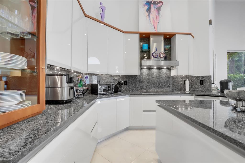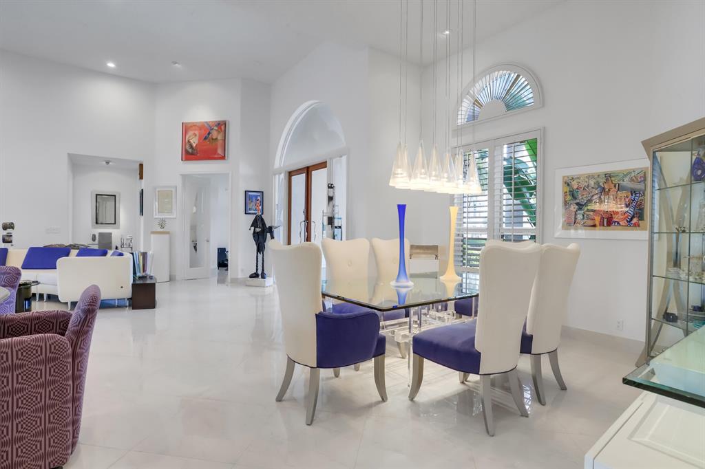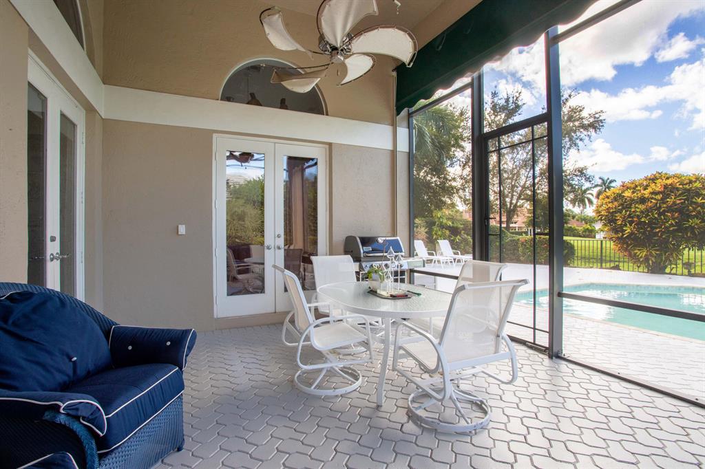 Exceptional transitional contemporary on the Championship west golf course overlooking fairway, lake, golf green and sun-set views. Dramatic central entertaining bar area that serves the living, dining and family areas. Equally open is the Irpina cabinet and granite counter top kitchen and breakfast area which opens to family room with media center. Oversized White porcelain floors go throughout the residence. The primary bedroom suite accesses to the screen closed covered patio as well as to the open pool. An adjacent bedroom features a full bath - currently used as an exercise room (closets have been ordered). Two additional en suite bedrooms are on the secondary wing, one with cabana bath access to the pool patio area. SEE MORE.