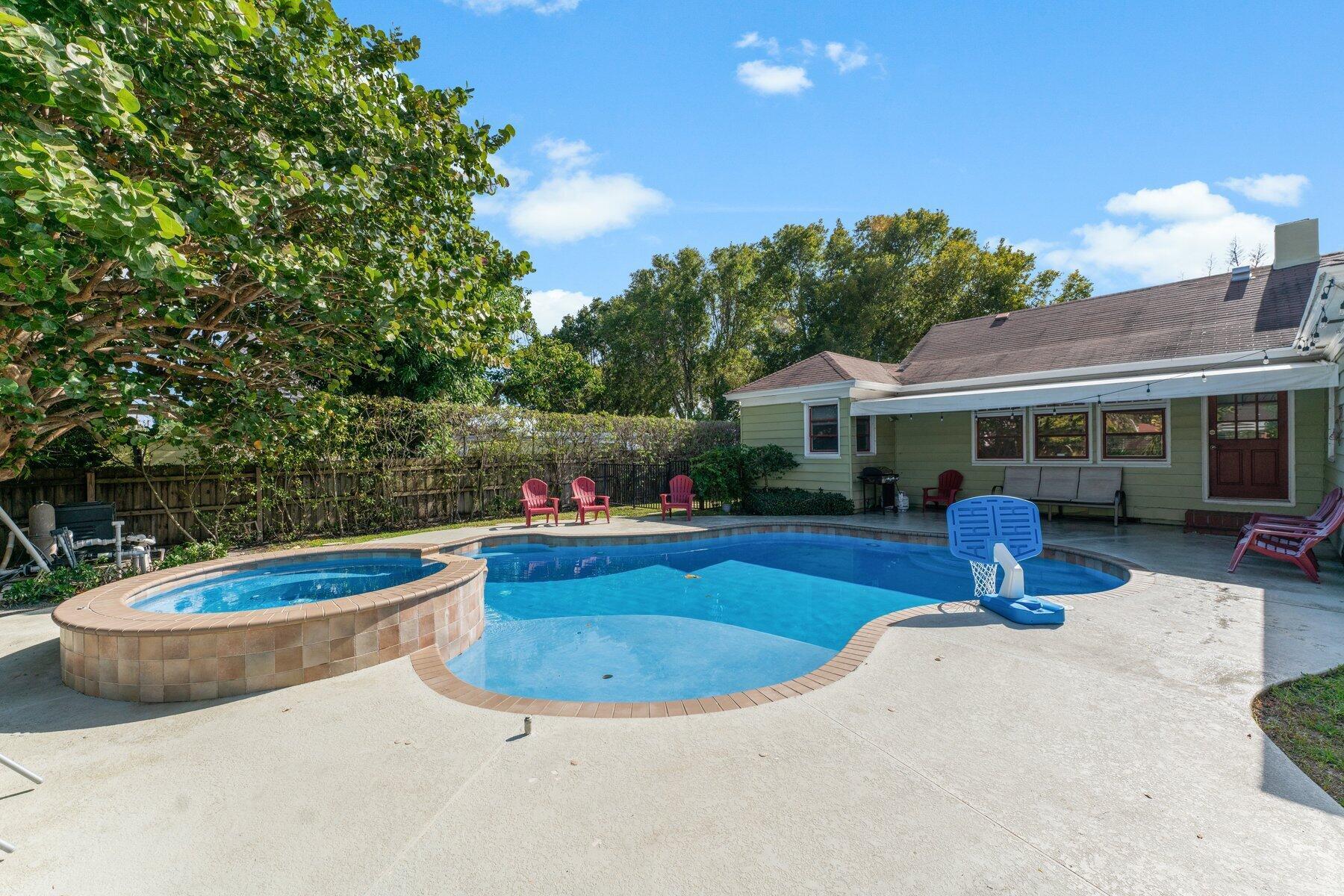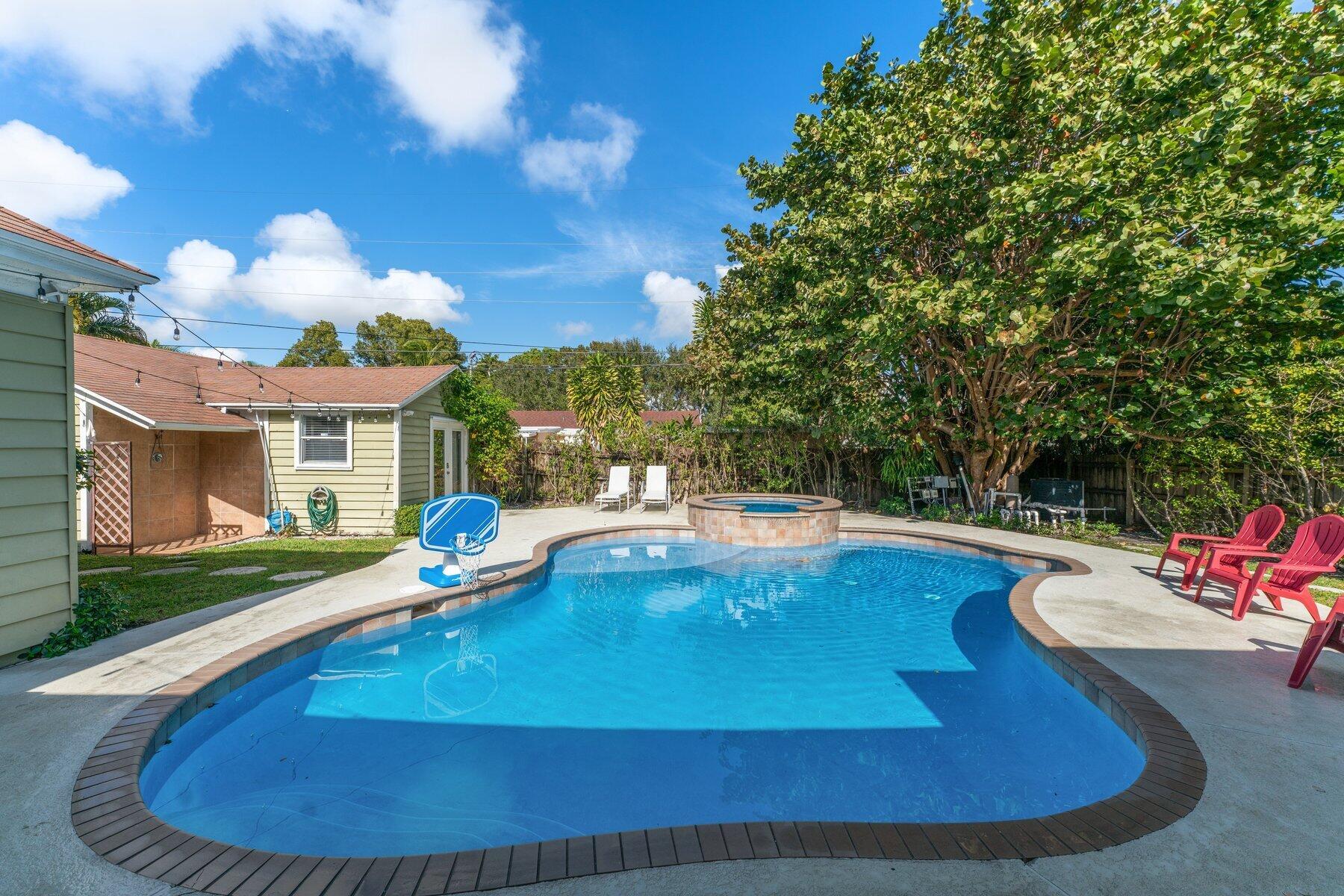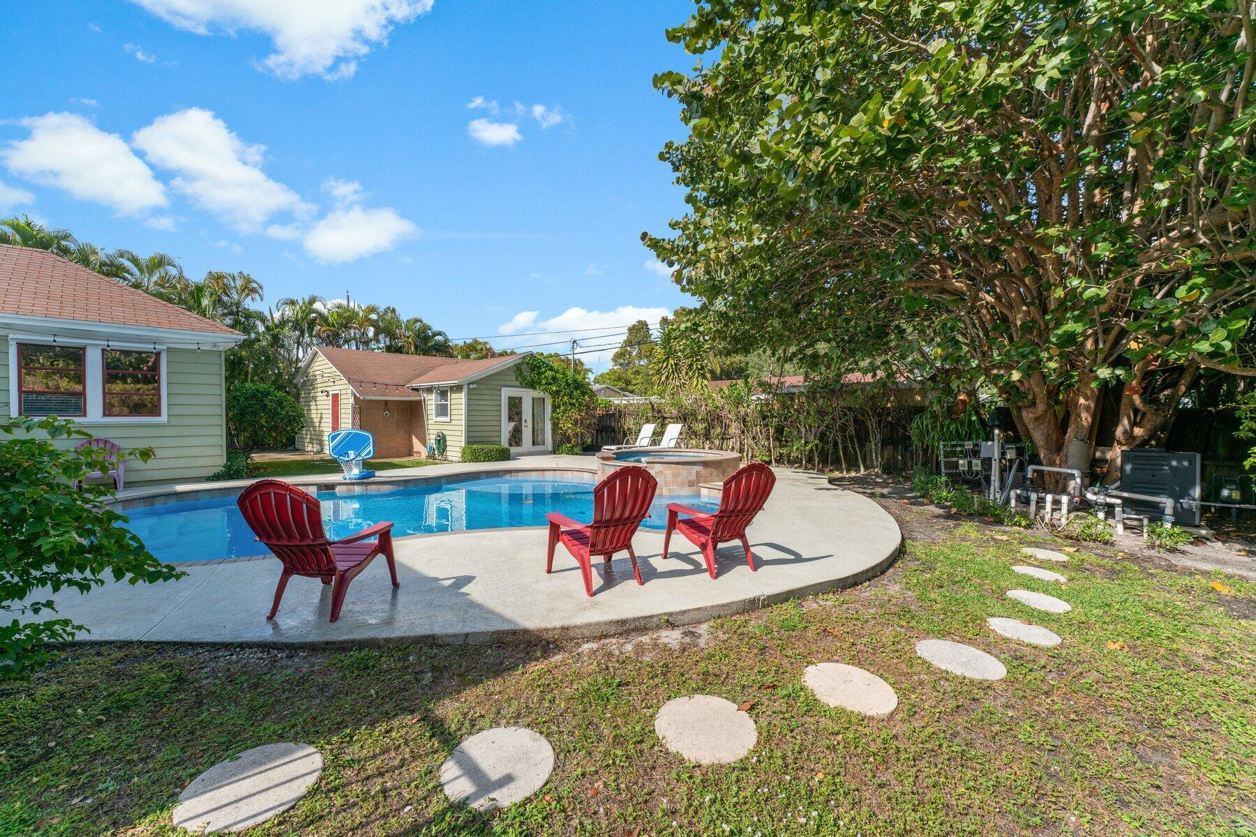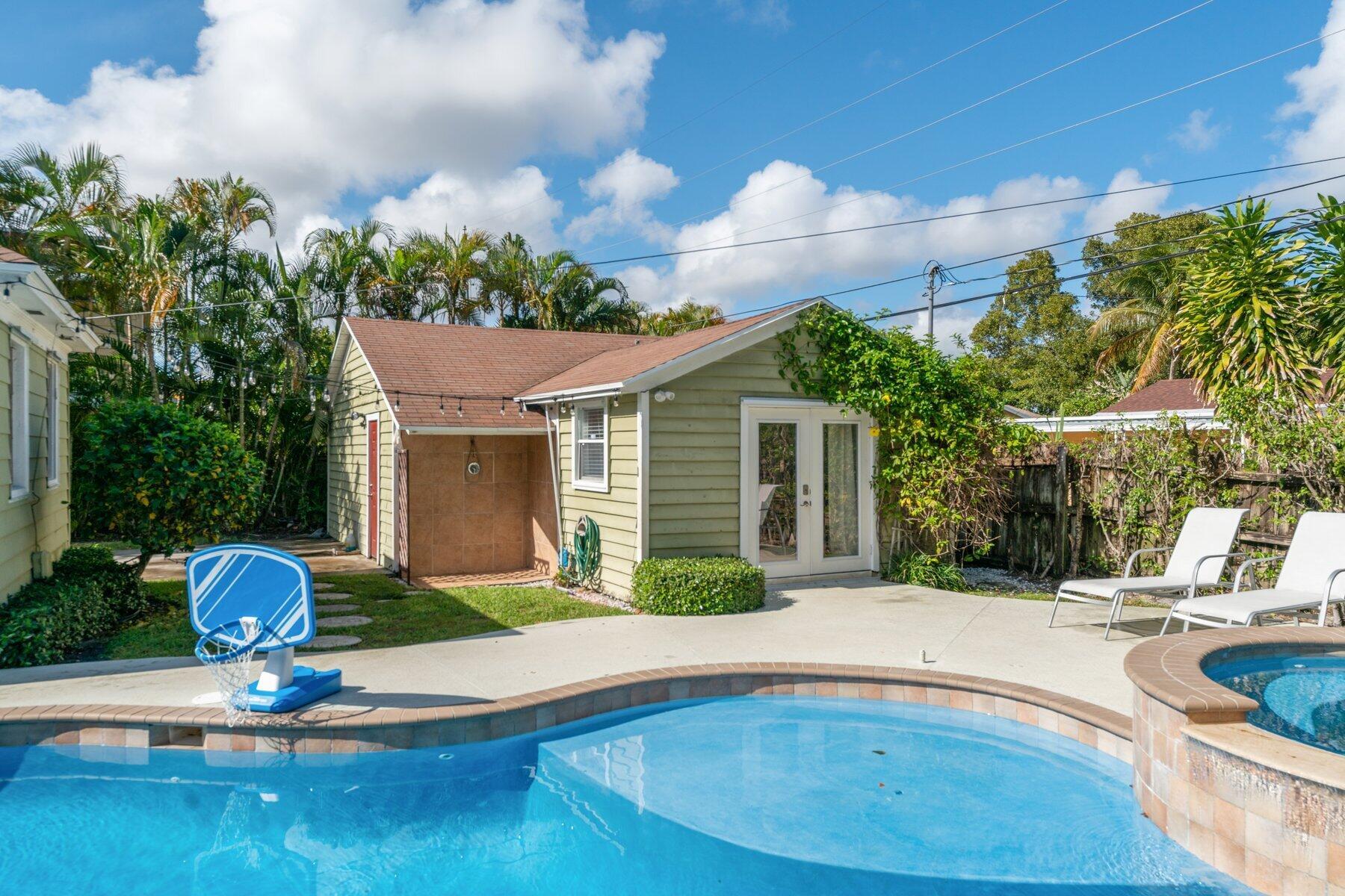 Located in the enchanting Historic Distric of West Palm Beach and only 5 minutes away from the beach is this charming home built in 1941. The main house consists of 2 large bedrooms, a formal dining room and living room with beautiful original hardwood flooring throughout, one spacious updated master bathroom, updated kitchen with stainless steel appliances, granite counter-tops, wood burning fire-place, vaulted ceilings, cedar wood closets in both bedrooms. Out back overlooking the pool, is a cozy little cottage with 1 bedroom, 1 large bathroom, a seperate living area with a washer/dryer, and a kitchenette. Gated driveway with space for a boat or RV. In ground heated salt water pool just recently resurfaced, brand new AC. Perfect for an airbnb, winter get away, or place to call home.