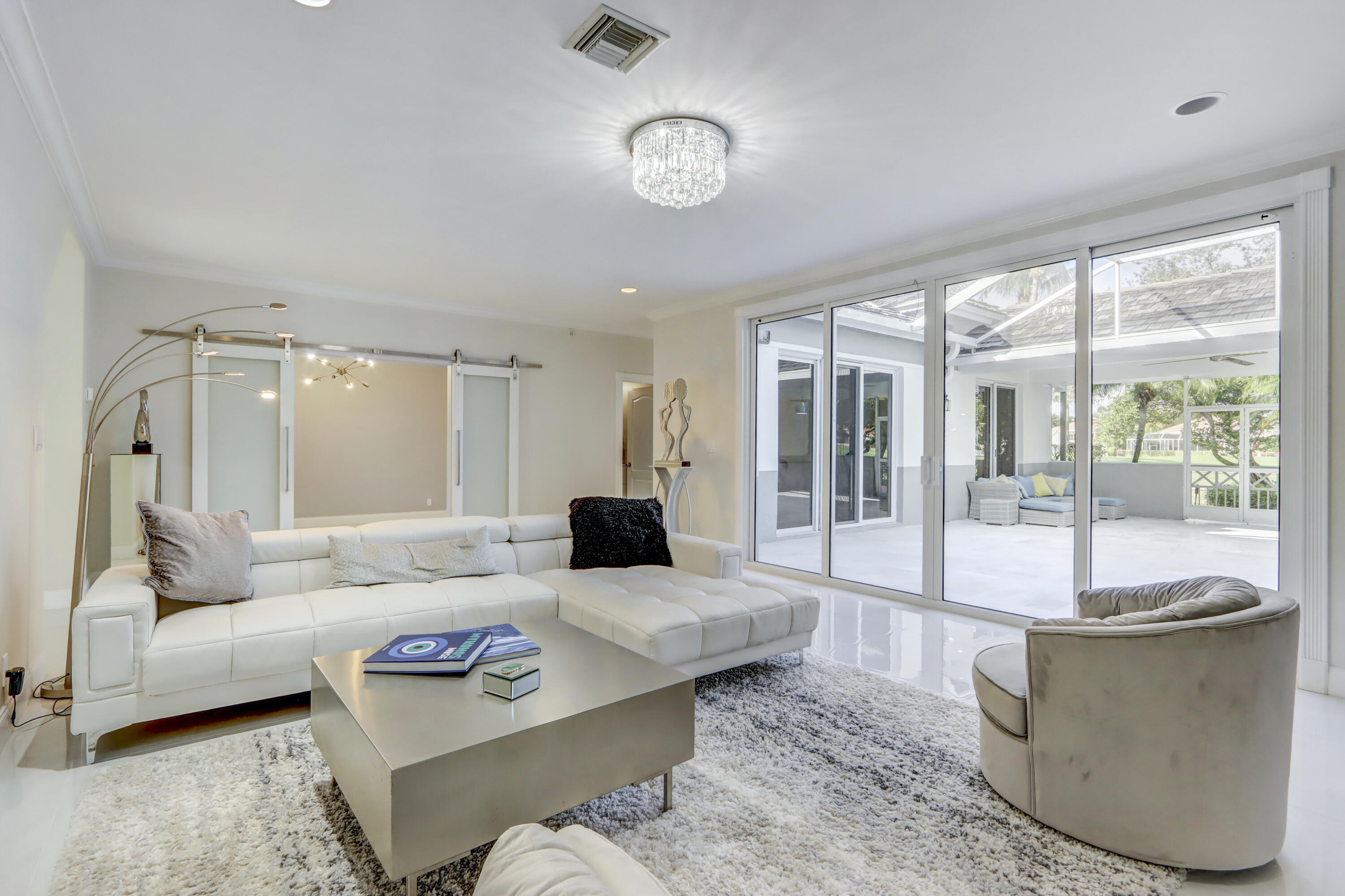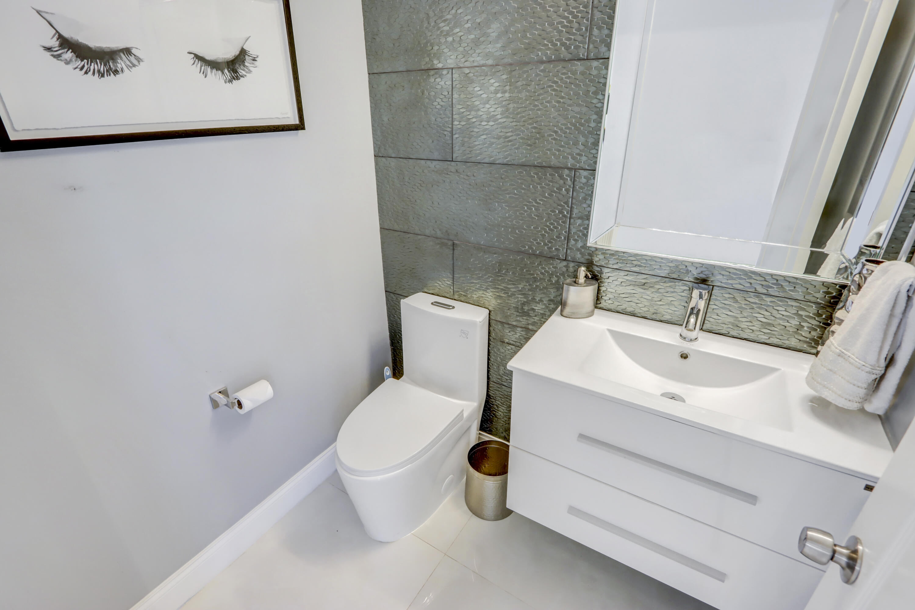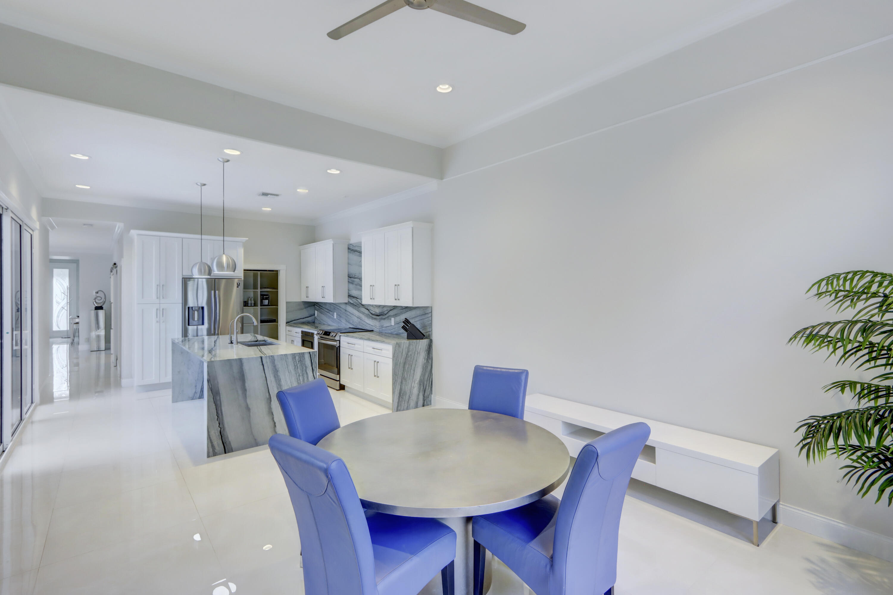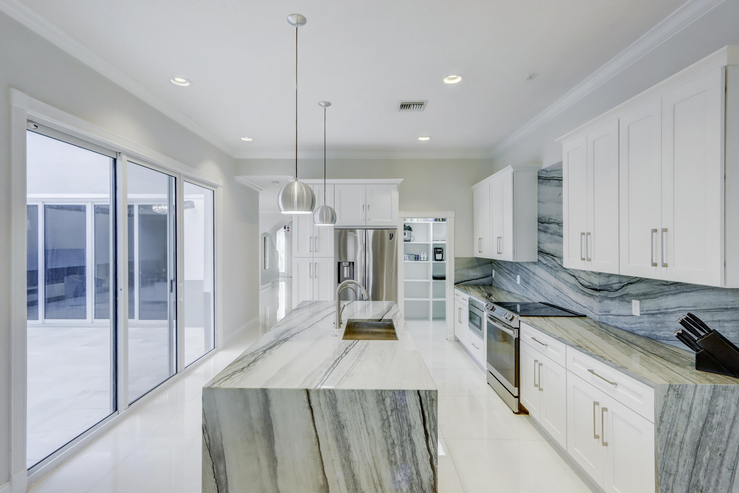 Golf course views fill this remodeled, bright & white townhome of 3 bedrooms & 2 1/2 baths featuring volume ceilings, flat ceiling & wall finish & crown moldings; LED high-hat lighting; 31'' while high-gloss porcelain tile floors down & gray wood-grain porcelain floors up the stairs & through the second floor. The contemporary island kitchen offers 42'' white shaker style cabinetry, custom gray marble counters, backsplash & waterfall,stainless steel appliances & a custom-configured walk-in pantry. White barn doors with opaque glass lead to a dining room or office. The upgraded powder offers pewter-colored tile walls & a white floating vanity. The spacious primary suite has a walk-in & 2 hanging custom-configured closets & a remodeled bathroom with black & white porcelain floors & shower,