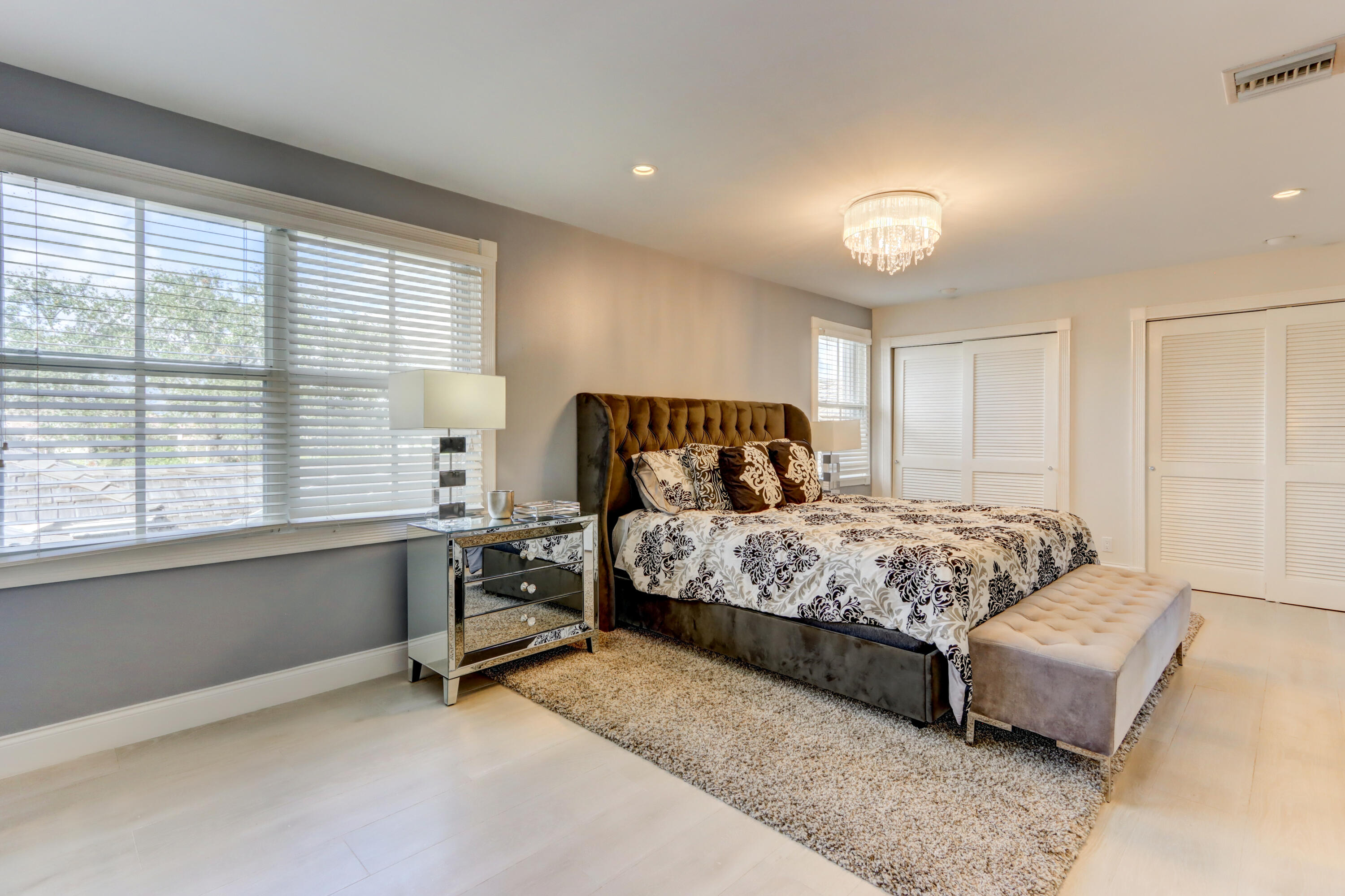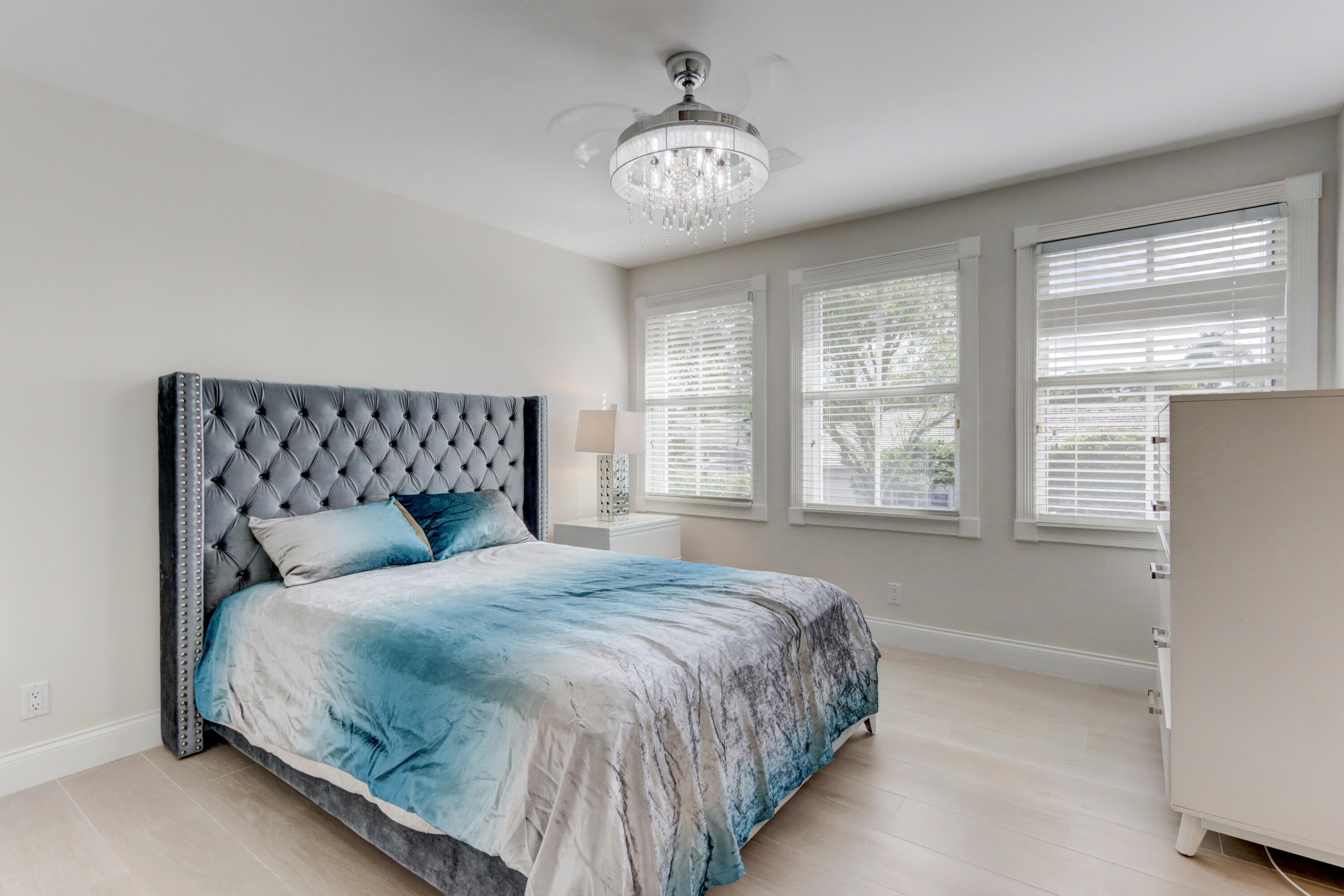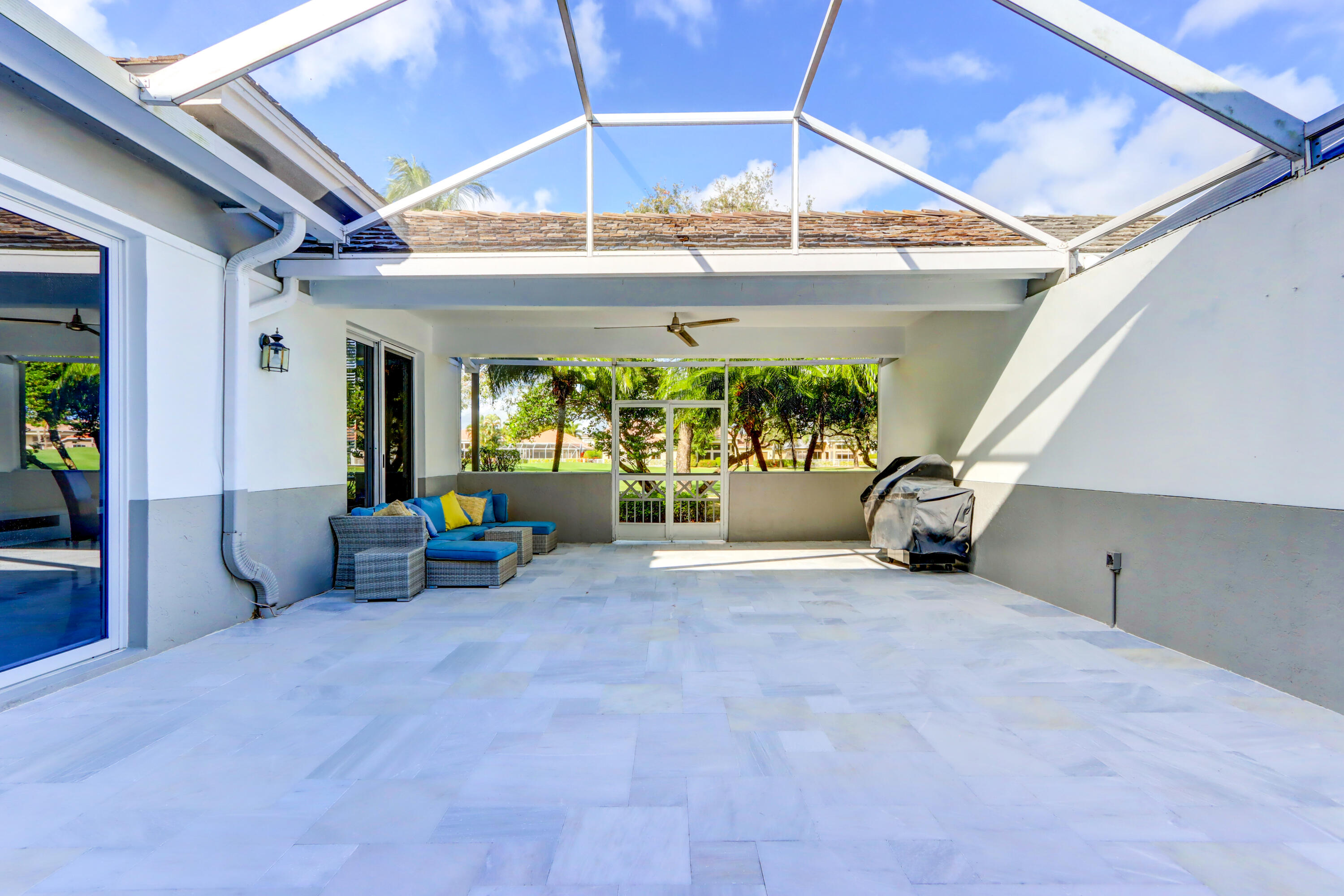 Golf course views fill this remodeled, bright & white townhome of 3 bedrooms & 2 1/2 baths featuring volume ceilings, flat ceiling & wall finish & crown moldings; LED high-hat lighting; 31'' while high-gloss porcelain tile floors down & gray wood-grain porcelain floors up the stairs & through the second floor. The contemporary island kitchen offers 42'' white shaker style cabinetry, custom gray marble counters, backsplash & waterfall,stainless steel appliances & a custom-configured walk-in pantry. White barn doors with opaque glass lead to a dining room or office. The upgraded powder offers pewter-colored tile walls & a white floating vanity. The spacious primary suite has a walk-in & 2 hanging custom-configured closets & a remodeled bathroom with black & white porcelain floors & shower,