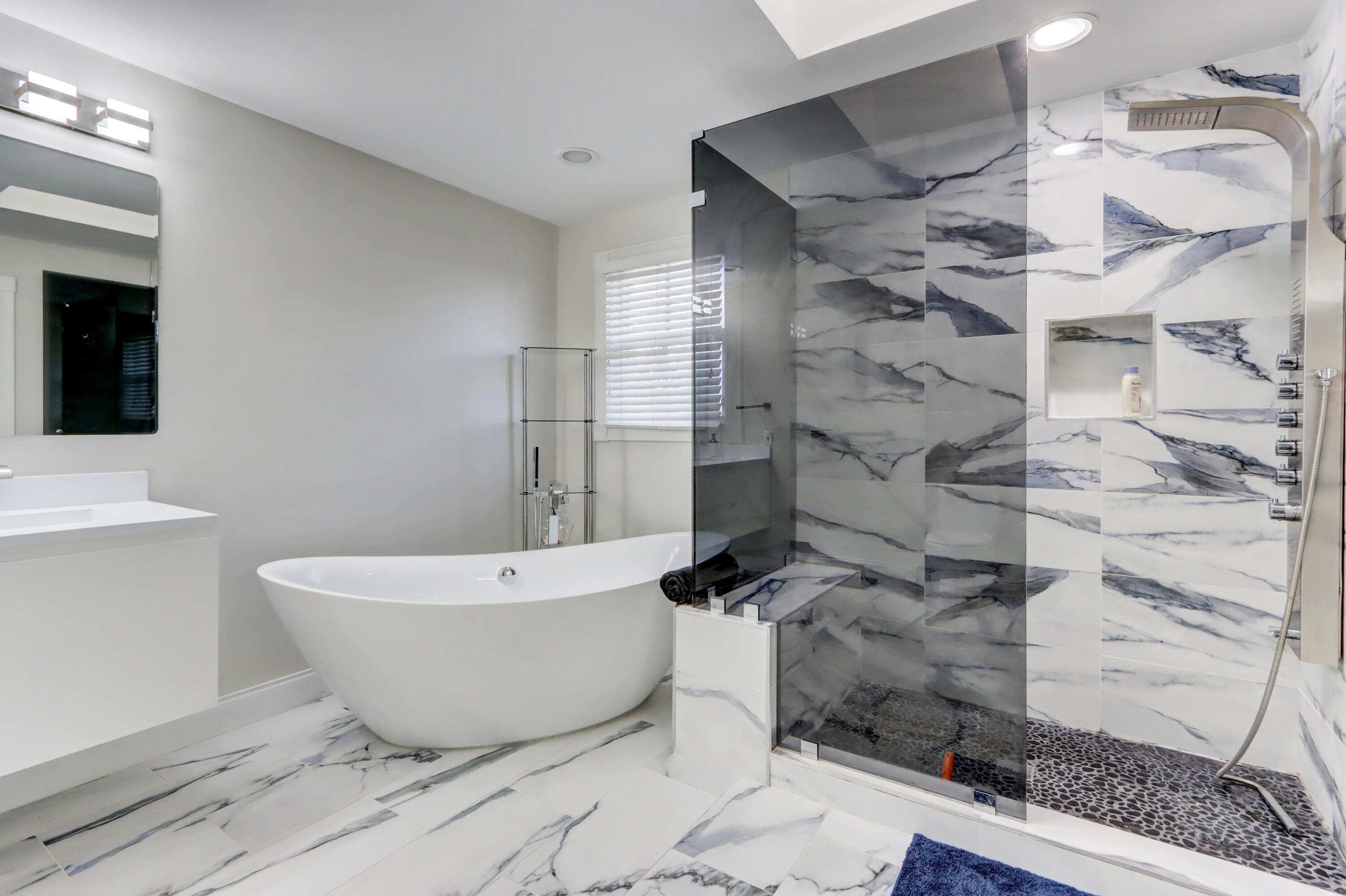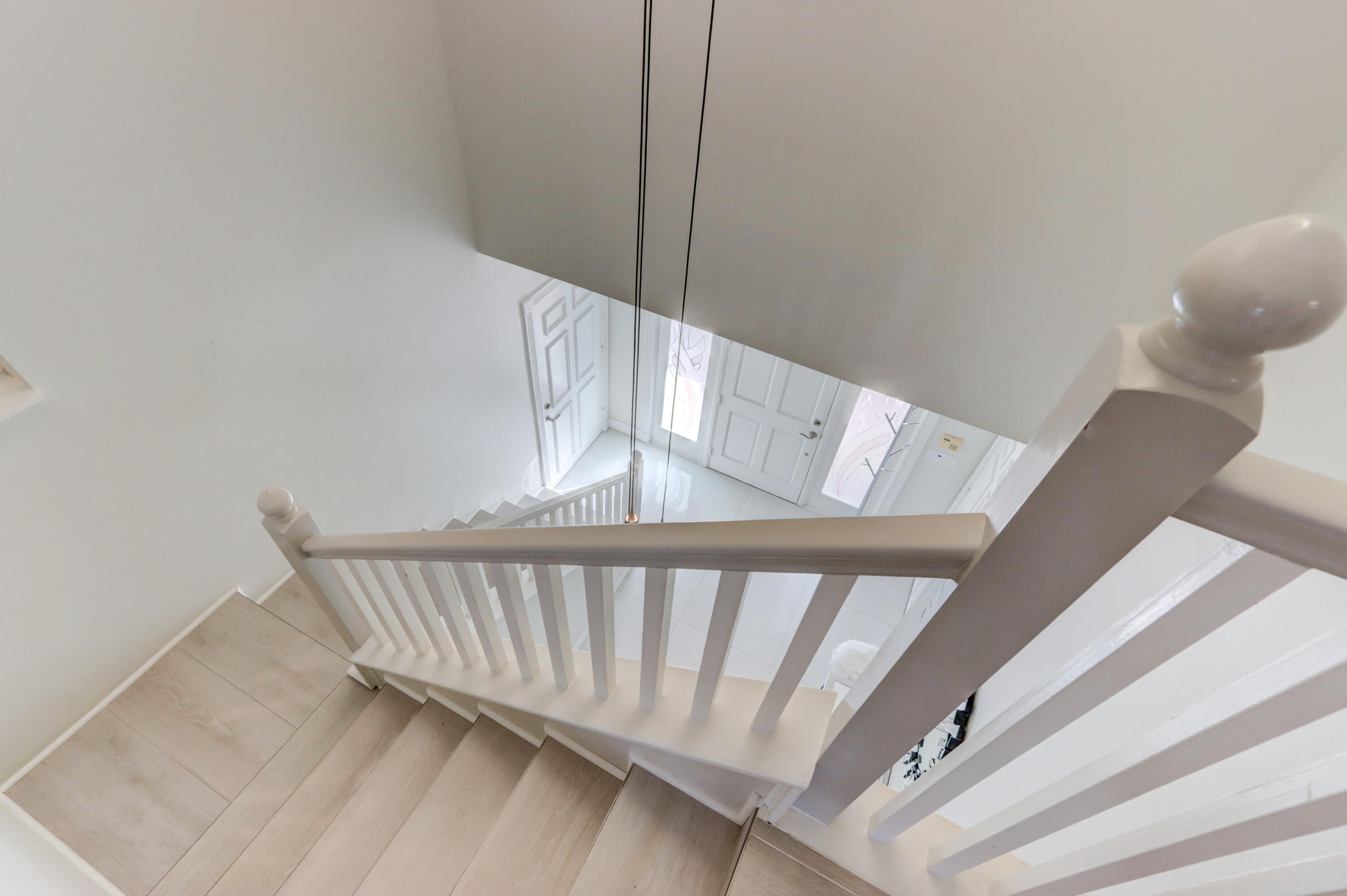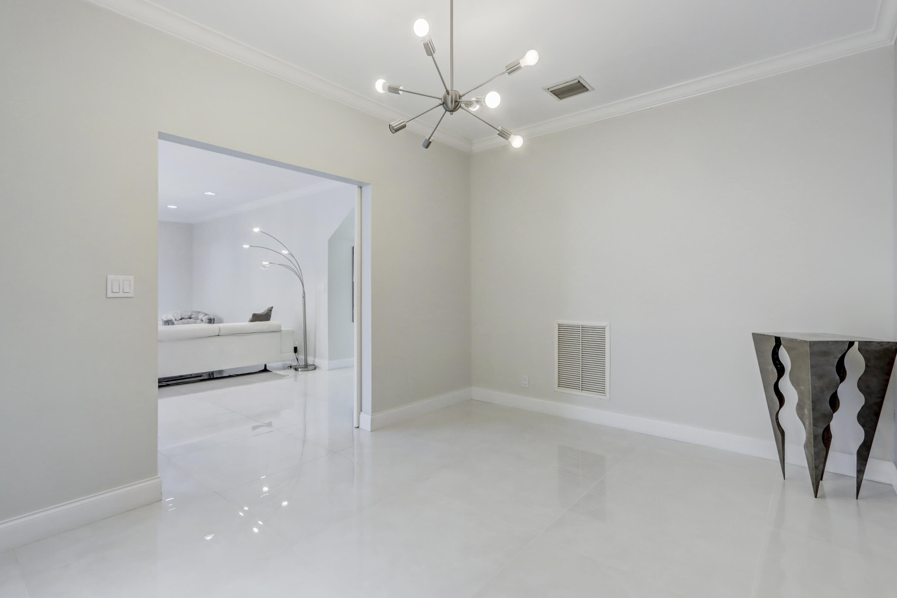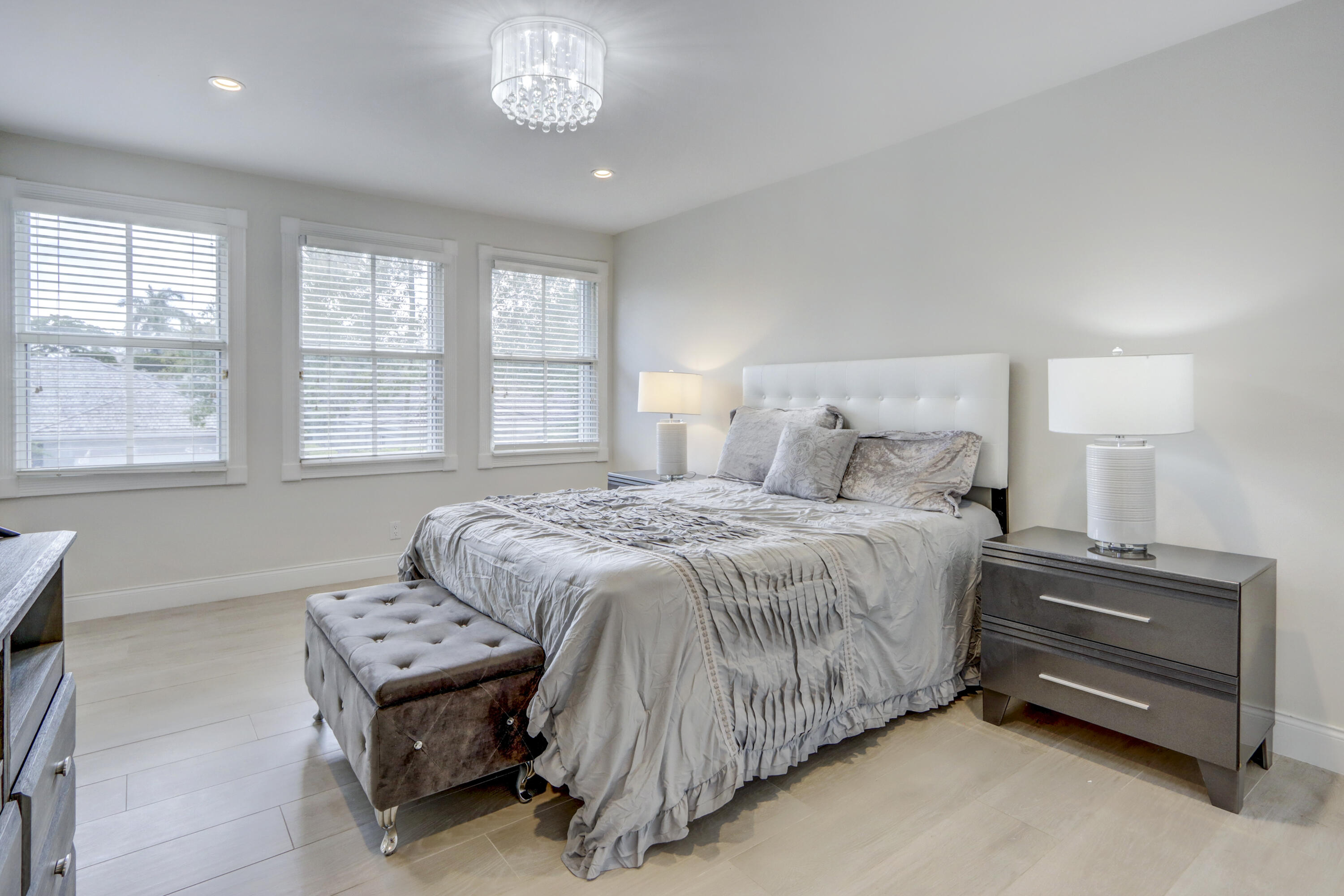 Golf course views fill this remodeled, bright & white townhome of 3 bedrooms & 2 1/2 baths featuring volume ceilings, flat ceiling & wall finish & crown moldings; LED high-hat lighting; 31'' while high-gloss porcelain tile floors down & gray wood-grain porcelain floors up the stairs & through the second floor. The contemporary island kitchen offers 42'' white shaker style cabinetry, custom gray marble counters, backsplash & waterfall,stainless steel appliances & a custom-configured walk-in pantry. White barn doors with opaque glass lead to a dining room or office. The upgraded powder offers pewter-colored tile walls & a white floating vanity. The spacious primary suite has a walk-in & 2 hanging custom-configured closets & a remodeled bathroom with black & white porcelain floors & shower,