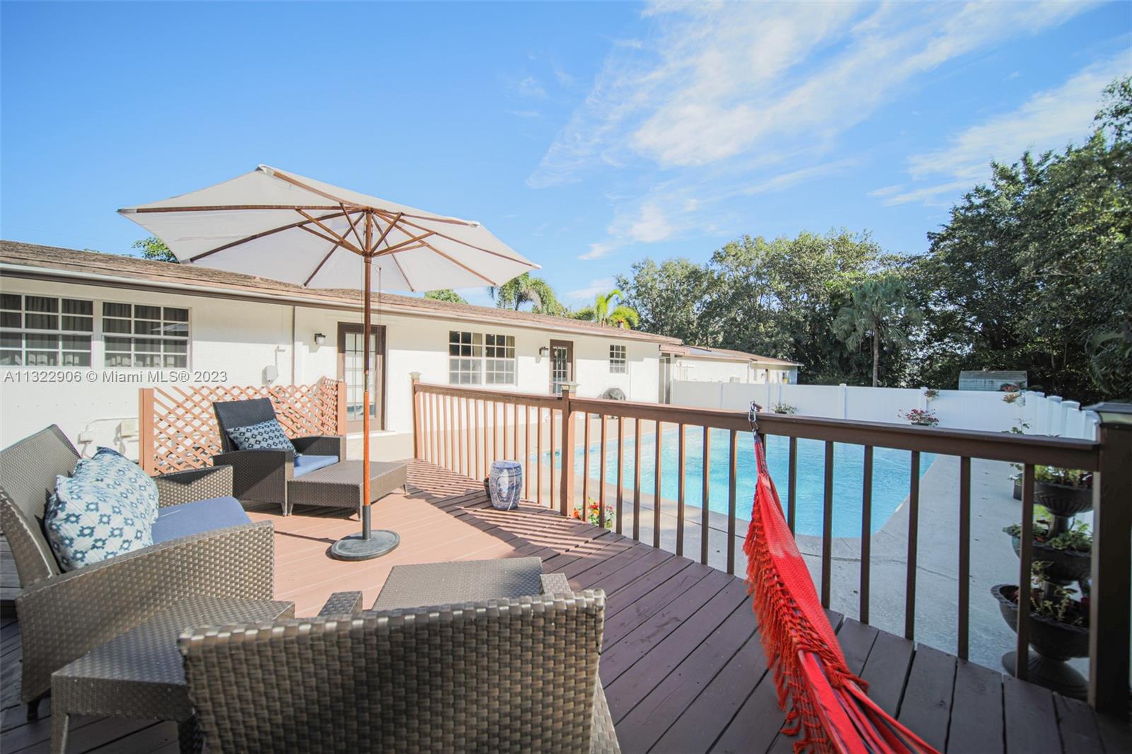 Stunning, newly renovated (2021) one-story 3 BD/2 BA home w/ a spacious sun-filled floor plan! Located in a highly sought-after neighborhood, Plantation Acres. Enjoy a private pond w/ a deck & special seating area. Its open space interior leads to a beautiful wooden deck in a relaxing hedged backyard w/ privacy, a large pool, & spacious outdoor perfect for entertaining. Amenities include a fully-loaded kitchen w/ brand-new KitchenAid chef's appliances, updated finishes in all baths & crown molded frames across home. As a bonus, this home has an income-producing 1 BD/1 BA apt w/ a separate electric meter & tiled floor. Other features 2021 new flat roof, pool pump, & A/C. No HOA, this horse-friendly community is just mins from first-class shopping- Sawgrass Mall, high-end dining, & more!