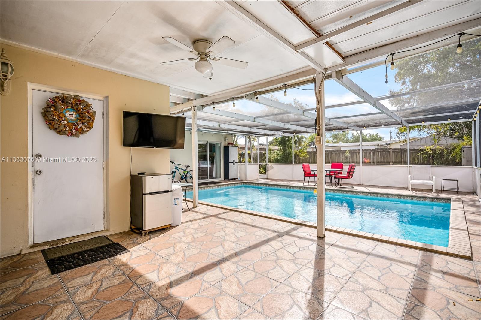 Wow... what a deal! This house is in a quiet, family-friendly neighborhood near the hard rock, restaurants, grocery stores, and much more. The beautiful covered outdoor patio and the large pool was the main feature that captivated the owner. The outdoor space is a perfect area for entertaining and hosting events. It provided a private and relaxing space for lounging on the weekends or after a long stressful day at work. The large pool is enticing during the hot Florida summers. The fenced yard is perfect for pets and provides enough space for a small garden. The house offered a surplus amount of space for a growing family, including a bonus space that is currently used as our entertainment room. The ample space is great for movie nights, playing video games, and spending time with family.
