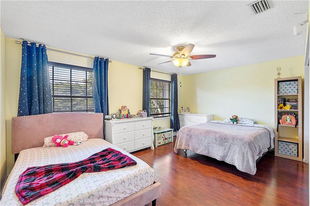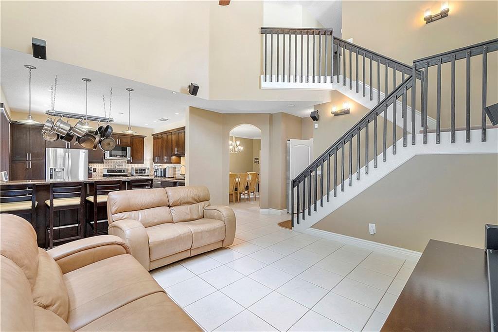 Introducing a beautiful open floor plan! 4 bedroom 2.5 bathrooms located in the desirable gated community of Kensington Green. New Roof (2017) , Travertine pavers for an expanded driveway, walkway, & patio. Impact windows & doors/accordion shutters,insulated garage door, plus a 5 ton AC(2020). Recently painted inside and out. This home boasts a fenced-in backyard for privacy. One bedroom/office on 1st floor. All rooms have high-speed internet & network jacks. Wood laminate floors in all bedrooms. The great room has high ceilings & wired for surround sound. The kitchen boasts granite counters & SS appliances/pot filler. Large trees in the backyard provide privacy. The home is equipped with a fully functional cloud recording alarm system. Low HOA, close to top schools, shops & highways.