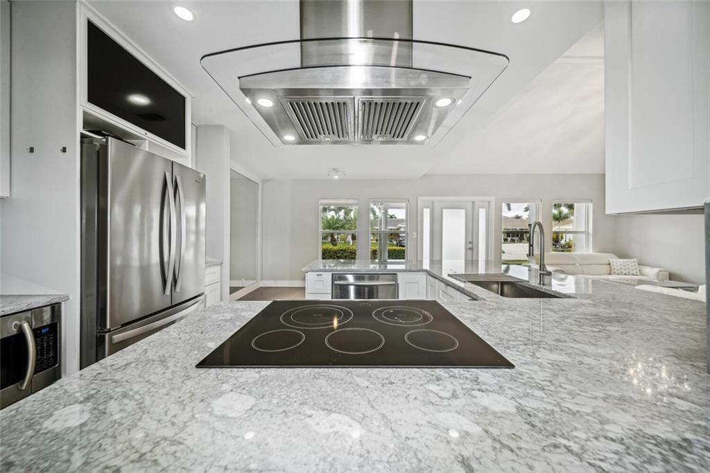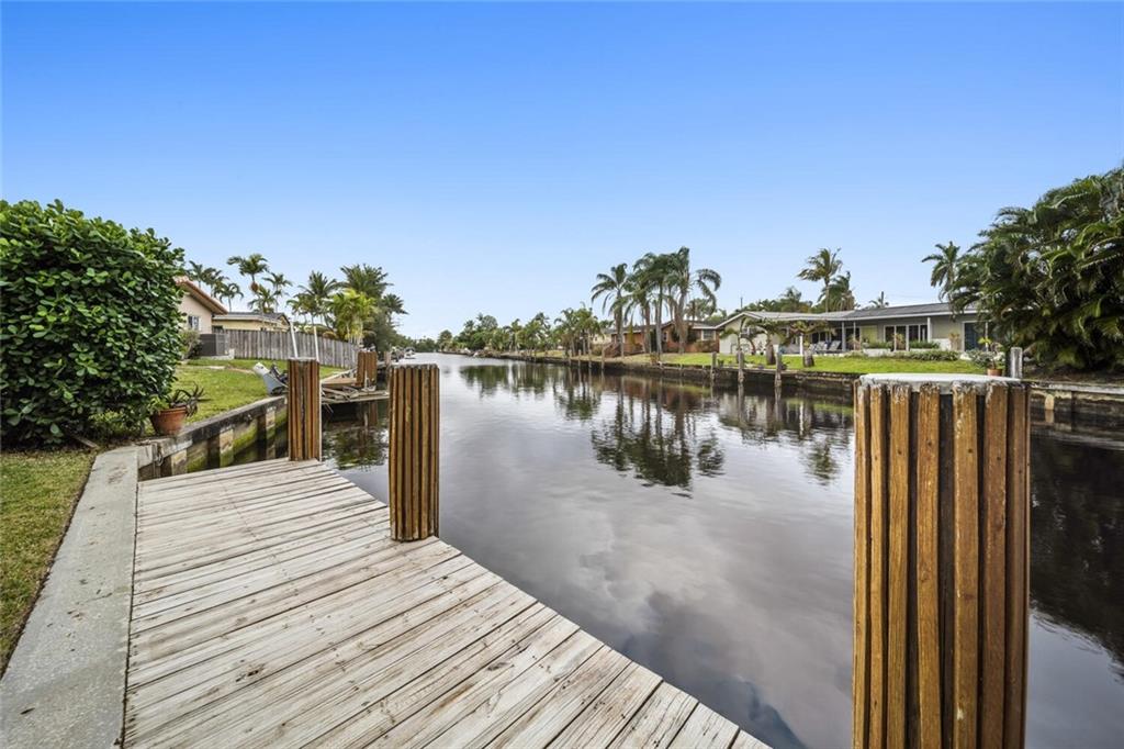 Gorgeously remodeled modern 3 bedroom and 2 bathroom waterfront pool home on an oversize lot located in desirable Coral Ridge Isles. This home features a 2 car garage, an open floor plan consisting of impact windows and doors throughout, large 26" porcelain tile consistent throughout the entire house, and a beautiful white Carrera marble eat-in kitchen. Enjoy your private backyard oasis with large covered porches, sparkling beautiful pool, and a private dock. *Square footage, room measurements, and other measurements are estimated and exact measurements should be independently measured and verified by a licensed professional.