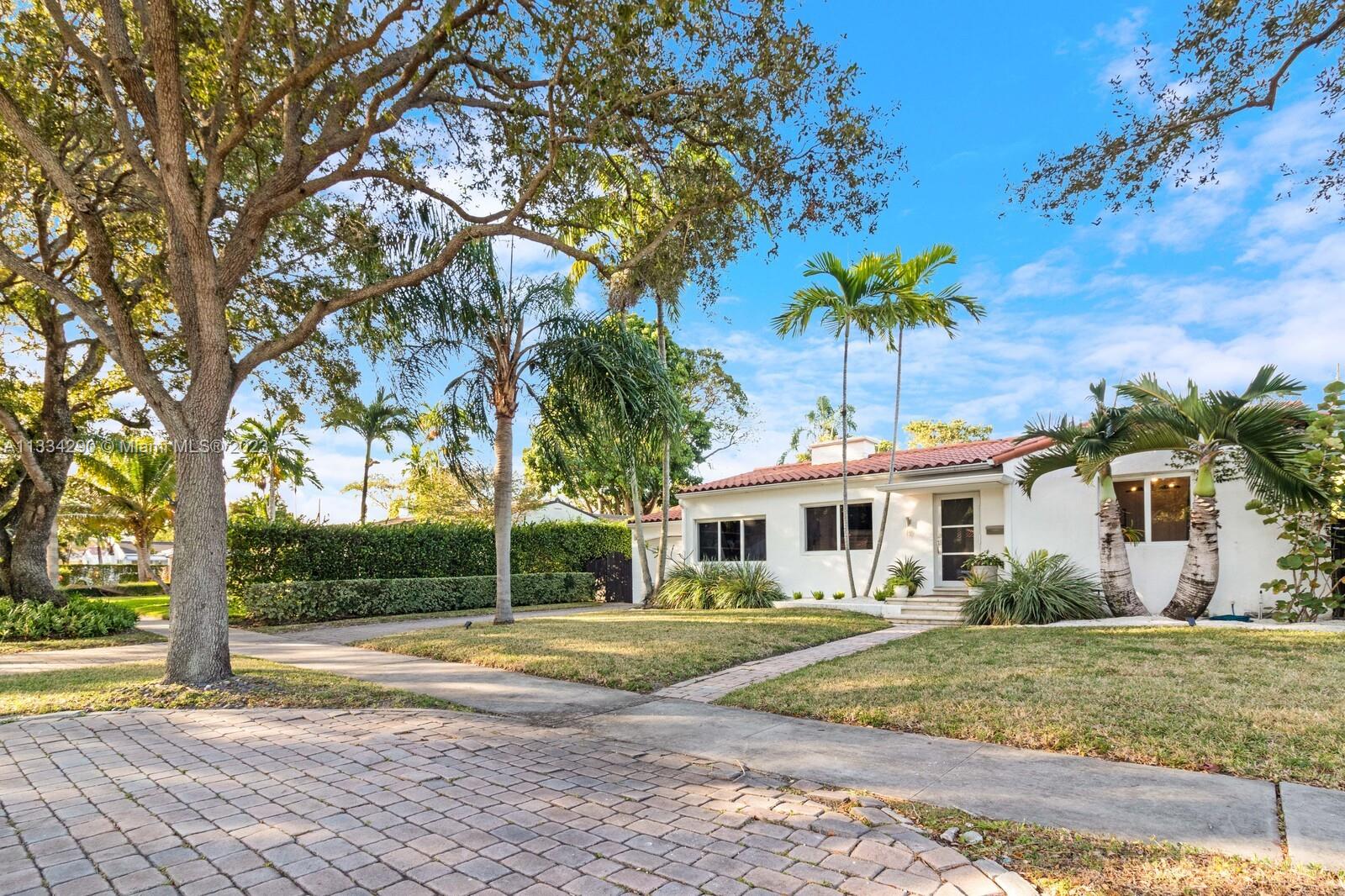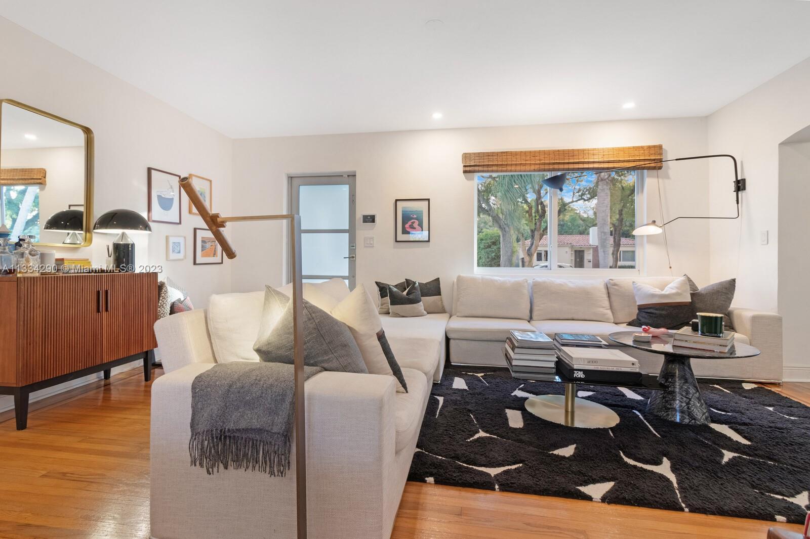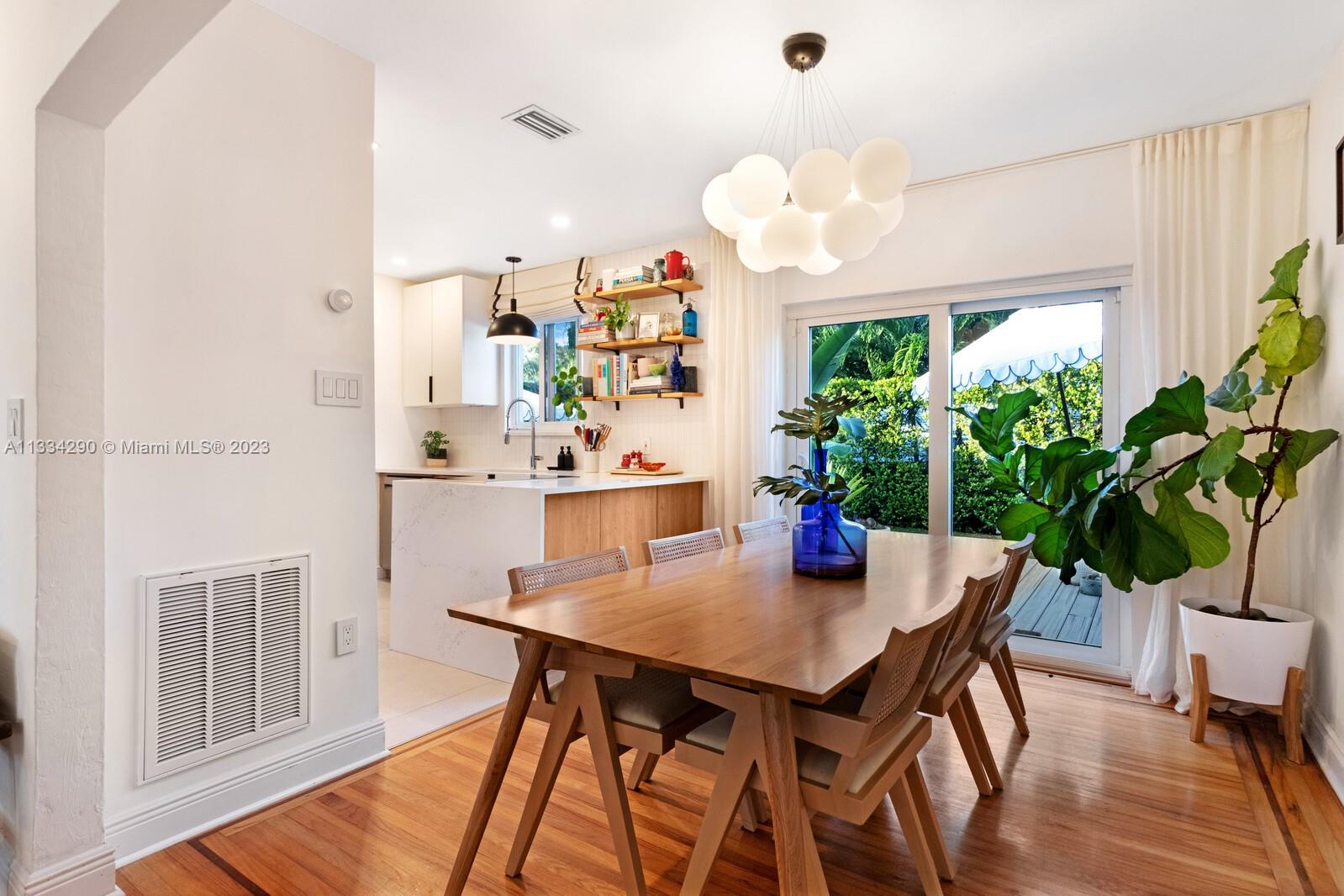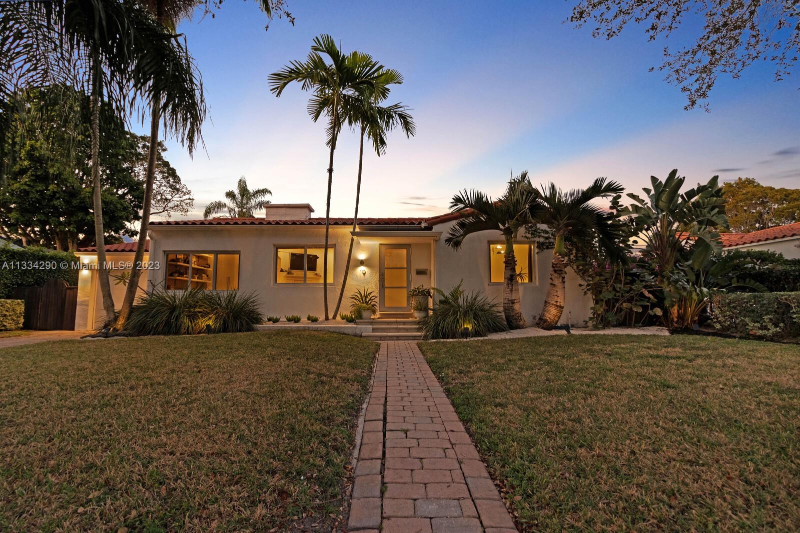 Artfully updated classic Miami Shores home with 2BR plus den & attached garage with laundry on spacious lot with room for a pool. Newly updated kitchen & butler pantry with custom cabinetry to maximize space, specialty cesarstone top, new appliances & 150 bottle wine refrigerator included in the sale. Spa like bathroom with carrera marble & custom teak vanity. Professionally placed lighting throughout with upgraded Lutron dimmers. Tranquil, private backyard with mature lush landscaping. Elevated deck with living area & dining over pavers with ample green space. Updated HVAC, electrical plumbing, new septic, Hurricane Windows & Doors. Move in ready with true 1 car garage plus circular driveway.
