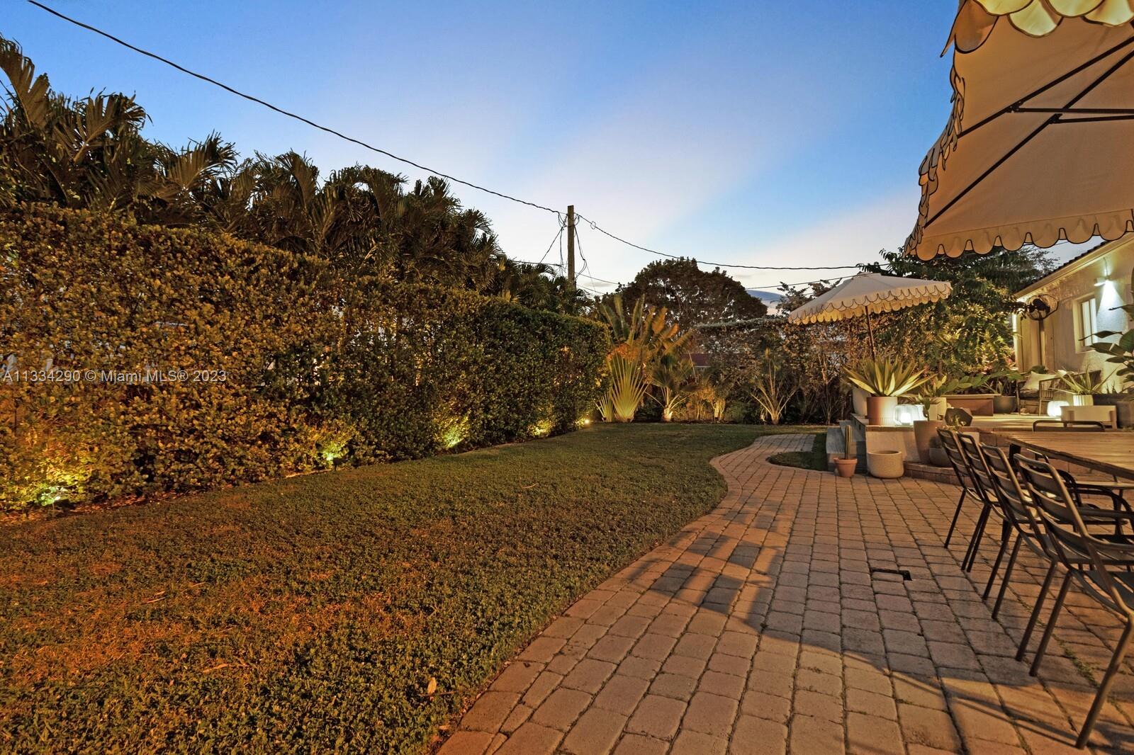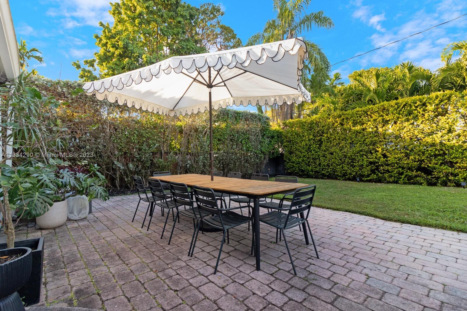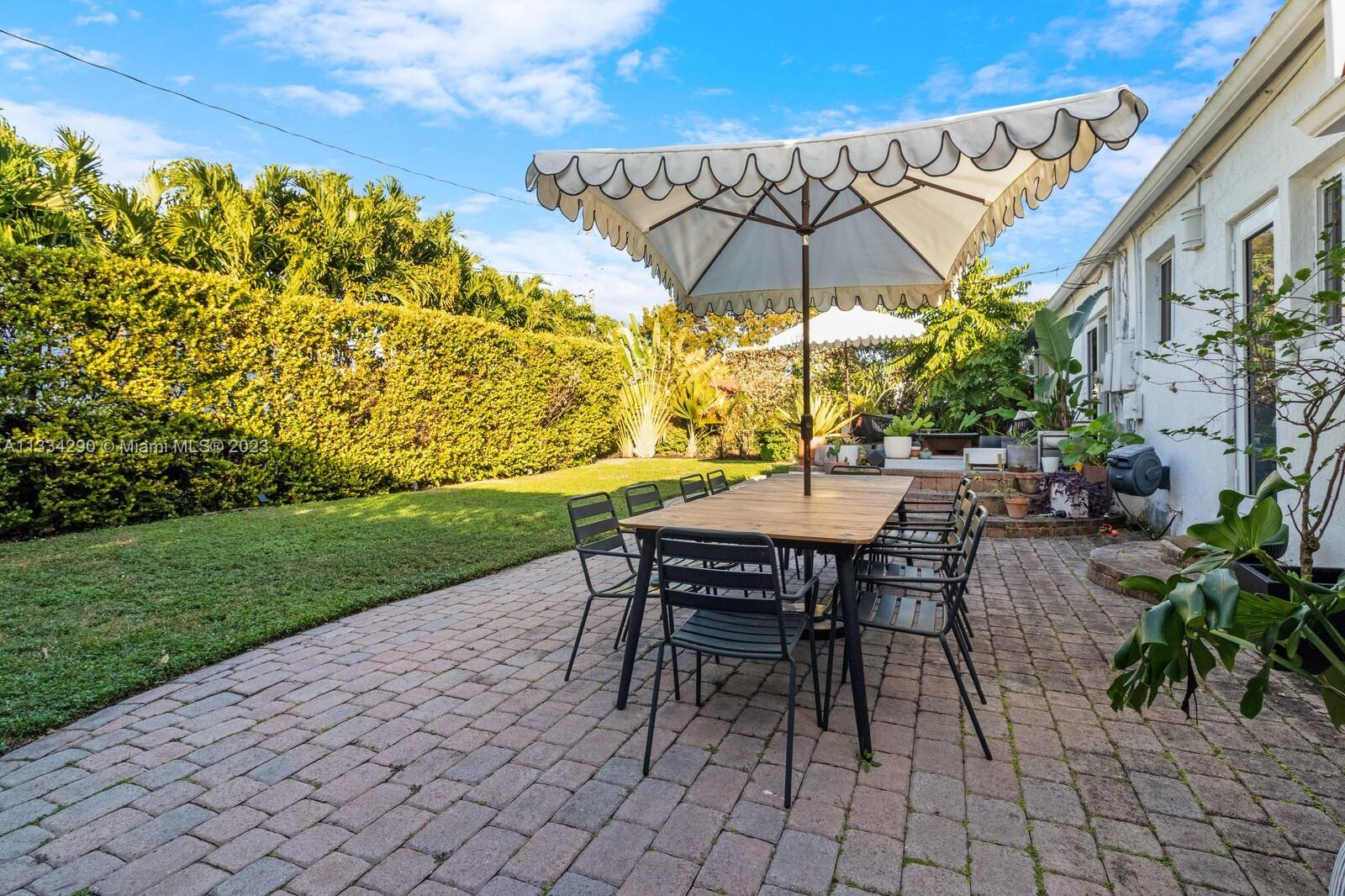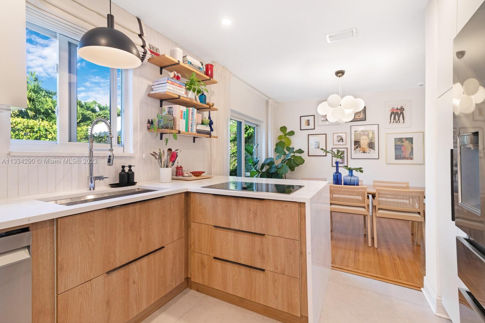 Artfully updated classic Miami Shores home with 2BR plus den & attached garage with laundry on spacious lot with room for a pool. Newly updated kitchen & butler pantry with custom cabinetry to maximize space, specialty cesarstone top, new appliances & 150 bottle wine refrigerator included in the sale. Spa like bathroom with carrera marble & custom teak vanity. Professionally placed lighting throughout with upgraded Lutron dimmers. Tranquil, private backyard with mature lush landscaping. Elevated deck with living area & dining over pavers with ample green space. Updated HVAC, electrical plumbing, new septic, Hurricane Windows & Doors. Move in ready with true 1 car garage plus circular driveway.