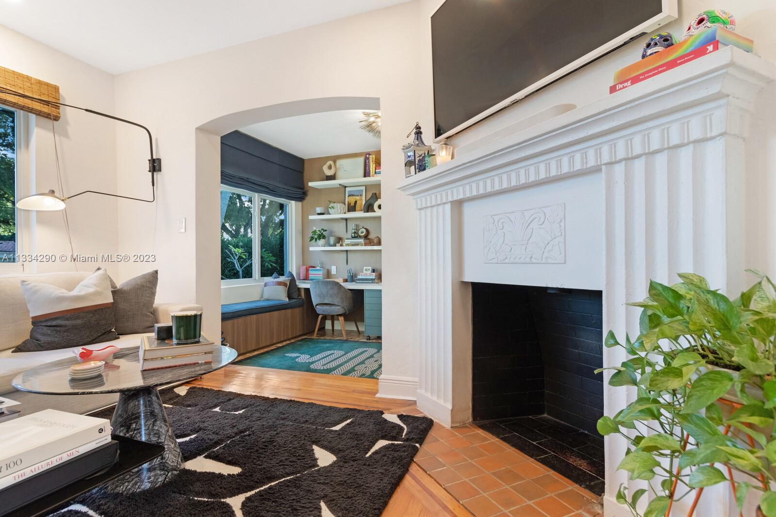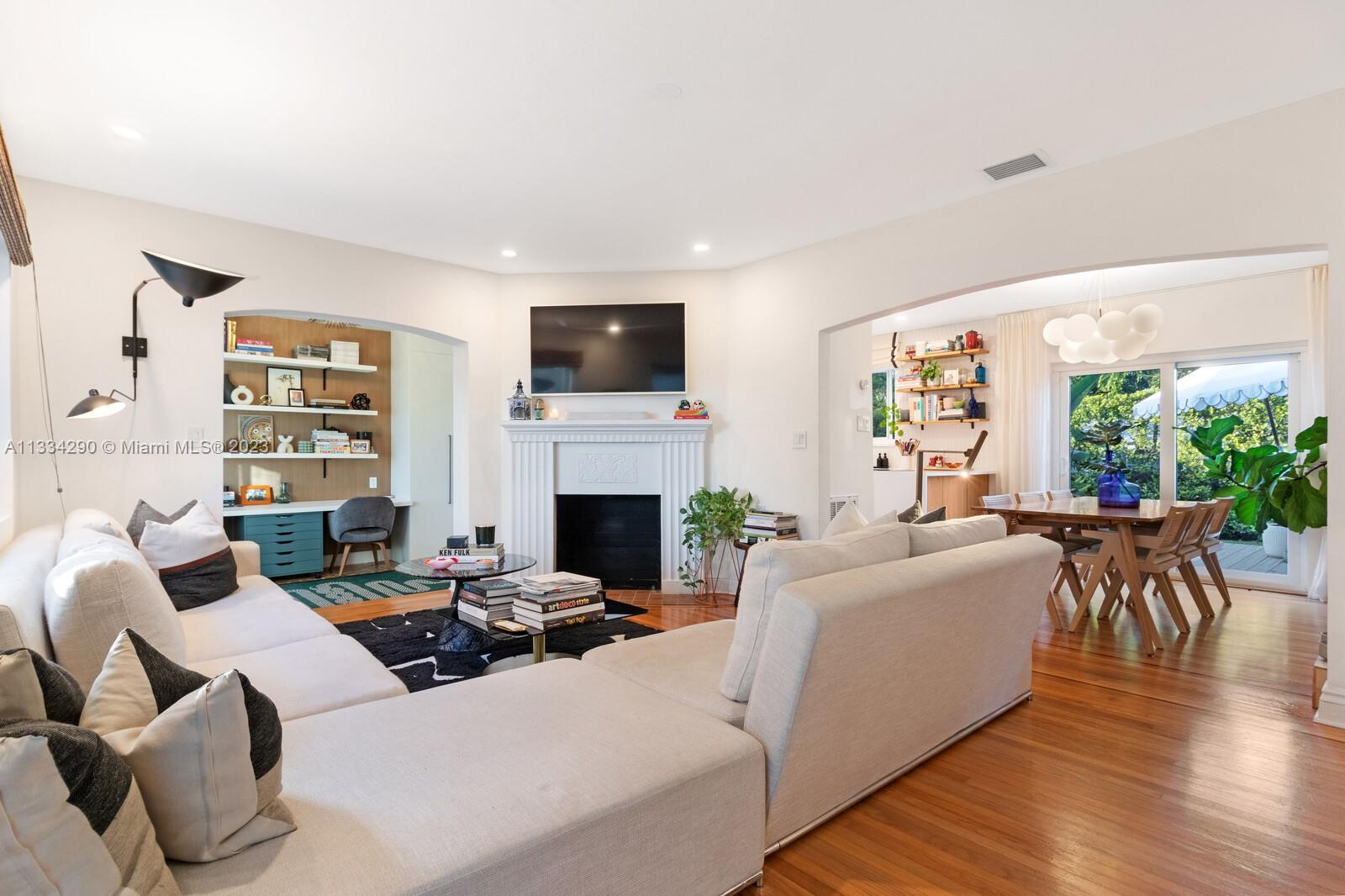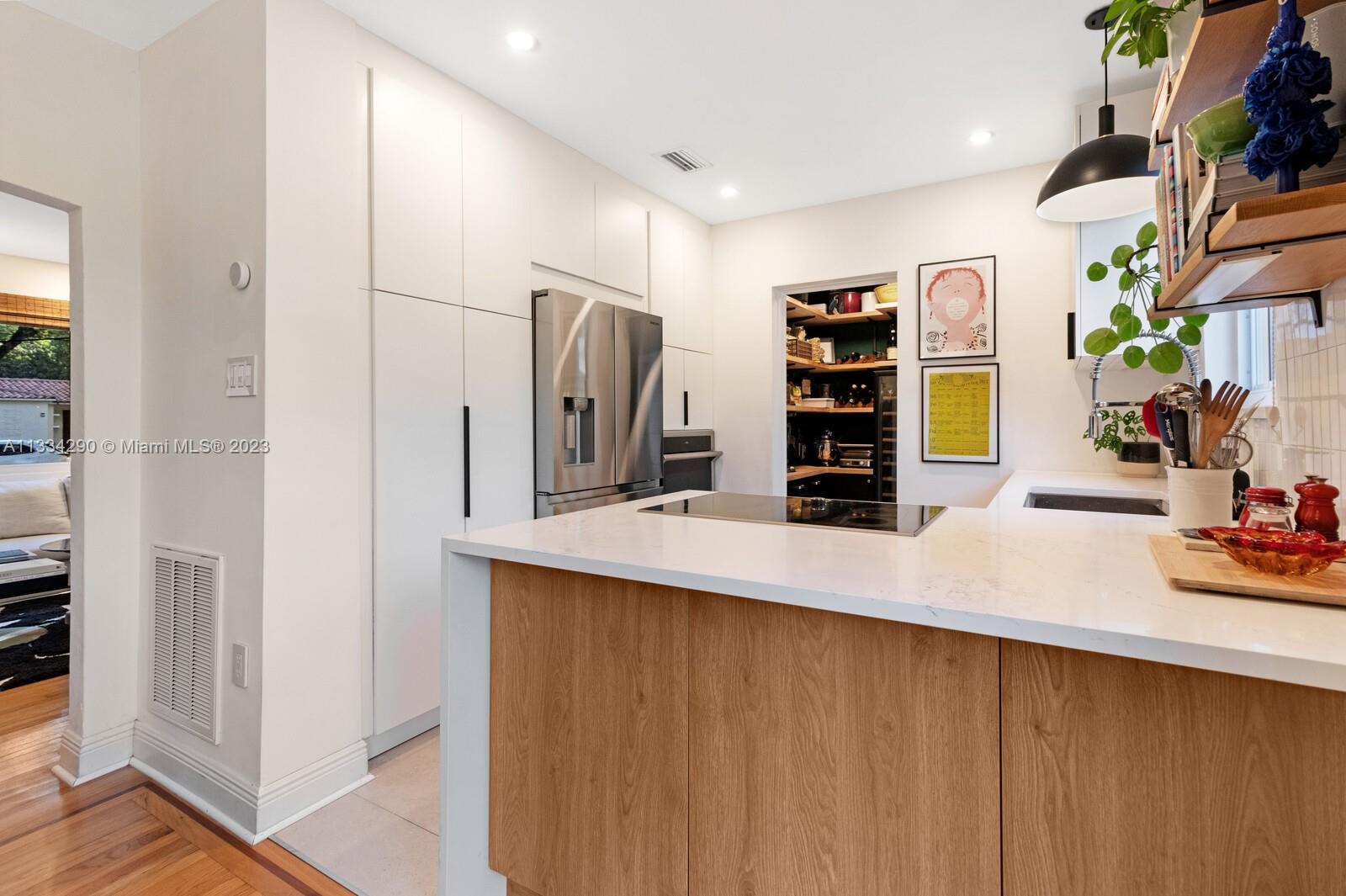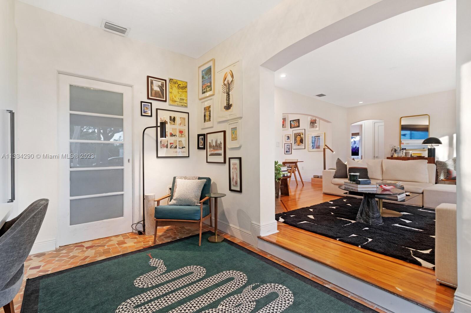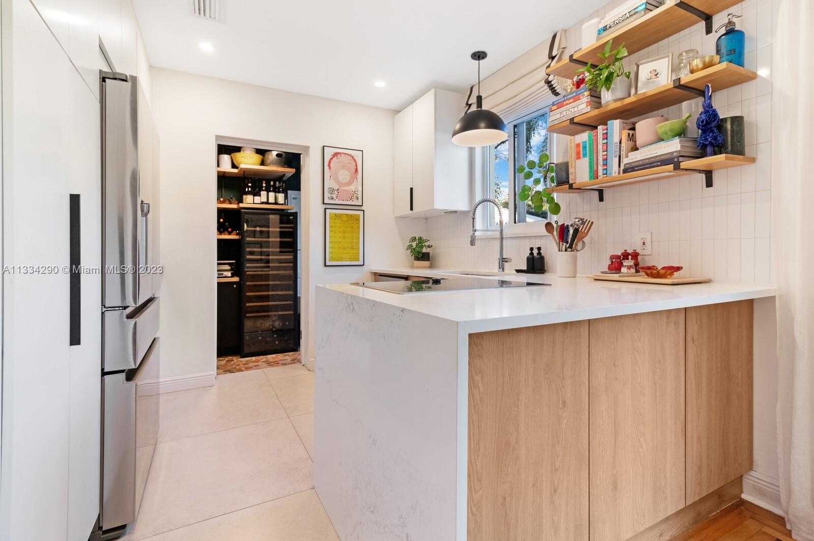 Artfully updated classic Miami Shores home with 2BR plus den & attached garage with laundry on spacious lot with room for a pool. Newly updated kitchen & butler pantry with custom cabinetry to maximize space, specialty cesarstone top, new appliances & 150 bottle wine refrigerator included in the sale. Spa like bathroom with carrera marble & custom teak vanity. Professionally placed lighting throughout with upgraded Lutron dimmers. Tranquil, private backyard with mature lush landscaping. Elevated deck with living area & dining over pavers with ample green space. Updated HVAC, electrical plumbing, new septic, Hurricane Windows & Doors. Move in ready with true 1 car garage plus circular driveway.