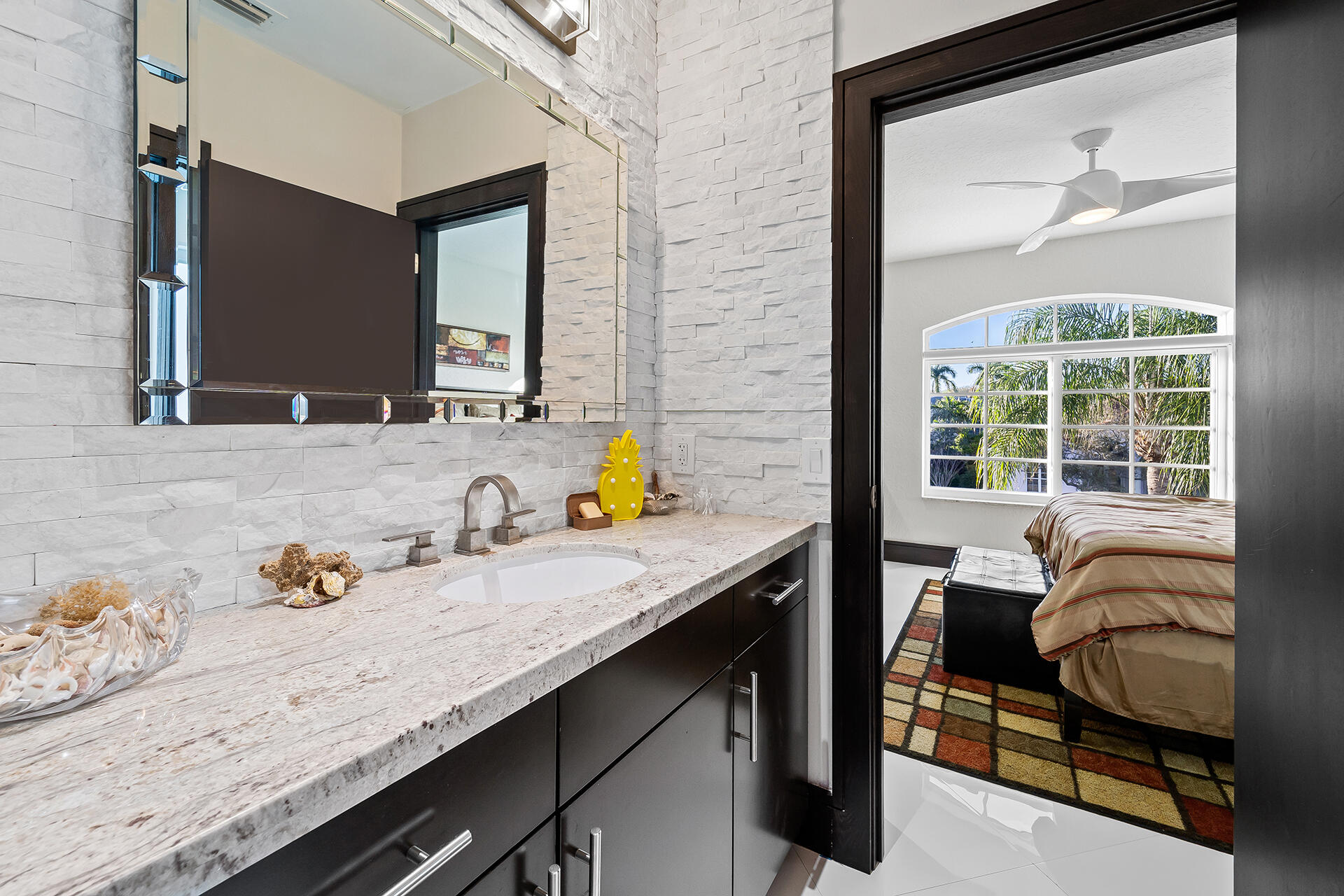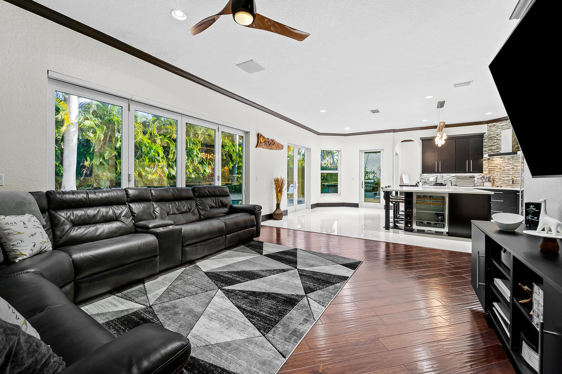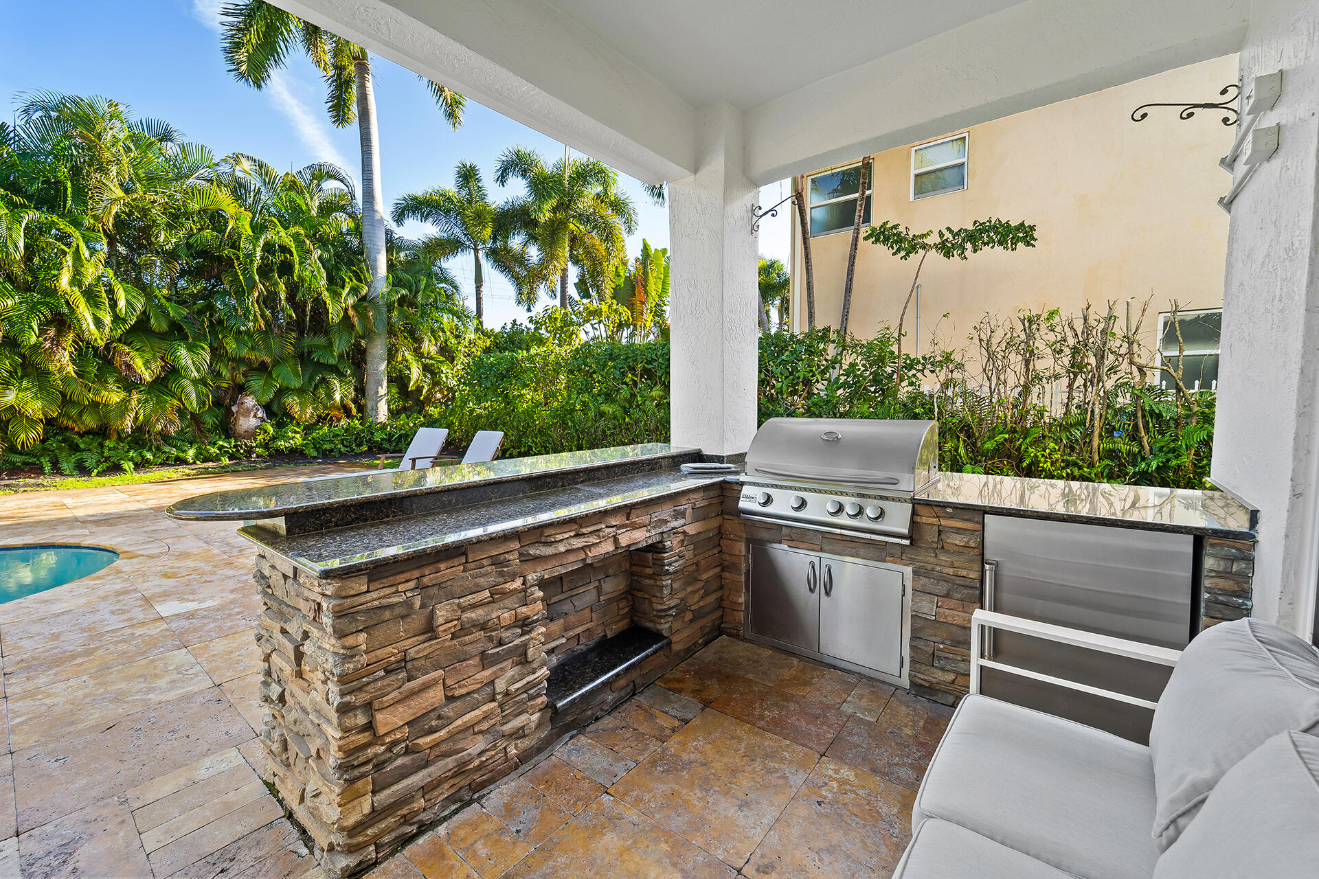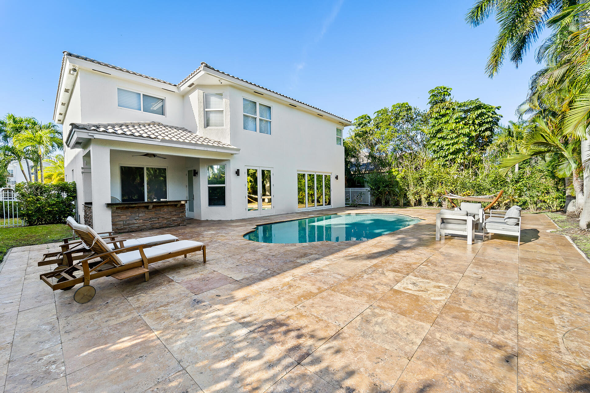 Experience luxury living in Boca Raton, just 2 miles from the beach. Enter through stunning wrought iron double doors into this 4 bed, 3 bath home with oversized impact windows, electric blinds & liquid-glass tile floors. The kitchen is a chef's dream with marble countertops, induction stove & sub-zero refrigeration, opening to a spacious family room. The primary suite boasts 3 walk-in closets & a primary bath with double sinks, jetted tub & standing shower. The backyard offers a travertine pool deck & patio with a built-in summer kitchen and a back fence lined with Areca Palms for ultimate privacy. Don't miss out on this dream home!