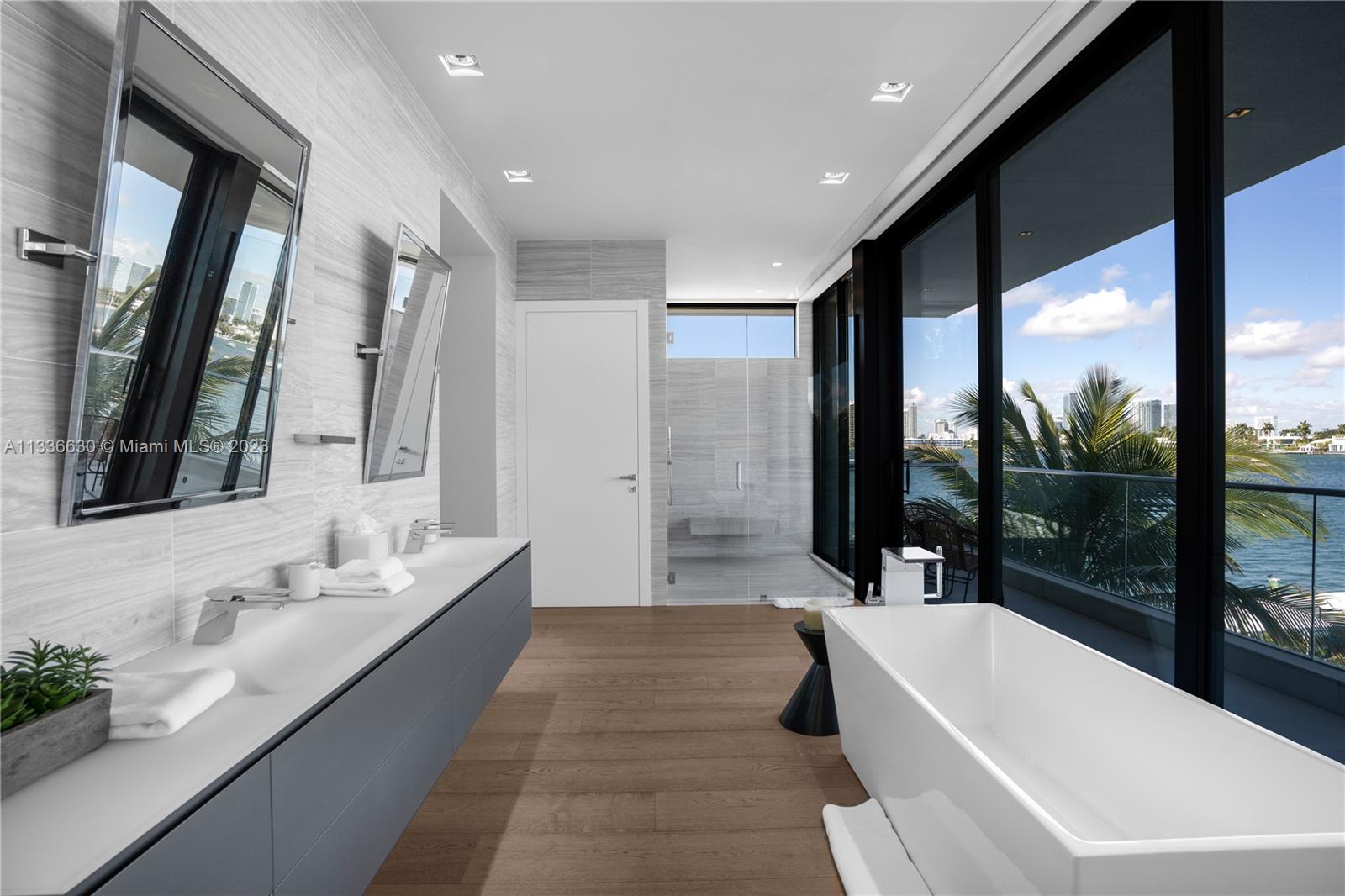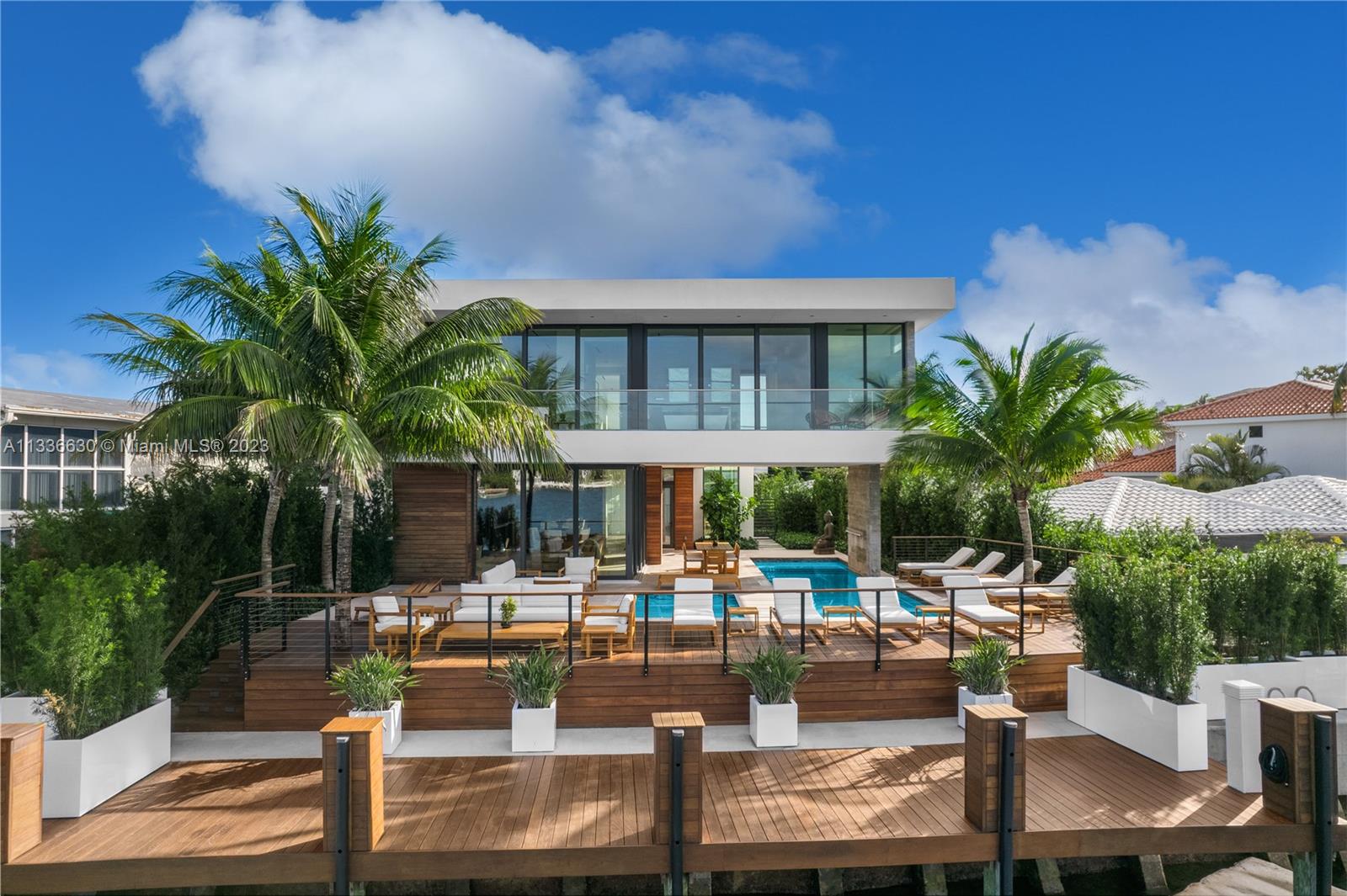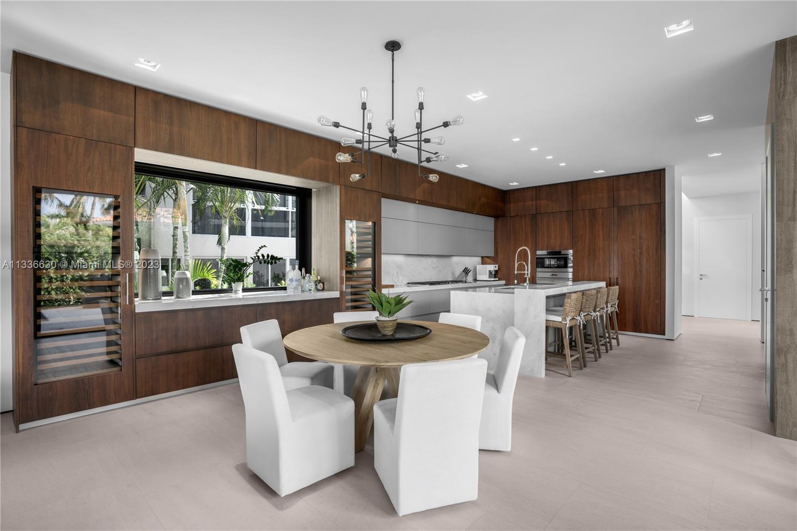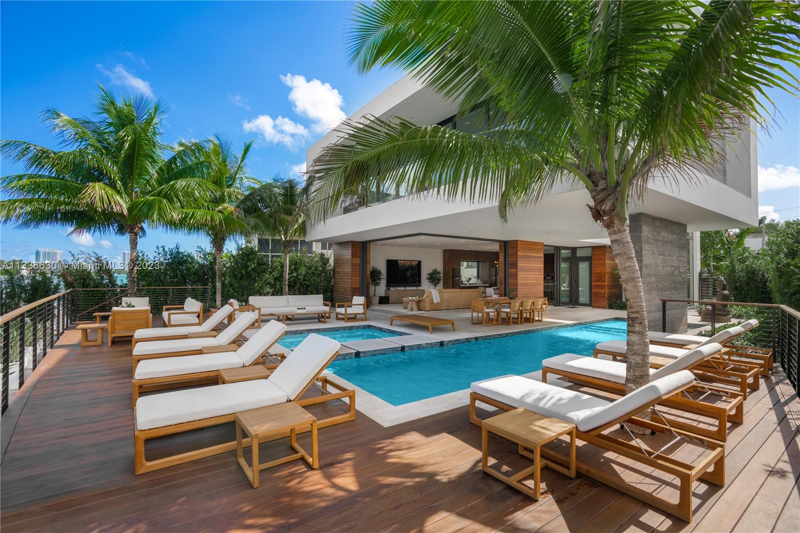 Stunning tropical modern home with westerly sunset views located on prestigious Hibiscus Island with 24/7 police guarded gated entrance. Wide bay Biscayne views upon entry to this luxury home, masterfully designed in 2017 by award-winning architect Choeff Levy Fischman. Indoor/outdoor living on ground floor is perfect for entertaining with its open dining and family areas, with five bedrooms and office area, spacious master bedroom with dramatic water views. Featuring custom Italian kitchen, oak wood floors, Crestron smart home system, floor to ceiling windows and a two car garage. New Ipe rear deck decking with expansive relaxing outdoor area, and lush landscaping provides resort style oasis rear yard including a salt water pool and spa, and private dock.