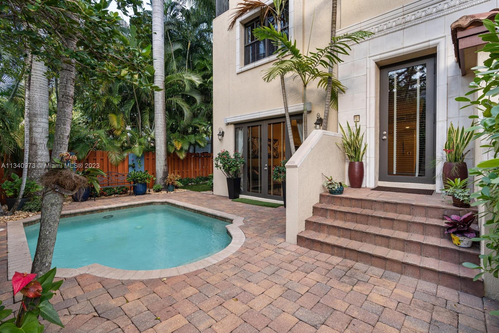 Magnificent Victoria Park townhome boasting high ceilings, 4 bedrooms, 3.5 bathrooms, large den, double car garage and a private pool. Sold furnished or unfurnished. First floor features a kitchen with solid wood cabinets, granite countertops and Bosch appliances, spacious dining room, living area & a half bathroom. Second floor includes a master bedroom suite, two bedrooms, a bathroom and a laundry room. Third floor houses the 4th bedroom (doubles as office), full bathroom and a den. Two rooftop terraces, perfect for entertaining, with breathtaking views of downtown. Located near Las Olas, Flagler Village and a bike ride from the beach, this property offers urban conveniences while situated in a peaceful neighborhood. Both ACs replaced last year with high efficiency units. Saltwater pool