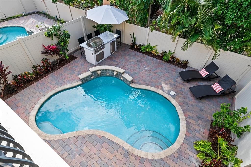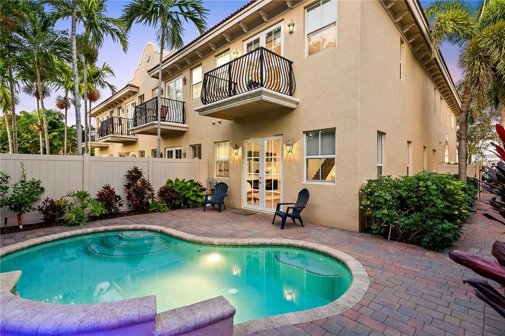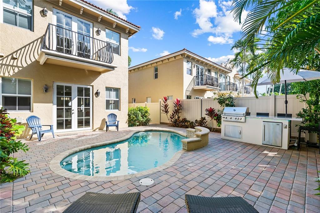 Corner Townhome, updated & inspired by contemporary design. Ideal for today's lifestyle w/a spacious & luminous open flr plan, enhanced by vol. ceilings & modern accents. The open kitchen w/tremendous counter space & snack bar overlooks the dining area, custom bar & great rm. French doors open to the oversized tropical backyard, a lrg. free form pool, patio, & custom BBQ equipped w/an entertaining area for dining, lighting & bluetooth sound system. The spacious primary suite provides the ultimate retreat w/an open balcony overlooking the pool & patio area, 2 custom walk-in closets & spa inspired bathrm w/a Jacuzzi & large walk-in shower. The Jr. Primary suite has 2 open balconies & the 3r br. is currently used as an office. Mins to shopping, restaurants, parks & the beach. Sq ft from BCPA