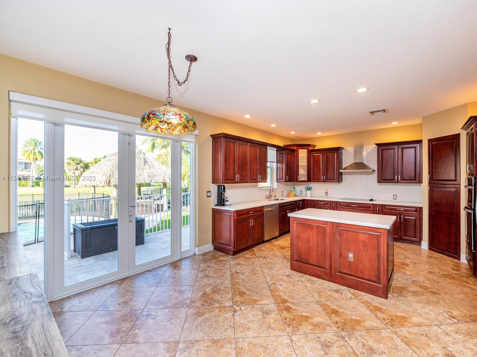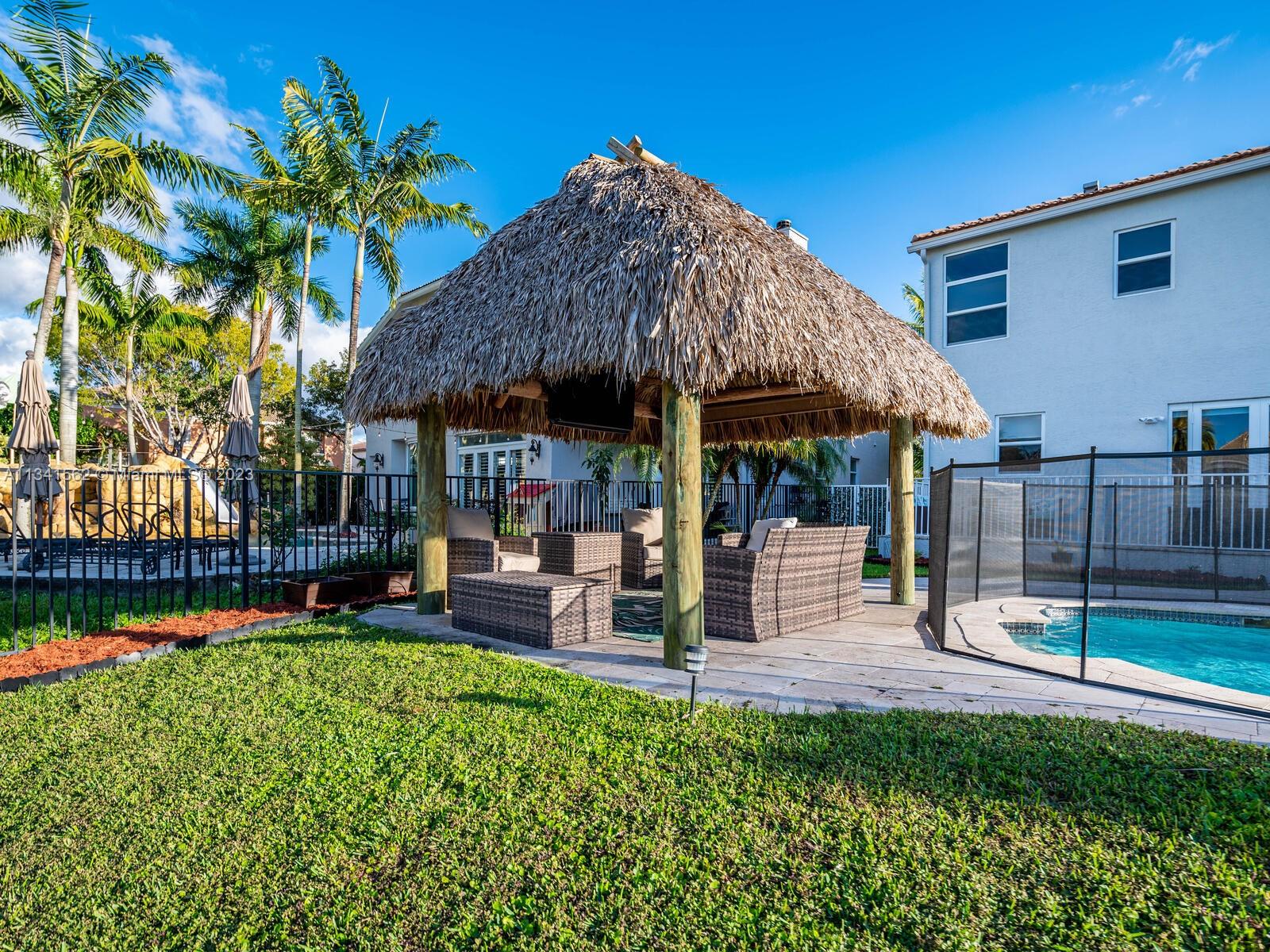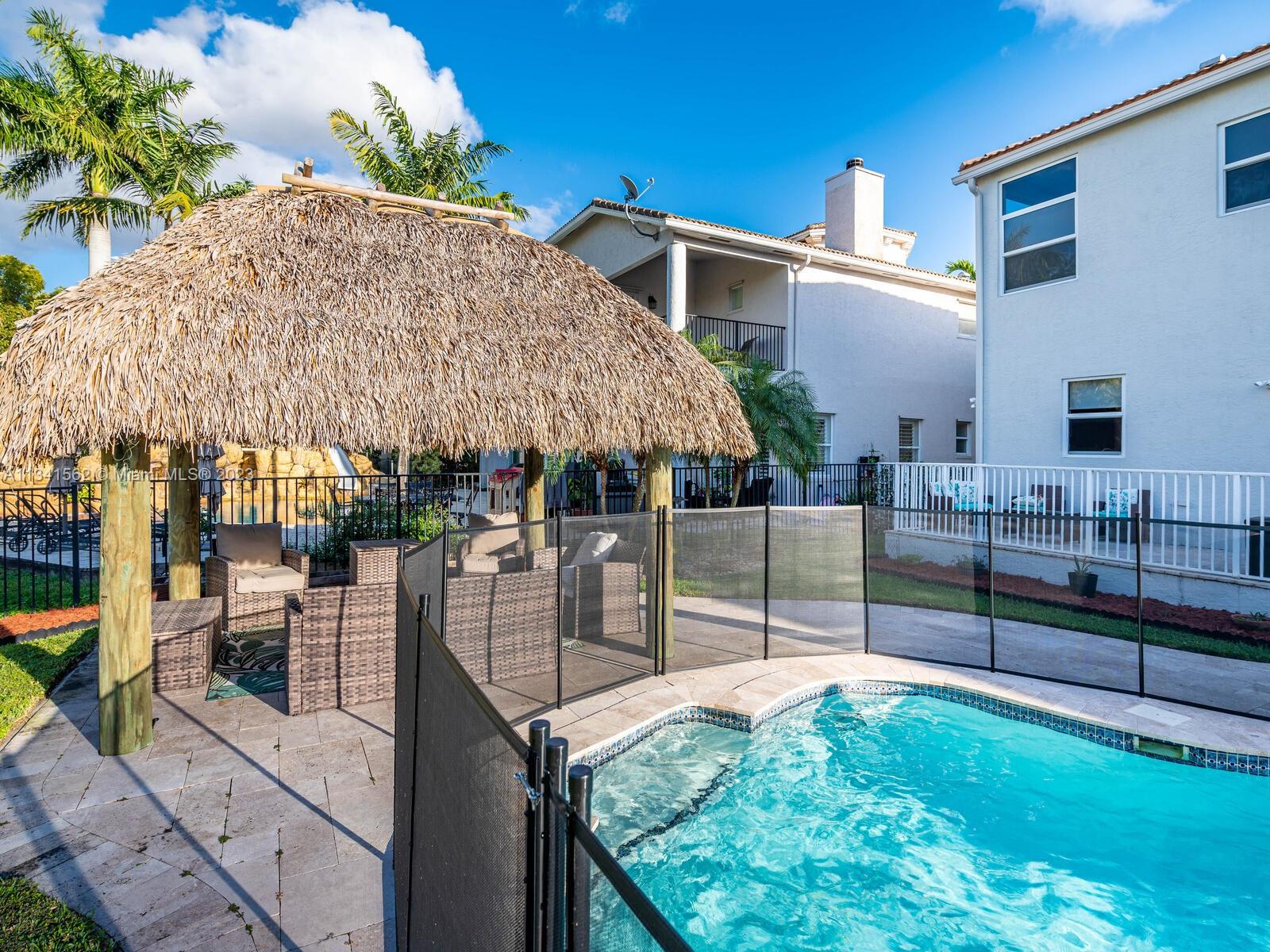 Exquisite Pembroke Pines Pool Home in the sought after community of Lido Isles. A 5/3 with one full bedroom and bath downstairs. Newer impact windows and doors too. This spacious 5/3 bath, 3 car garage sits on a lake front with Tiki Hut (Newly Thatched) for hours of entertaining and watching the sunsets. The saltwater pool was installed in 2018 and receives weekly service by a pool specialist. Fresh paint on the exterior of home. The extremely high ceiling in the foyer makes for a dramatic entrance. Tile and hard wood floors throughout. Separate formal dining room and a very spacious newly remodeled kitchen with lots of counter space and stainless-steel appliances. Your Family/Living area has double glass doors for easy viewing of the lake and pool. (Safety gate installed).