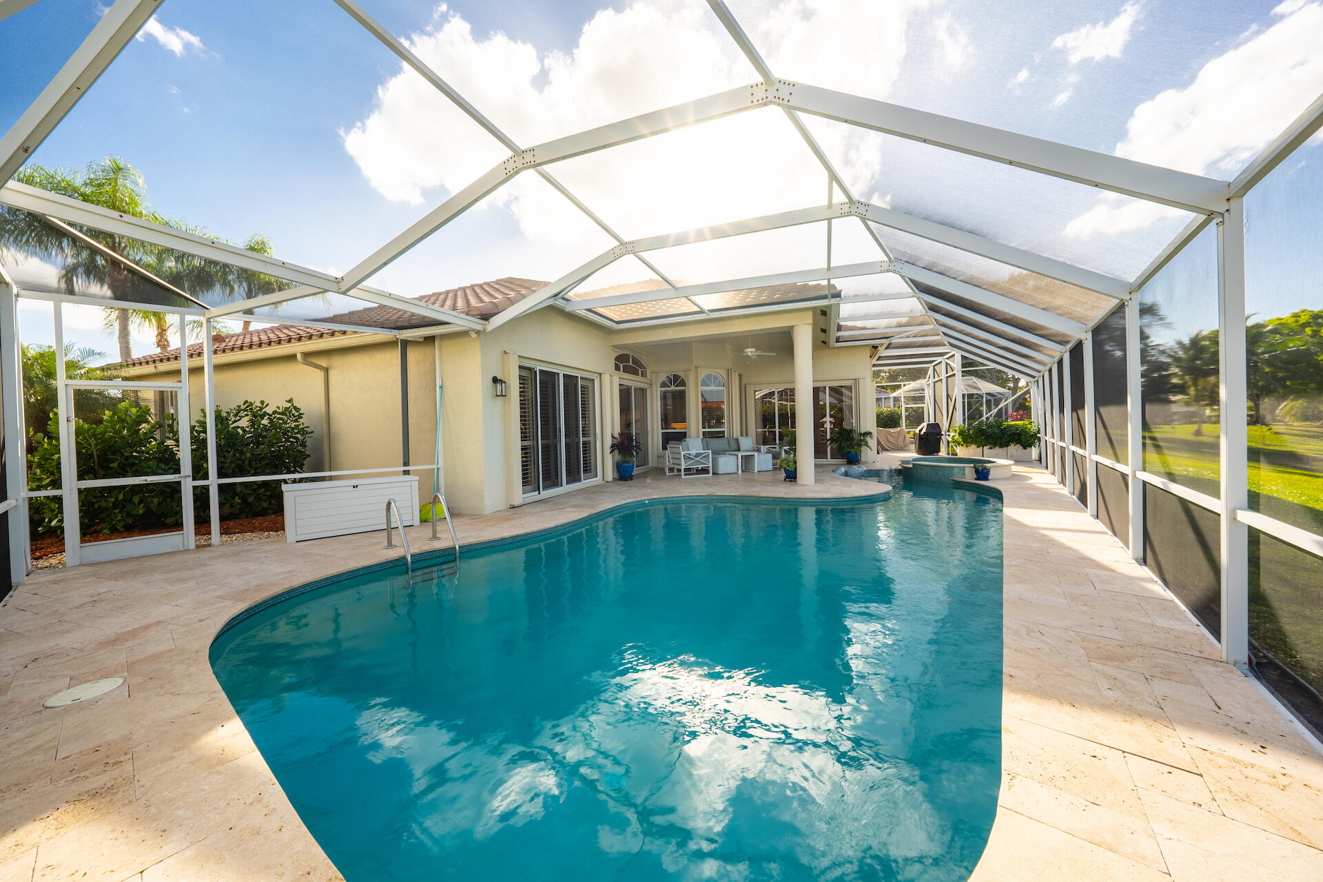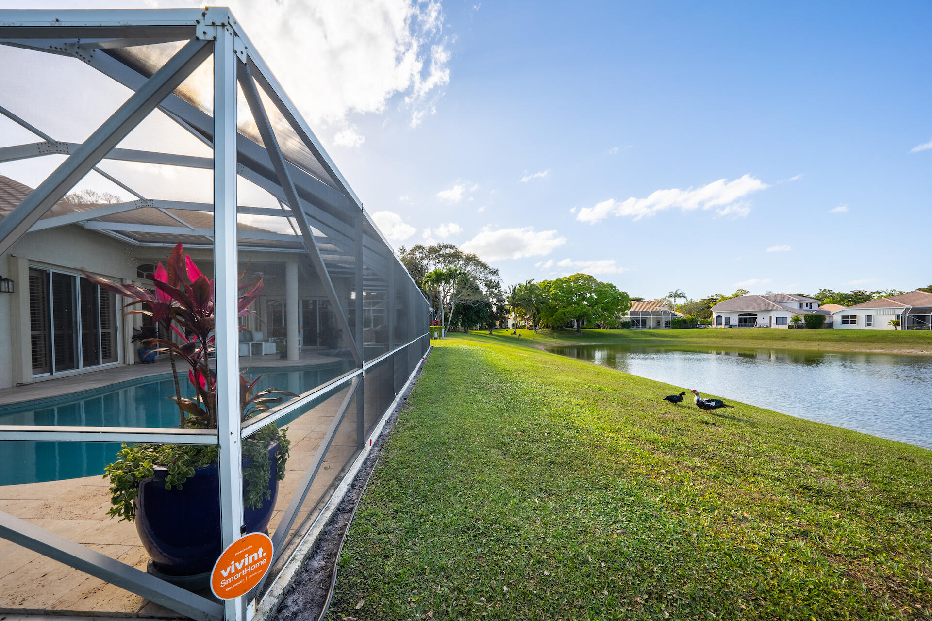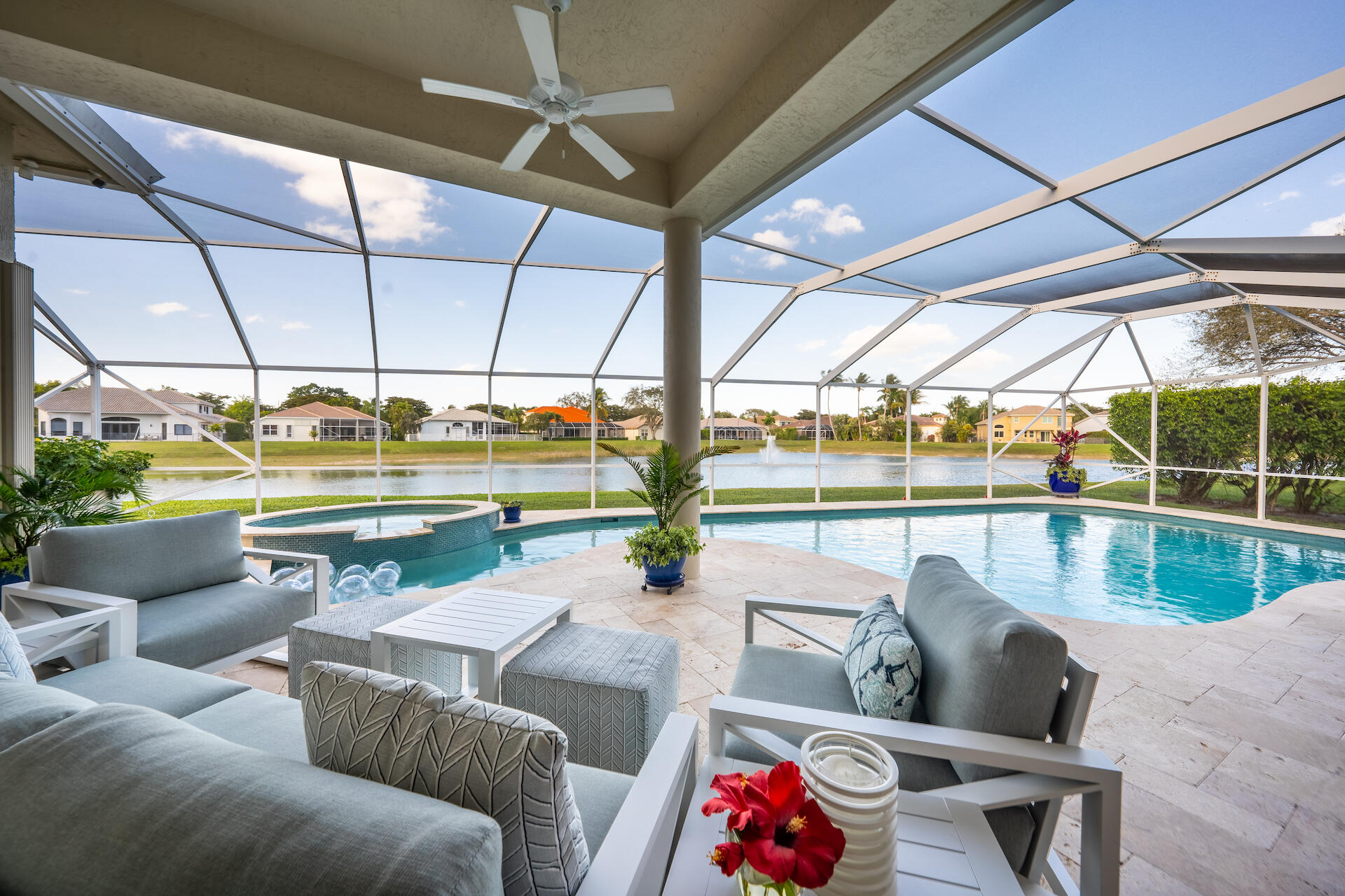 Stunning single-story pool home in exclusive Lexington Estates with breathtaking lake view. 3 bed, 2 bath, 2-car gar, 9,350+ sq.ft lot, vaulted ceiling, open floor plan, screened pool, new saltwater heated pool & spa, redone kitchen with soft-close cabinets, stainless steel appliances, updated bathrooms, master bath with dual sinks, stand-in shower, spa-tub. Hurricane shutters, large family room, full security system with phone app, generator ready. HOA includes landscaping, 24 hour security, community pool and playground. Convenient to highways, shopping, restaurants and top-rated schools.