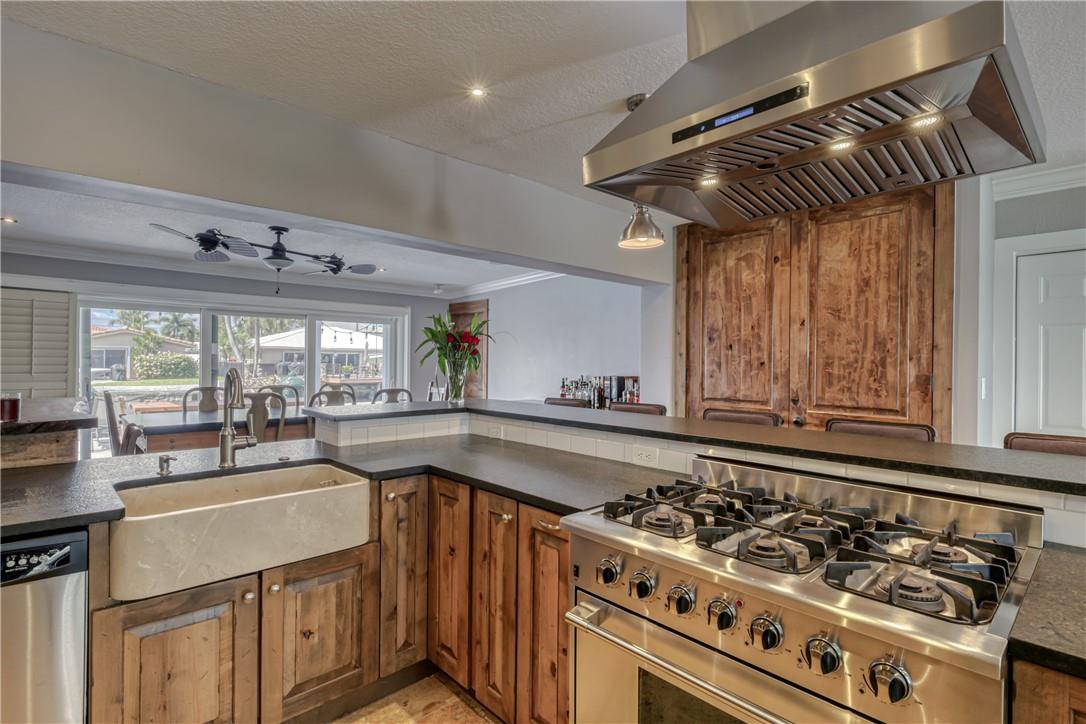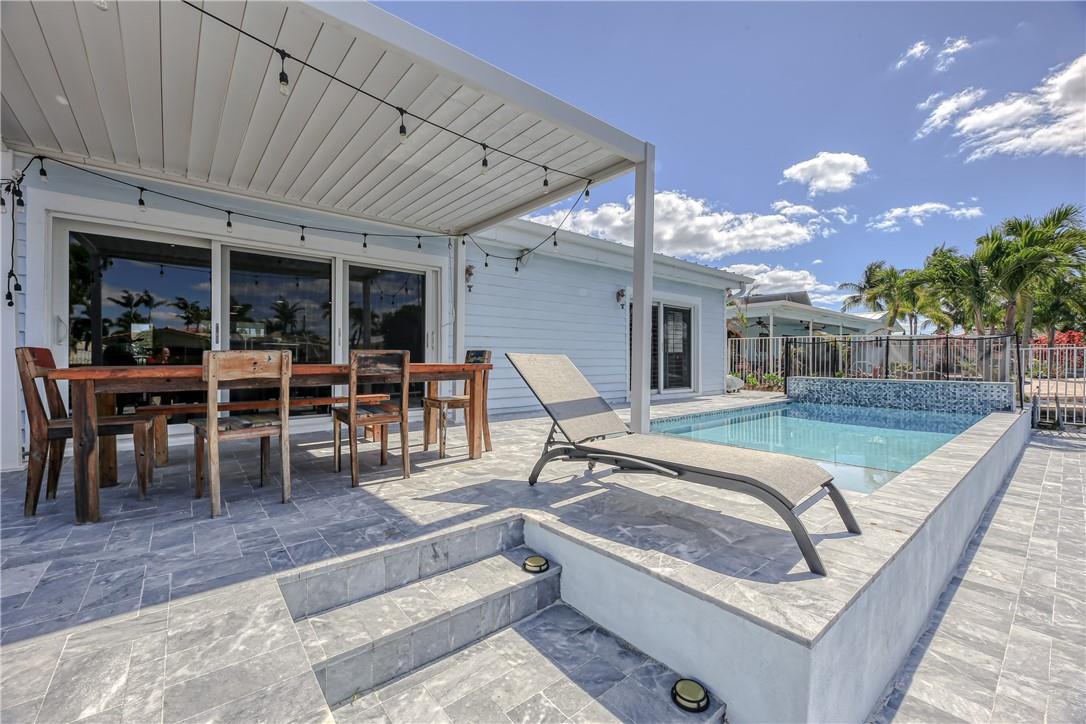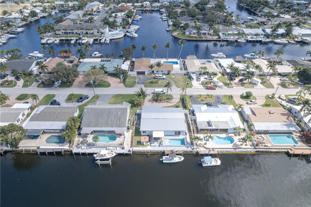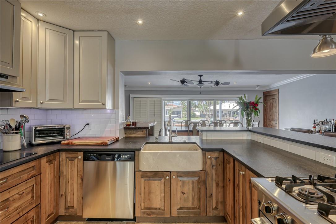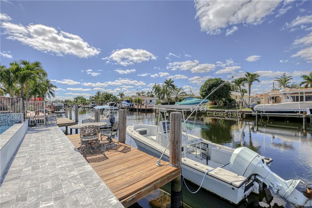 SNUG HARBOR: Situated on 70 feet of water, this home features 4 bedrooms, 2 bathrooms, 1 car garage, pool & is fully remodeled! Only 1 bridge at Federal Highway. Travertine floors throughout, recessed lighting, Plantation shutters, crown molding+++. Open kitchen has bar seating for 6, stainless appliances, leathered granite, built in pantry, 6 burner gas stove & more! Multiple living areas including dining & family room offer great space & wonderful water views. Spacious master w/ walk in closet, sliders to the pool, large shower & double vanity. Fenced yard, custom pergola, large covered patio, heated salt pool. Fully upgraded w/ impact windows & doors, upgraded electrical, metal roof 2022, AC 2022. All ages, no HOA, rentals OK. Enjoy waterfront living at its finest!