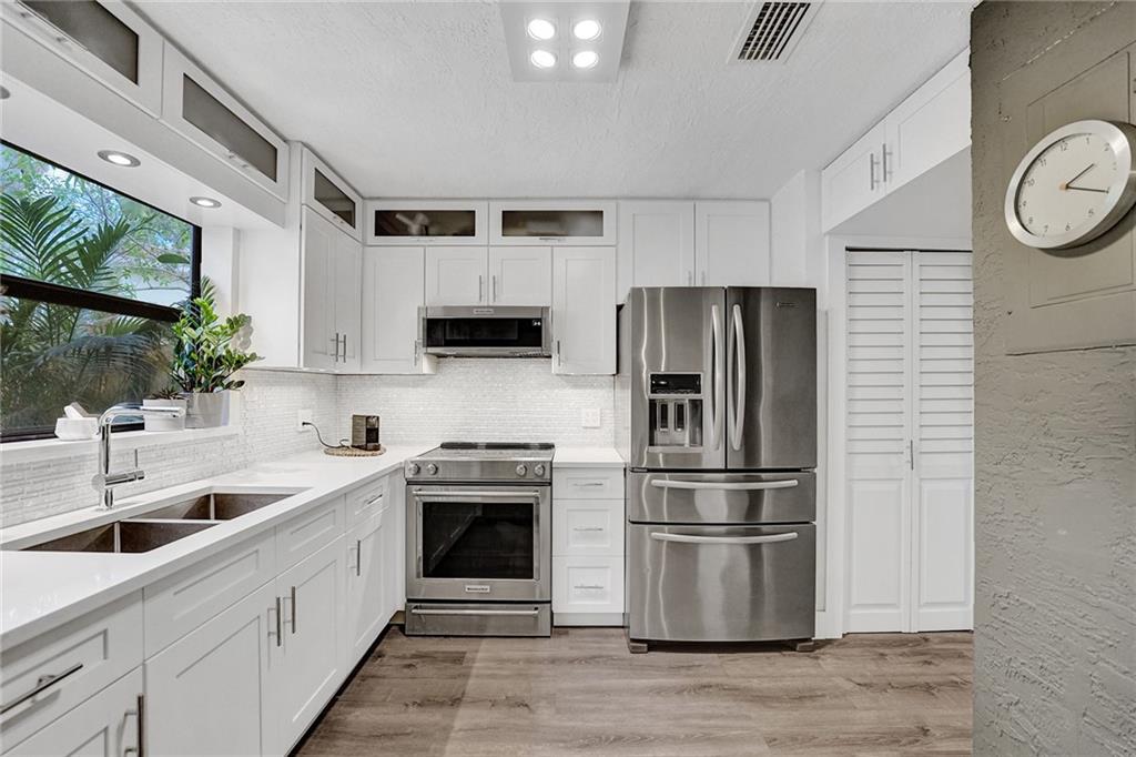 Rarely available! 3/2 corner, fee-simple townhouse is nestled adjacent to the Golf Course Community of Jacaranda CC! The moment you arrive you are taken by lush landscaping! Inside this bright home, prepare to be wow'd by all the upgrades! New flooring,lighting & doors! A gorgeous chef kitchen boasts top of the line stainless appliances! Waterfall edge premium quartz counter tops! Bar stool seating! The perfect space for entertaining, as this all opens to a lavish covered, fenced private backyard garden! Outdoor grilling area w/gas grill & more! Remodeled bathrooms! Impact windows protected by according shutters! The 2nd floor & stairs are bamboo! Built-ins in every closet! Additional insulation added to reduce electric bill! Newer roof & A/C! The list goes on! Just bring your toothbrush!