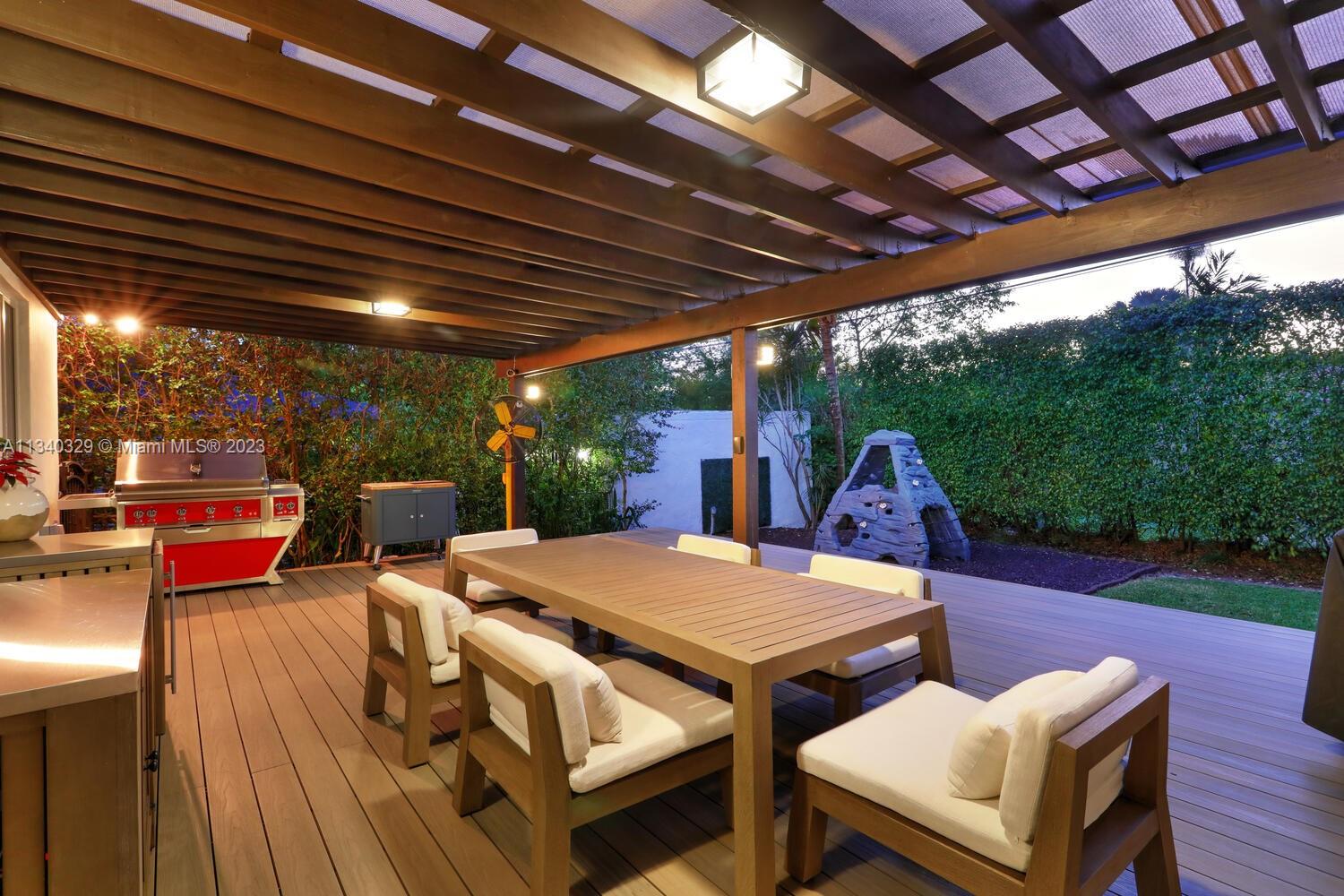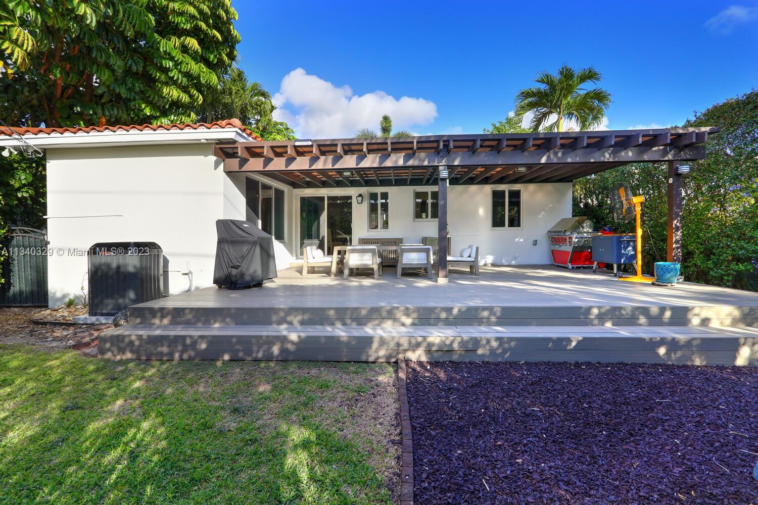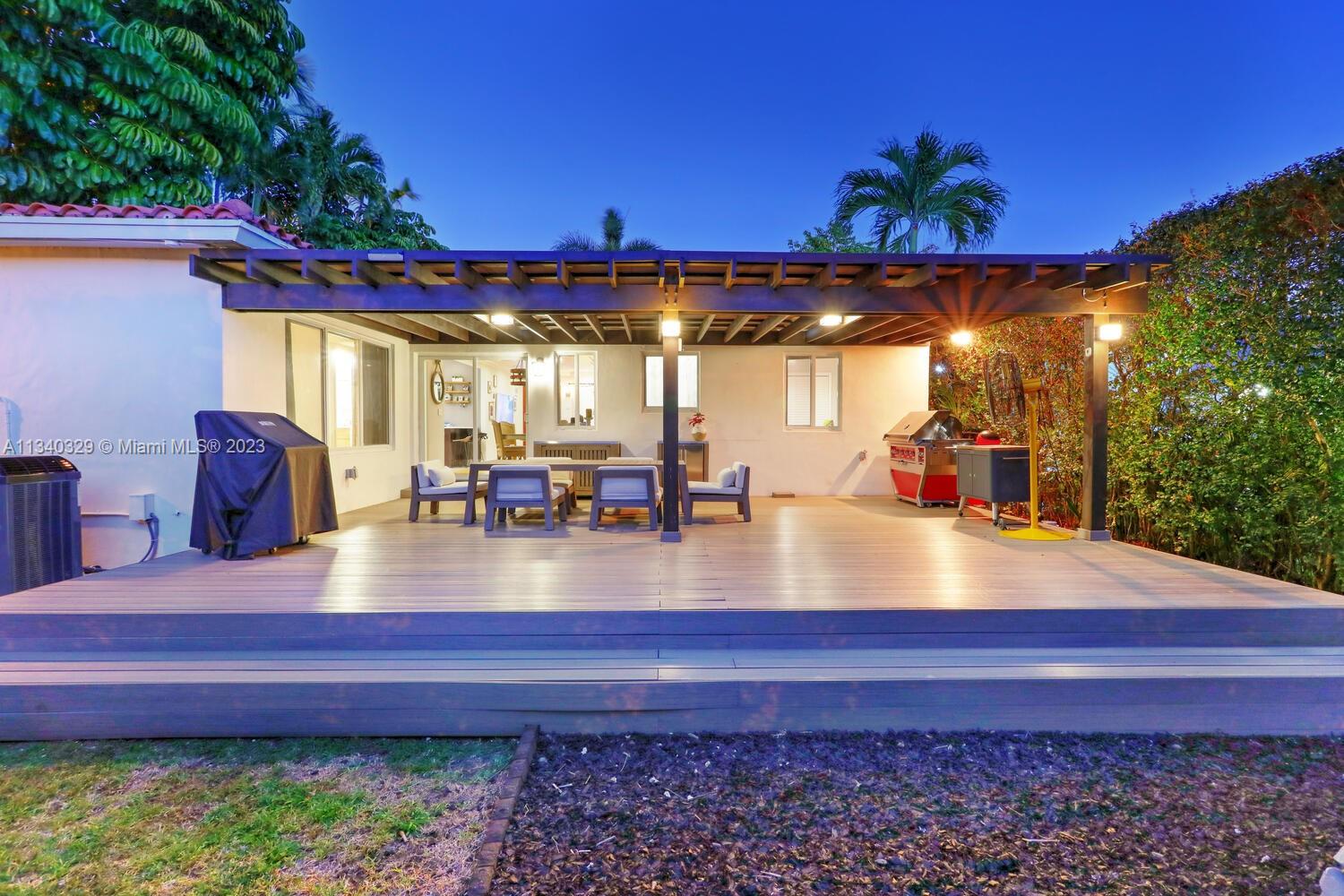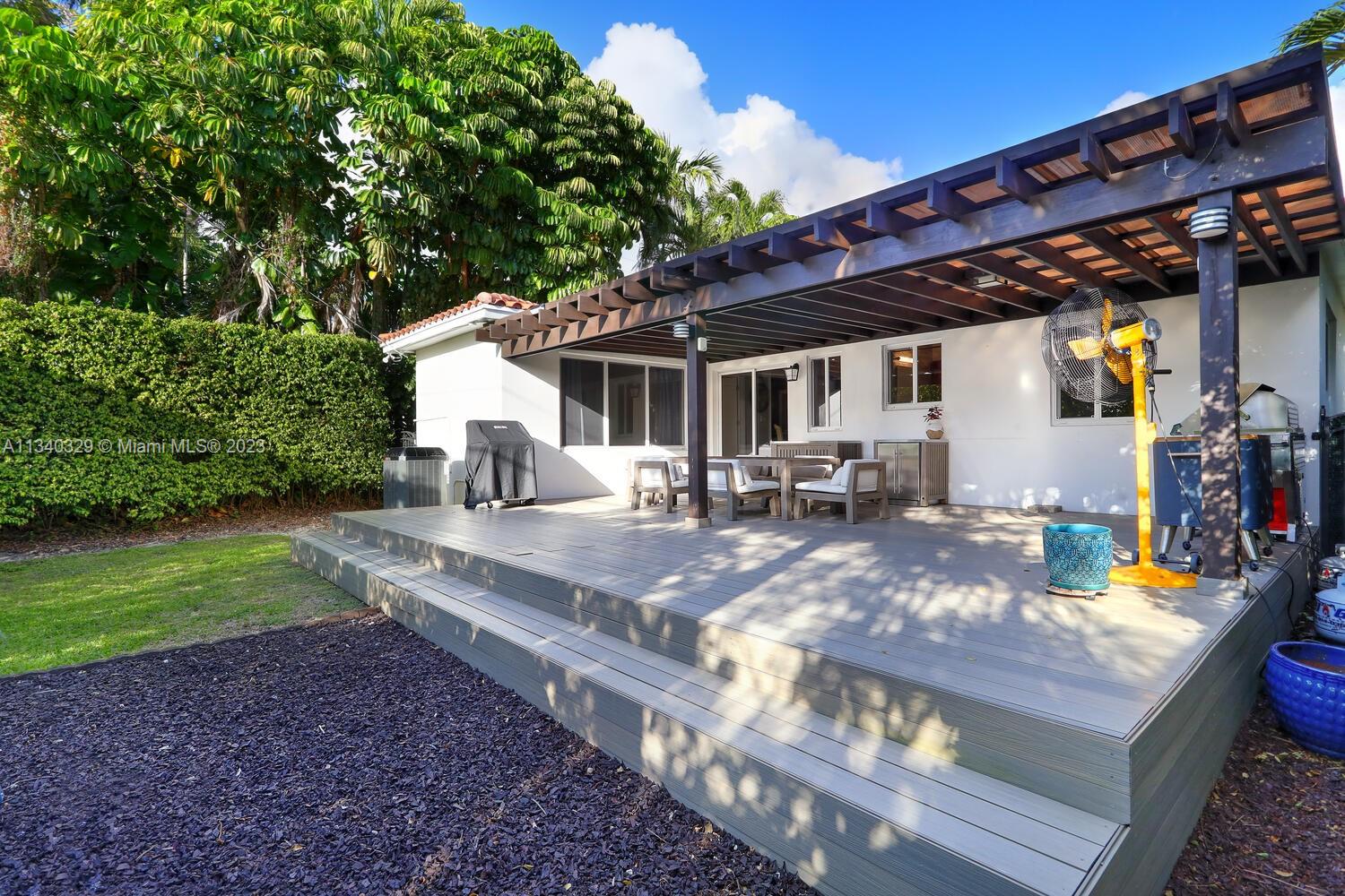 This stunning home in Coral Gables has undergone a modern renovation, making it an ideal choice for discerning buyers. The property includes 3 bedrooms & 2 bathrooms, & is located on a peaceful cul-de-sac. The interior features a recently updated kitchen & bathrooms, as well as hardwood & tile floors, hurricane impact windows, & a 2022 Trane A/C unit equipped with smart sensors, controls & UV light air purifier. In addition to a new electrical panel & tankless water heater, the home comes with brand new appliances, including a washer & dryer. The property's beautiful landscaping in the front & back yards adds to the sophisticated appeal, with the backyard featuring a new pergola & outdoor deck fitted with smart lights, which expands the outdoor living space by an additional 700 sqft.